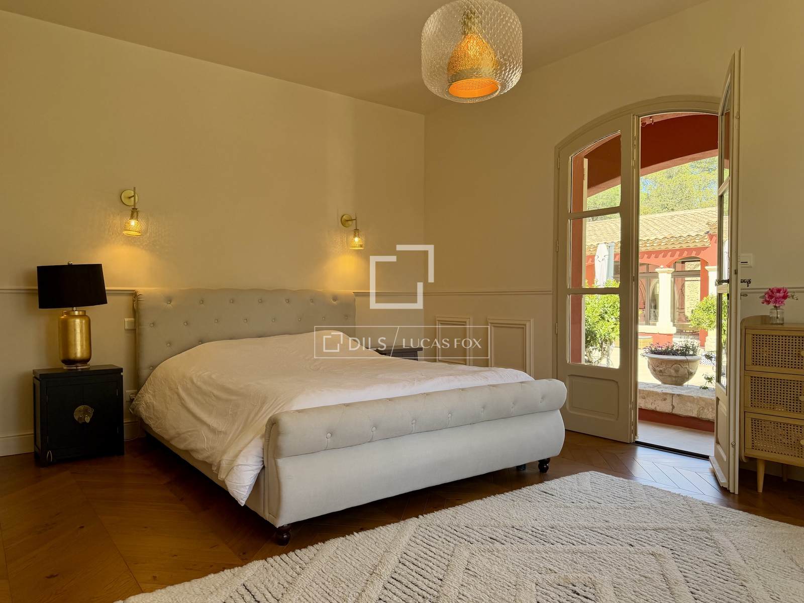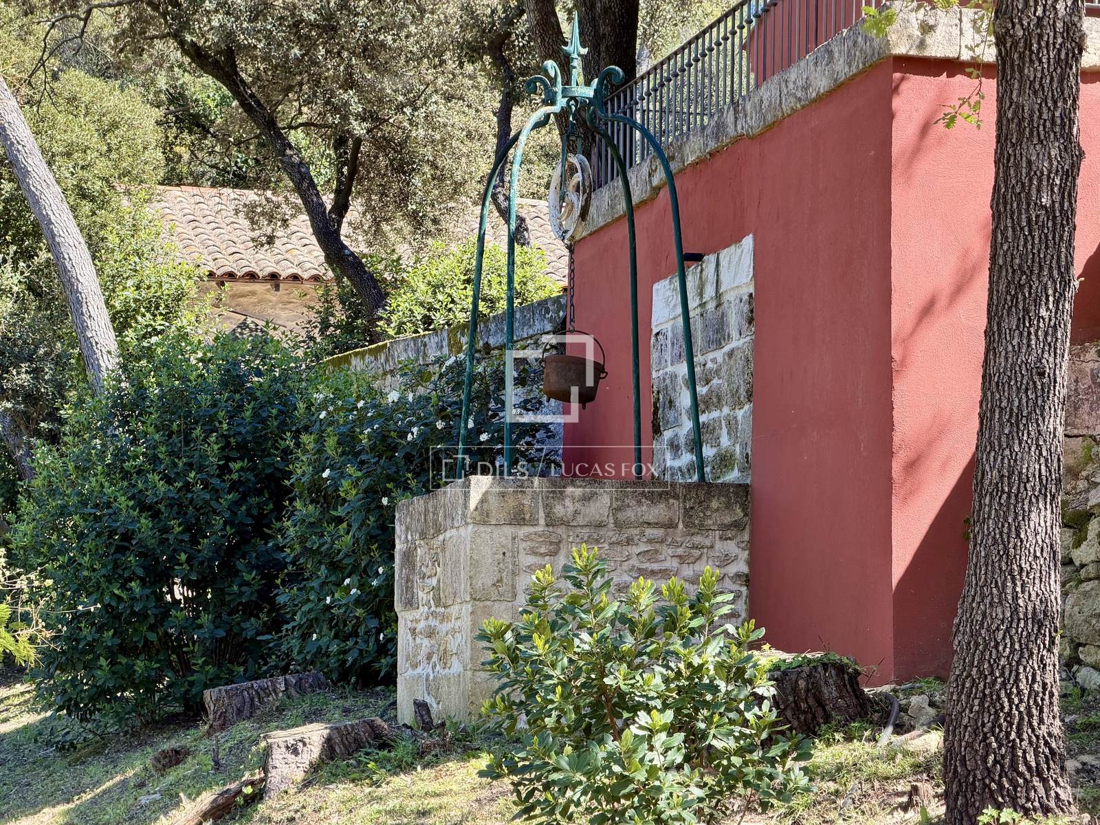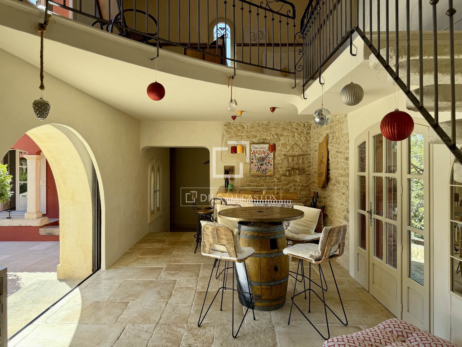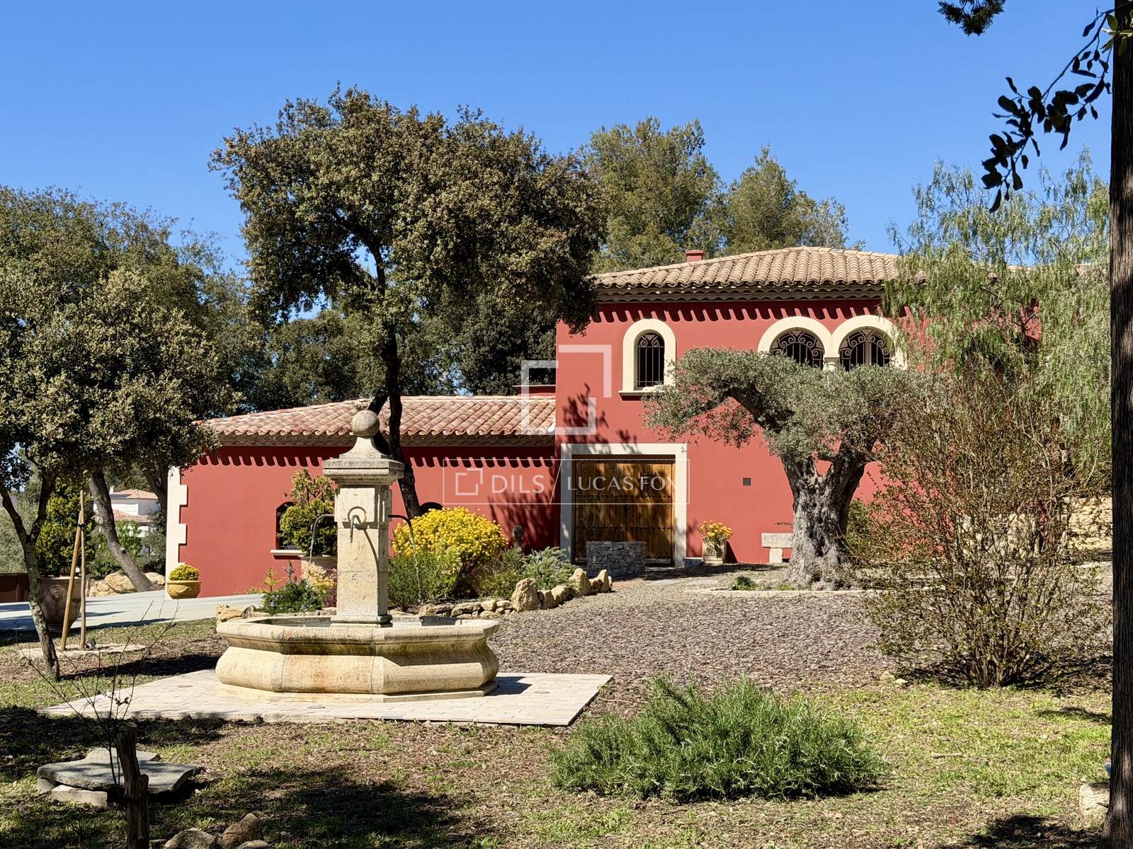 Das Anwesen erstreckt sich komplett über eine Ebene und umfasst: eine Eingangshalle, ein Wohn- und Esszimmer mit doppelter Deckenhöhe und sichtbaren Holzbalken, einen Weinkeller, ein Büro, eine Küche mit Essbereich und Speisekammer sowie eine Waschküche. Der elegante Schlafbereich beinhaltet fünf Schlafzimmer, darunter eine Master-Suite mit Doppelbad.