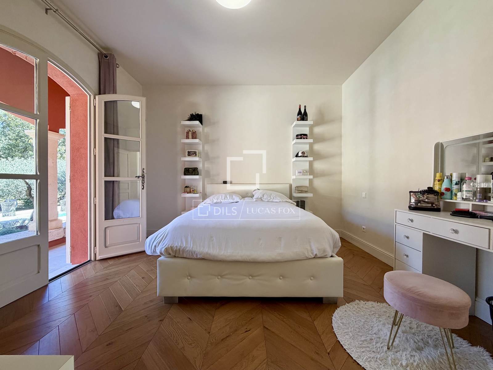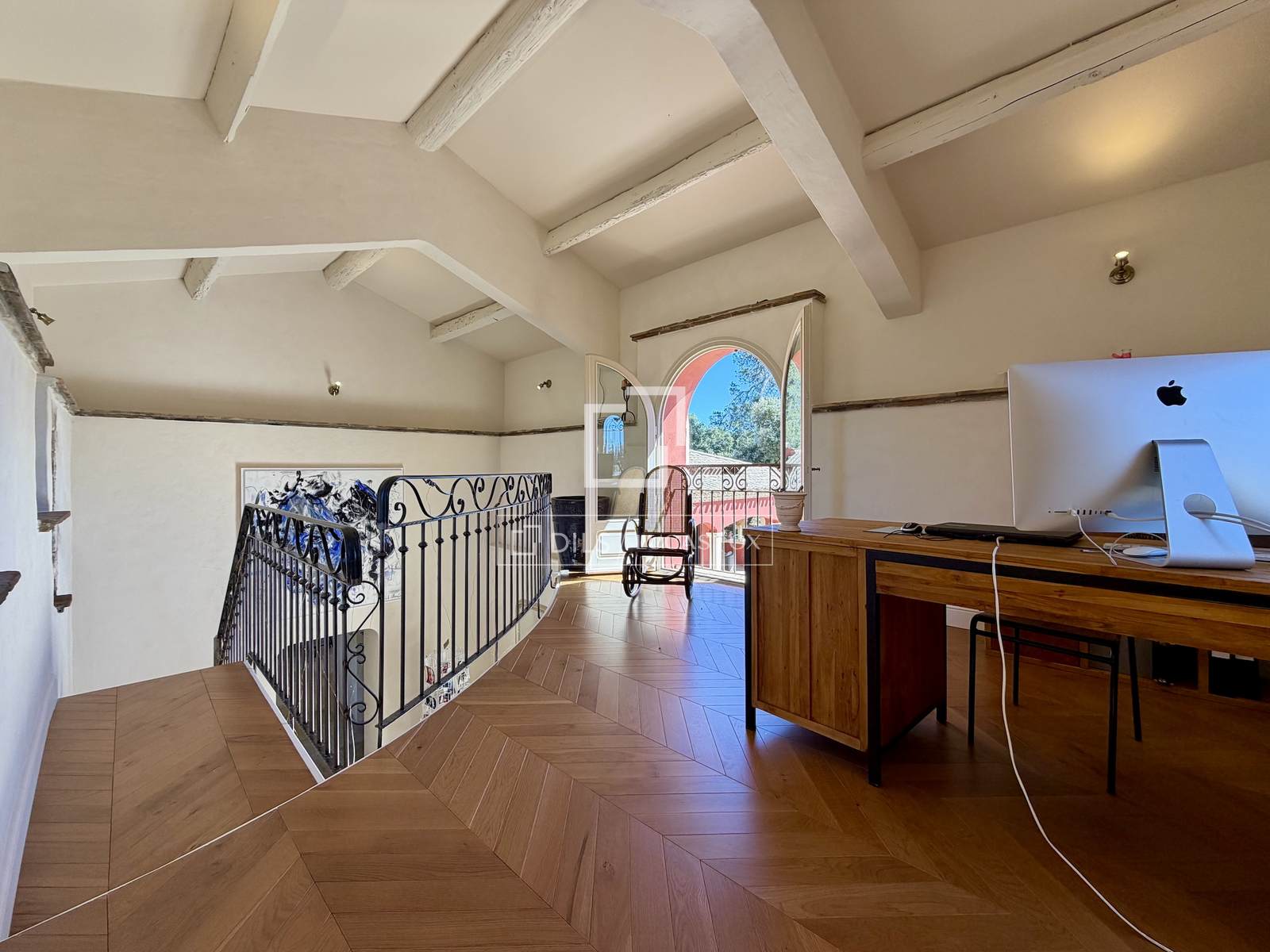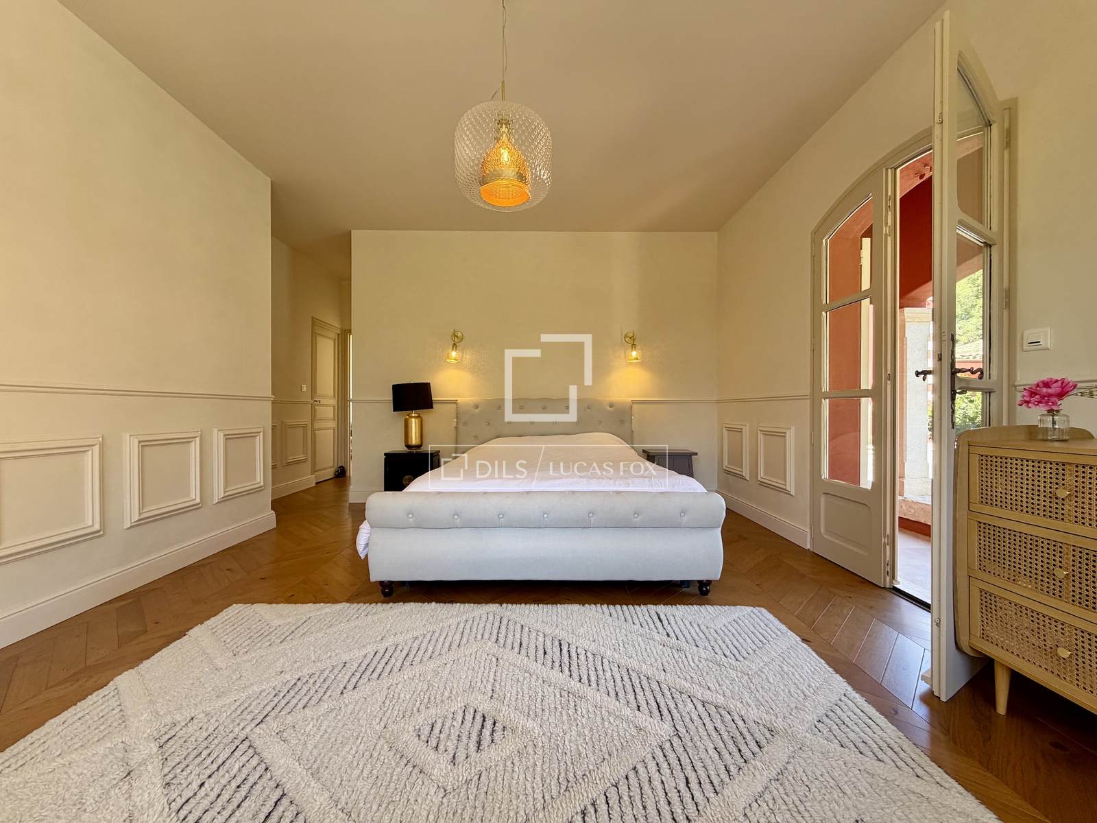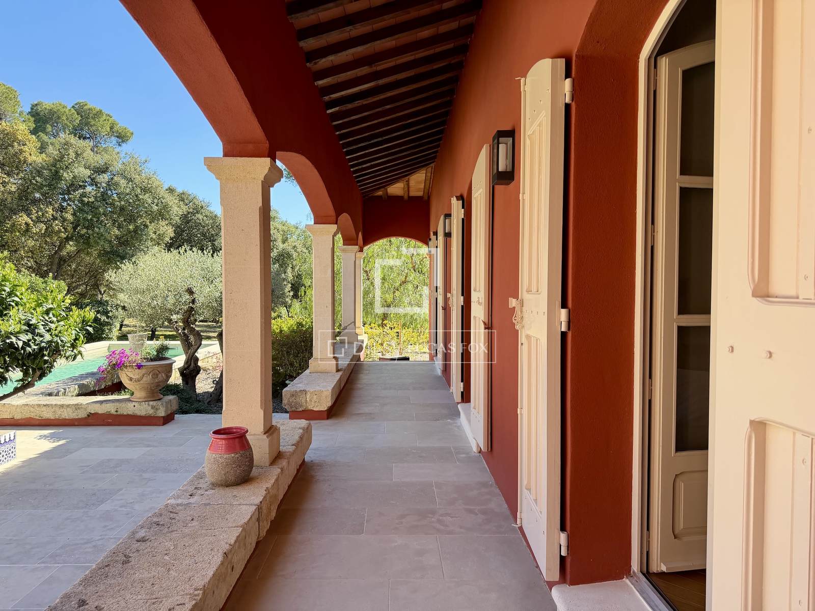 Das Anwesen erstreckt sich komplett über eine Ebene und umfasst: eine Eingangshalle, ein Wohn- und Esszimmer mit doppelter Deckenhöhe und sichtbaren Holzbalken, einen Weinkeller, ein Büro, eine Küche mit Essbereich und Speisekammer sowie eine Waschküche. Der elegante Schlafbereich beinhaltet fünf Schlafzimmer, darunter eine Master-Suite mit Doppelbad.