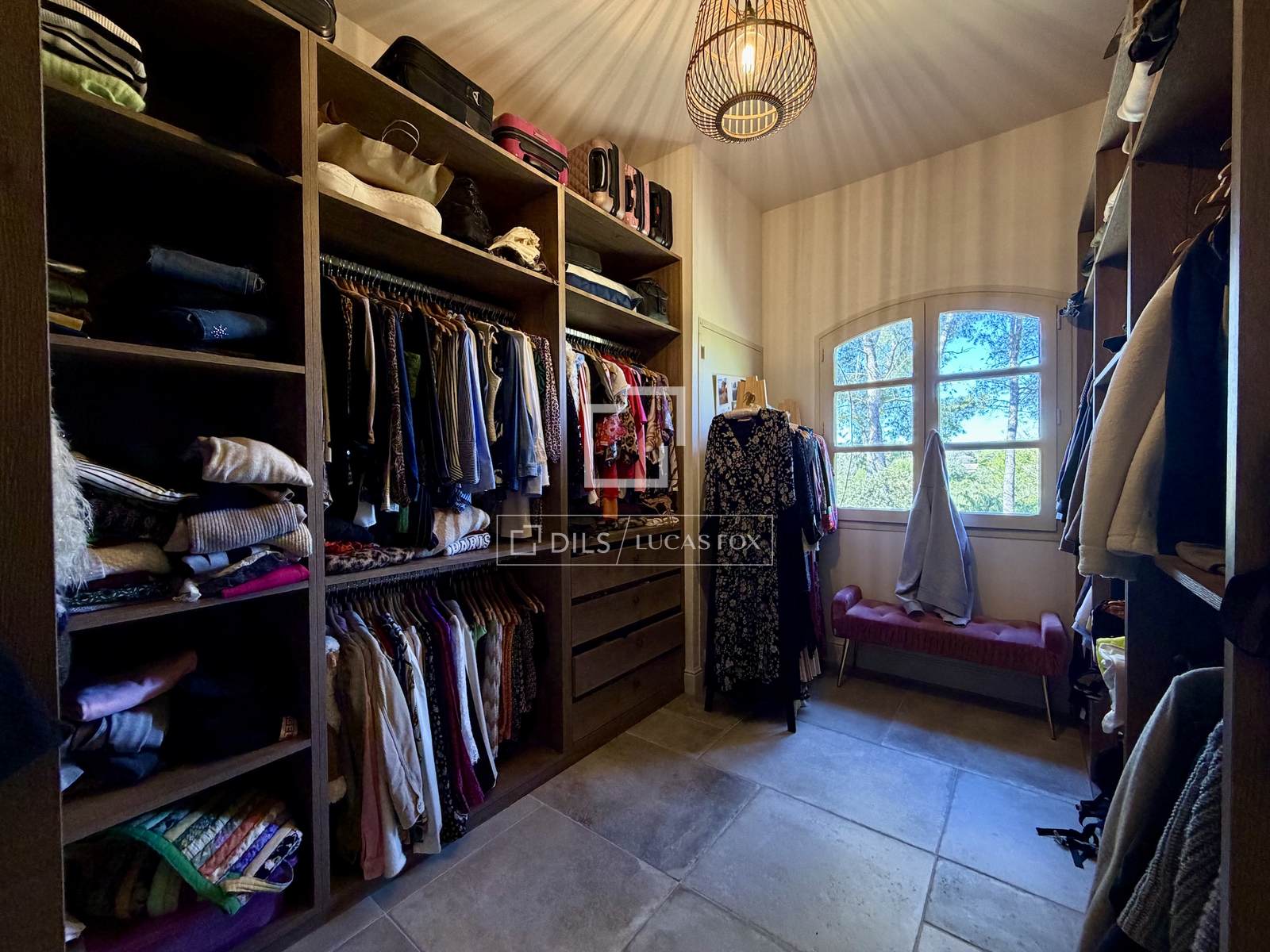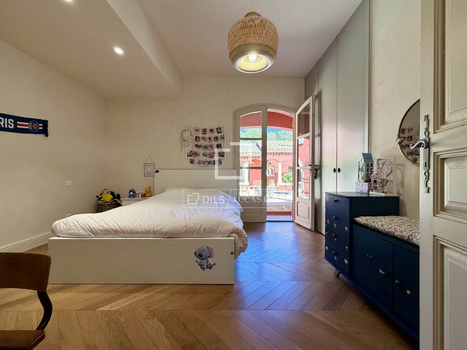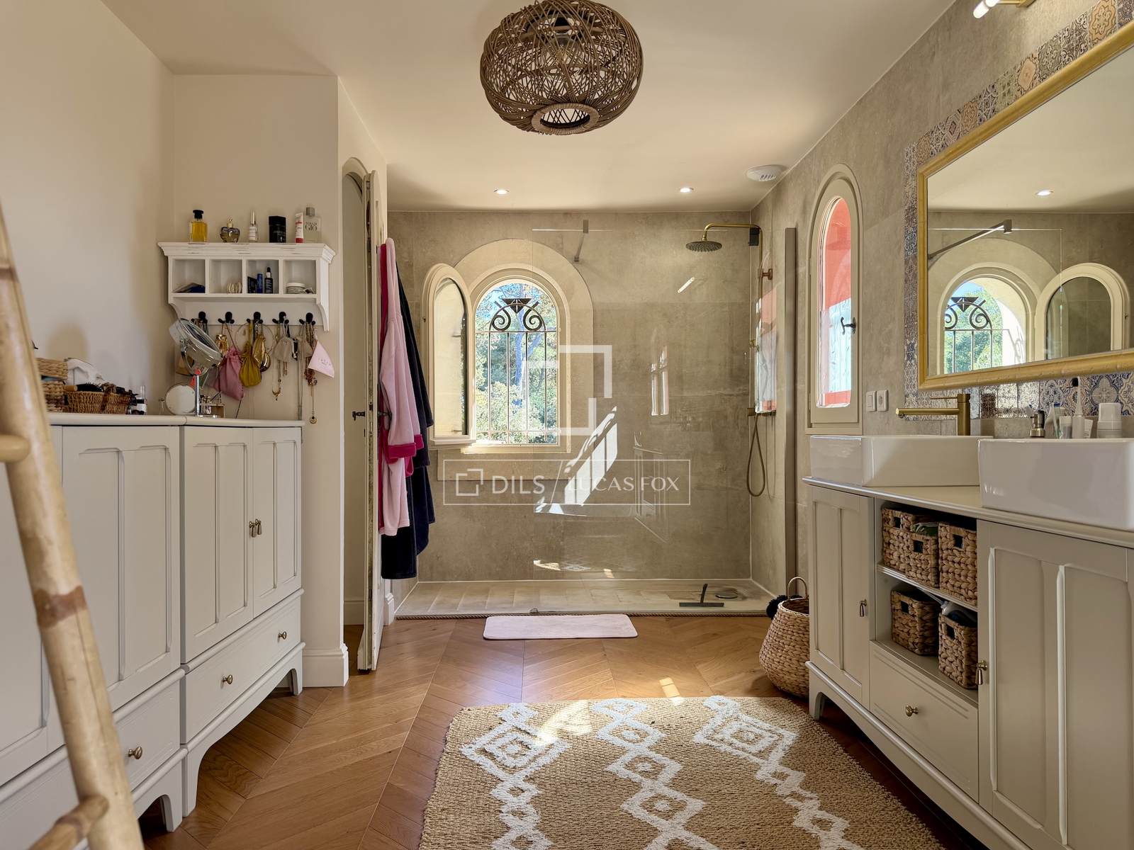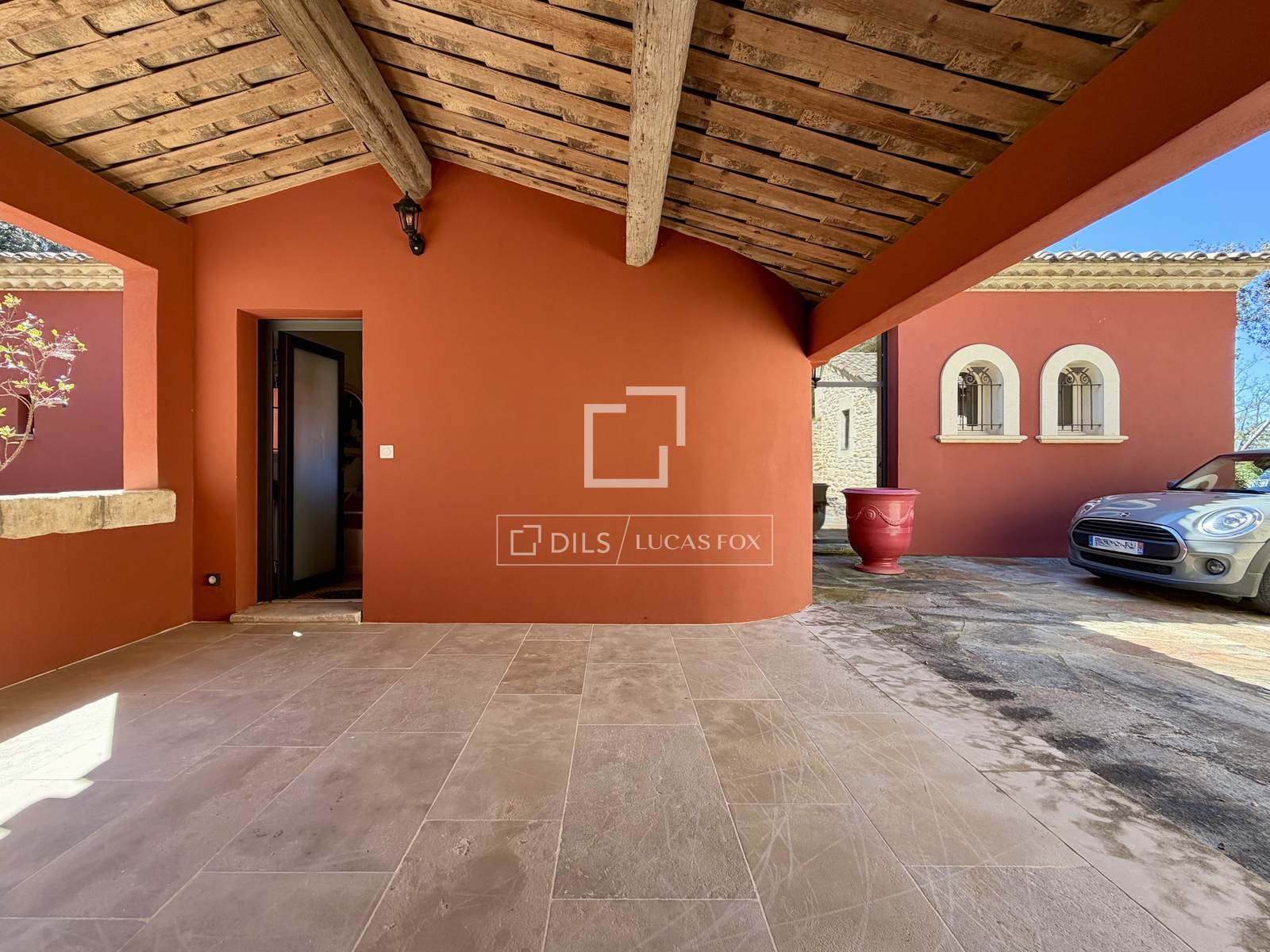 Das Anwesen erstreckt sich komplett über eine Ebene und umfasst: eine Eingangshalle, ein Wohn- und Esszimmer mit doppelter Deckenhöhe und sichtbaren Holzbalken, einen Weinkeller, ein Büro, eine Küche mit Essbereich und Speisekammer sowie eine Waschküche. Der elegante Schlafbereich beinhaltet fünf Schlafzimmer, darunter eine Master-Suite mit Doppelbad.