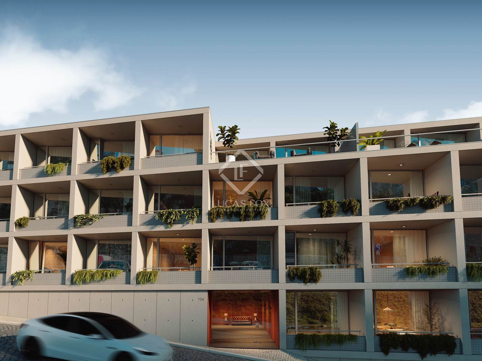 Das von Architekt José Gigante entworfene Projekt umfasst 108 moderne Wohnungen, verteilt auf 7 Etagen, sowie Gärten, eine Lounge mit Grillmöglichkeit und private Parkplätze.