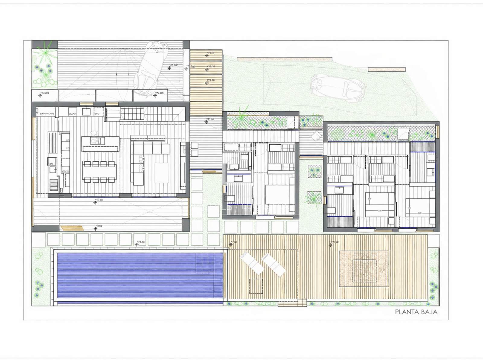 Der rechteckige Pool mit den Maßen 11,65 x 3,00 m, der in Ost-West-Richtung ausgerichtet ist, ist in einen Holzstrandbereich integriert, der sich entlang der Südfassade erstreckt und allen Gebäudeteilen zur Verfügung steht.