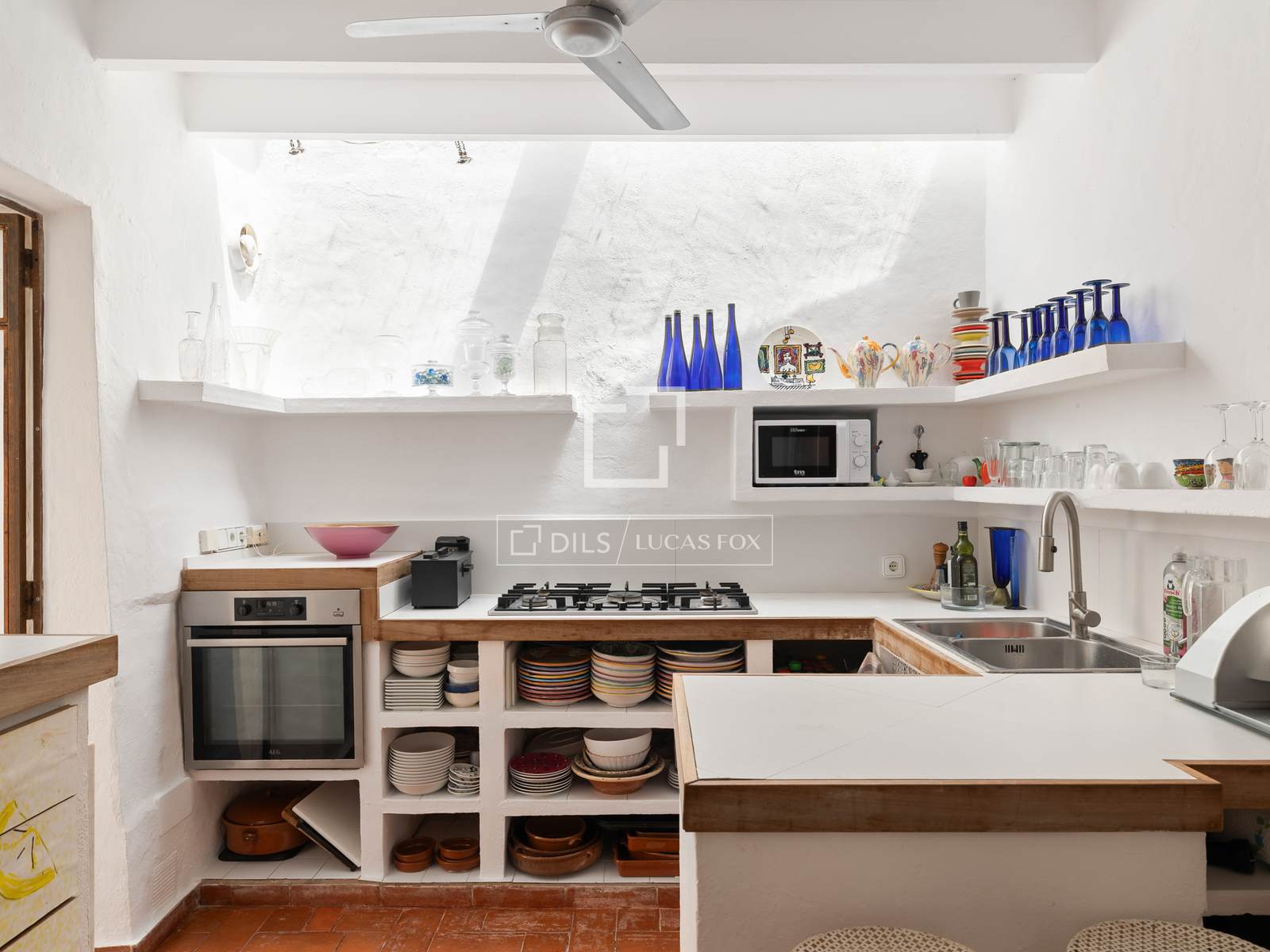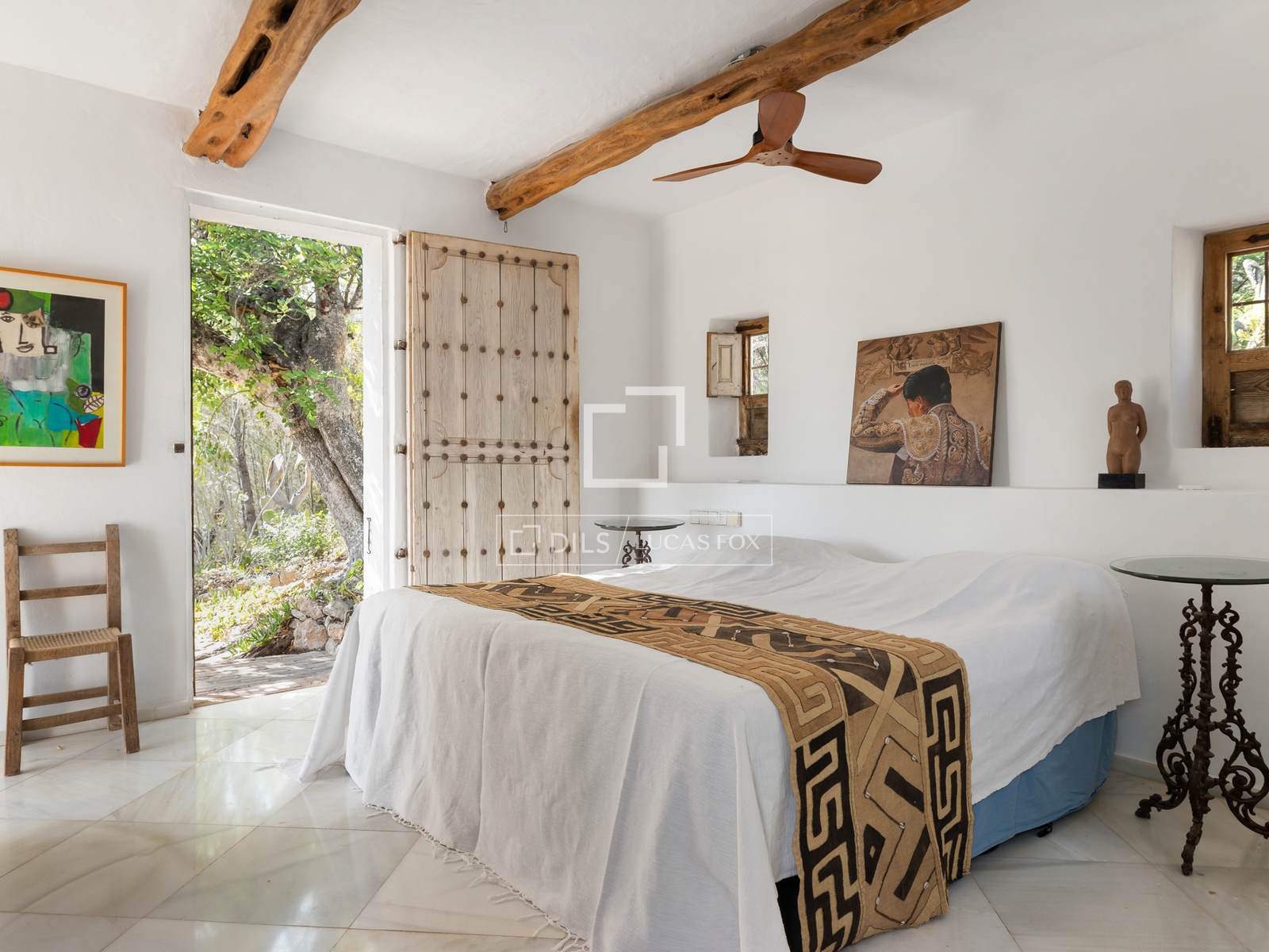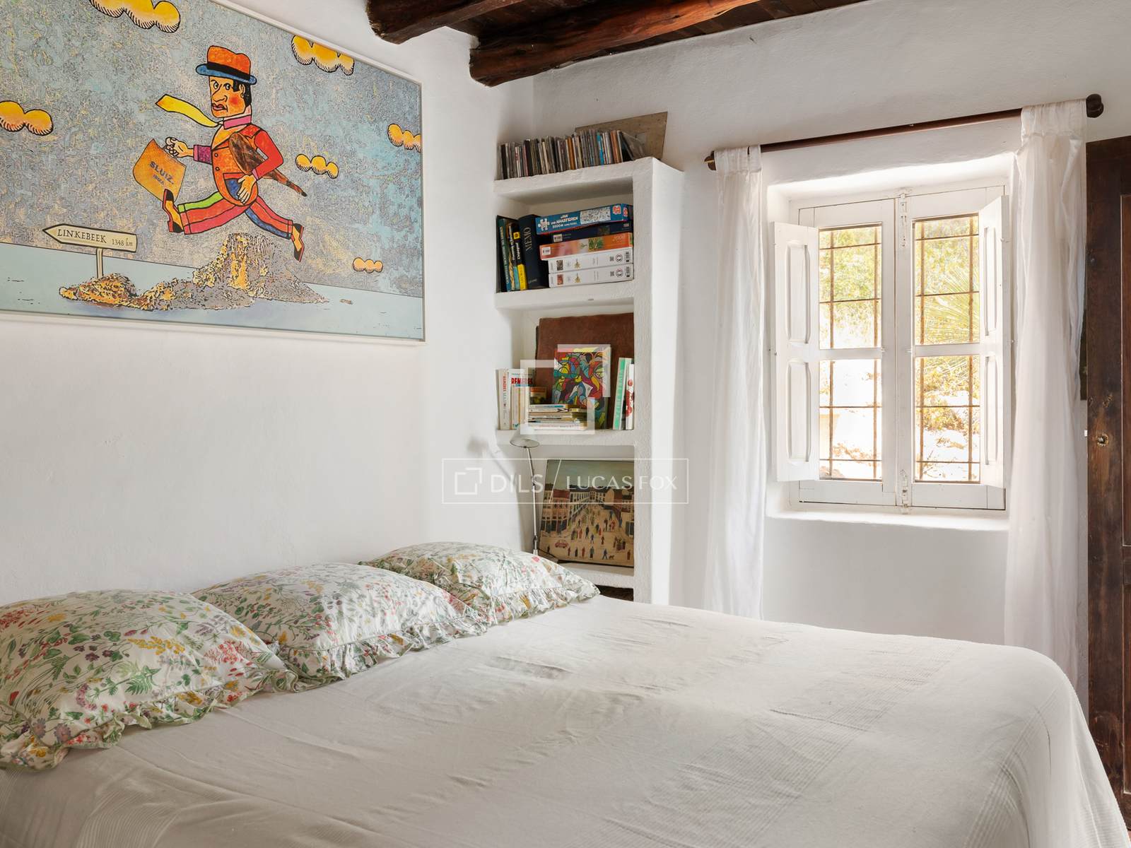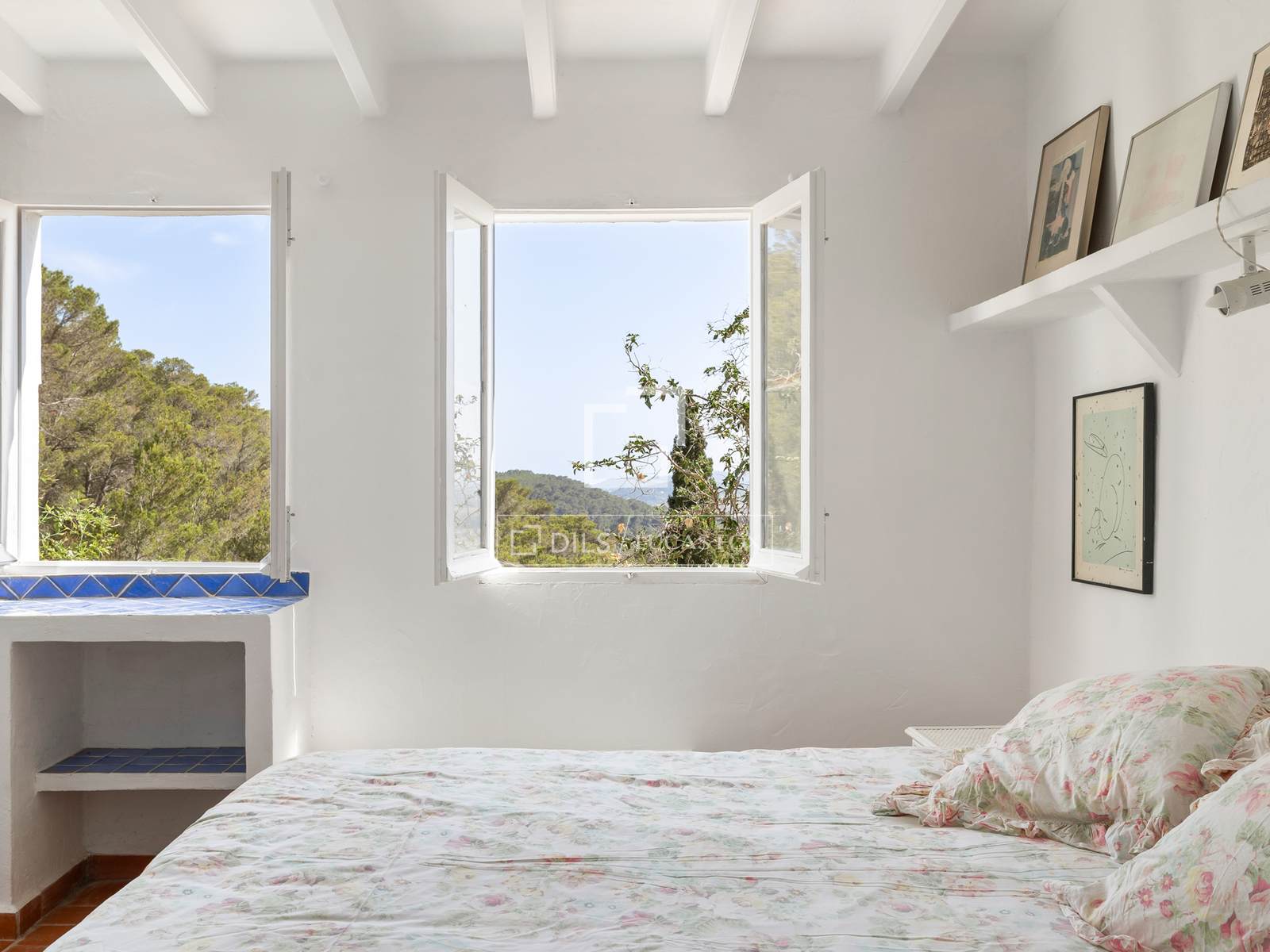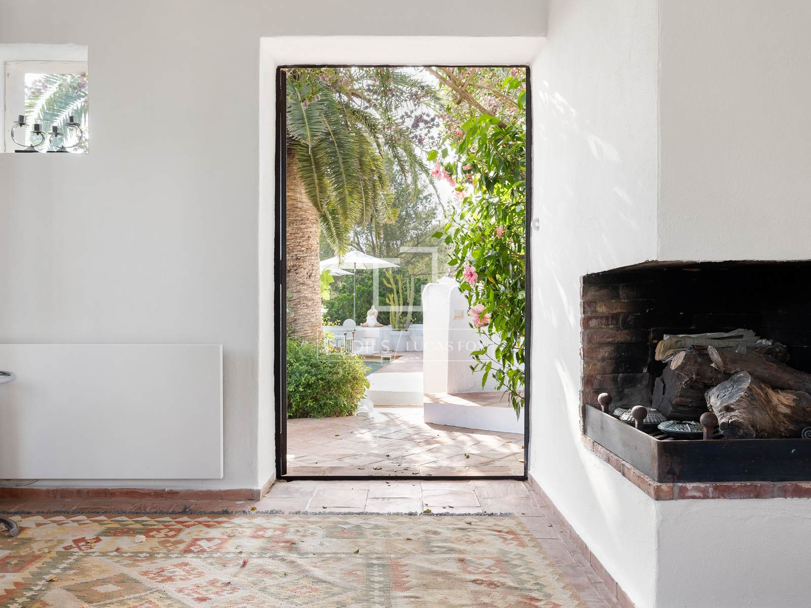 Das Haus ist um eine traditionelle ibizenkische Sala herum angelegt, das Herzstück des Anwesens. Sie verbindet die wichtigsten Wohnräume und spiegelt den authentischen architektonischen Charakter der Insel wider. Küche und Frühstücksbereich befinden sich direkt hinter der Eingangshalle, während das einladende Wohnzimmer mit offenem Kamin direkten Zugang zu den Terrassen, dem Garten und dem Poolbereich bietet. Große Fenster im ganzen Haus lassen viel Tageslicht herein und schaffen eine warme, behagliche Atmosphäre.