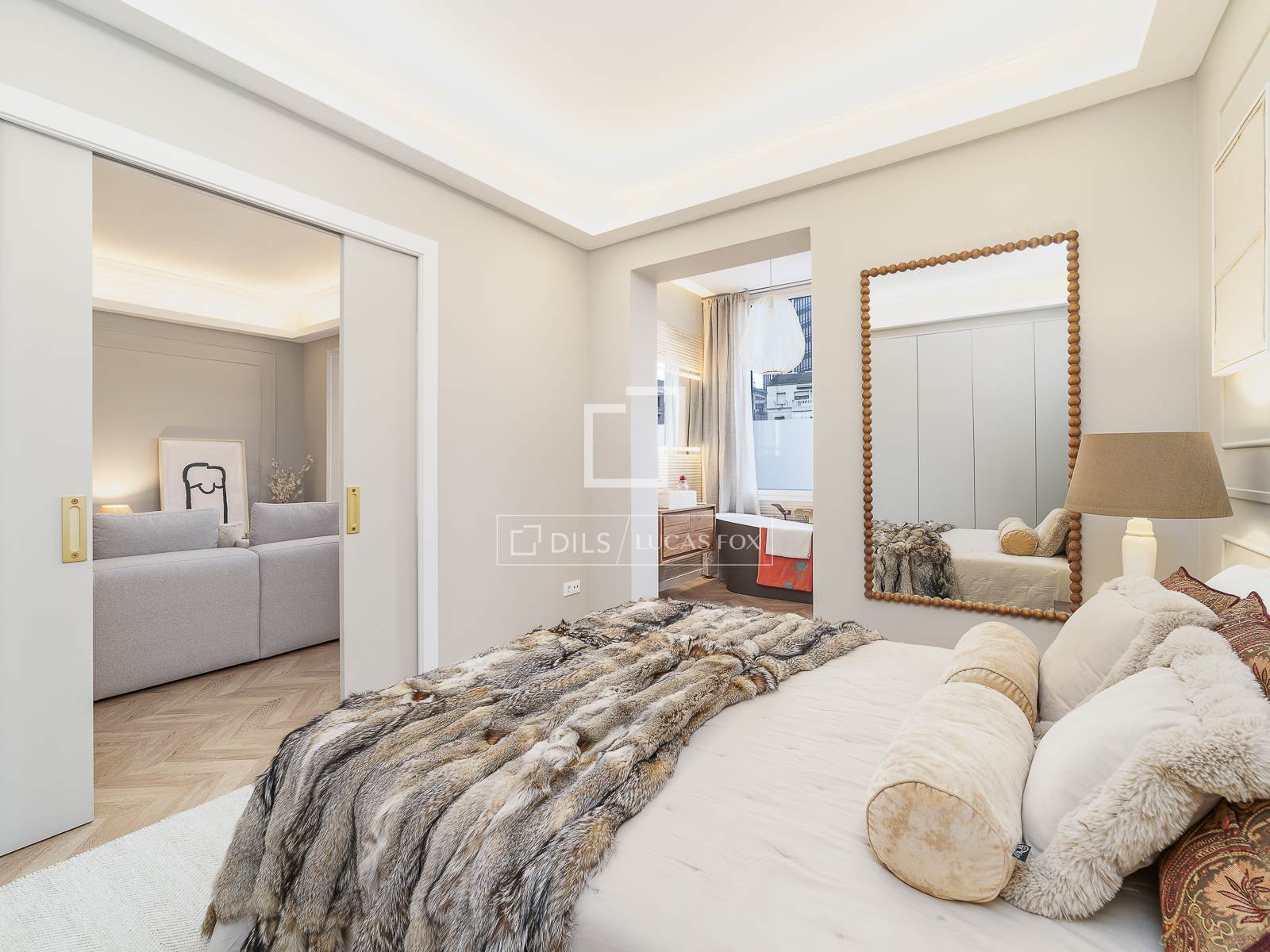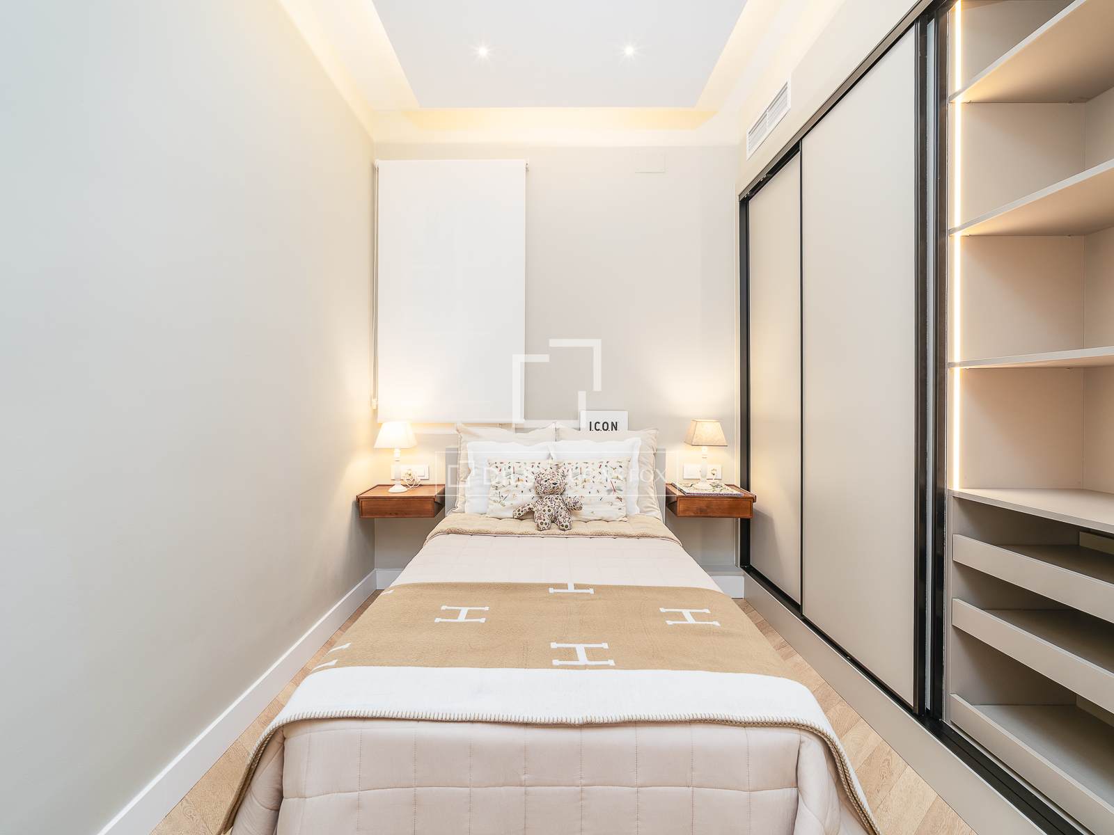Beim Betreten der Wohnung gelangt man durch ein Foyer in einen einzelnen Raum, der sich ideal als Büro oder Gästezimmer eignet. Dahinter befindet sich der großzügige, offene Wohn- und Essbereich mit Küche und freiem Blick auf den Innenhof. Angrenzend an den Wohnbereich, durch Schiebetüren abgetrennt, liegt die Master-Suite mit Einbauschränken und eigenem Badezimmer. Ein kleiner Flur gegenüber der Küche führt zu einem zweiten Doppelschlafzimmer und einem zweiten Badezimmer.