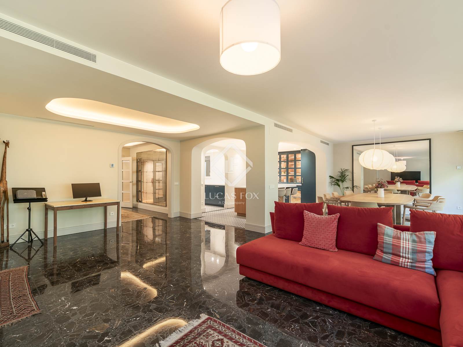 Beim Betreten des Anwesens empfängt uns eine geräumige und einladende Eingangshalle, die zu einem sehr hellen, großzügig geschnittenen Wohn-Esszimmer mit einer geschmackvoll renovierten, offenen Küche führt, die komplett ausgestattet ist und über einen direkten Zugang zu einem Balkon verfügt.