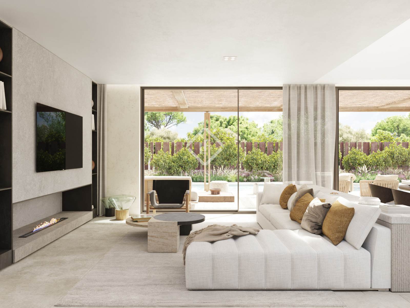 Im Inneren bietet das Haus offene und einladende Räume. Die Architektur zeichnet sich durch eine funktionale Aufteilung über drei Etagen aus, die Tag- und Nachtbereiche klar voneinander trennt und so für mehr Privatsphäre sorgt. Im Untergeschoss befinden sich die Garage und ein Mehrzweckraum, der in ein Fitnessstudio, ein Spa oder einen Freizeitbereich umgewandelt werden kann. Das Erdgeschoss bietet einen offenen Bereich mit Wohn-Esszimmer und Küche und Zugang zum privaten Garten, Pool und Chill-out-Bereich. Dieser Raum profitiert von reichlich natürlichem Licht. Das Obergeschoss ist dem Schlafbereich vorbehalten und bietet mehr Privatsphäre.