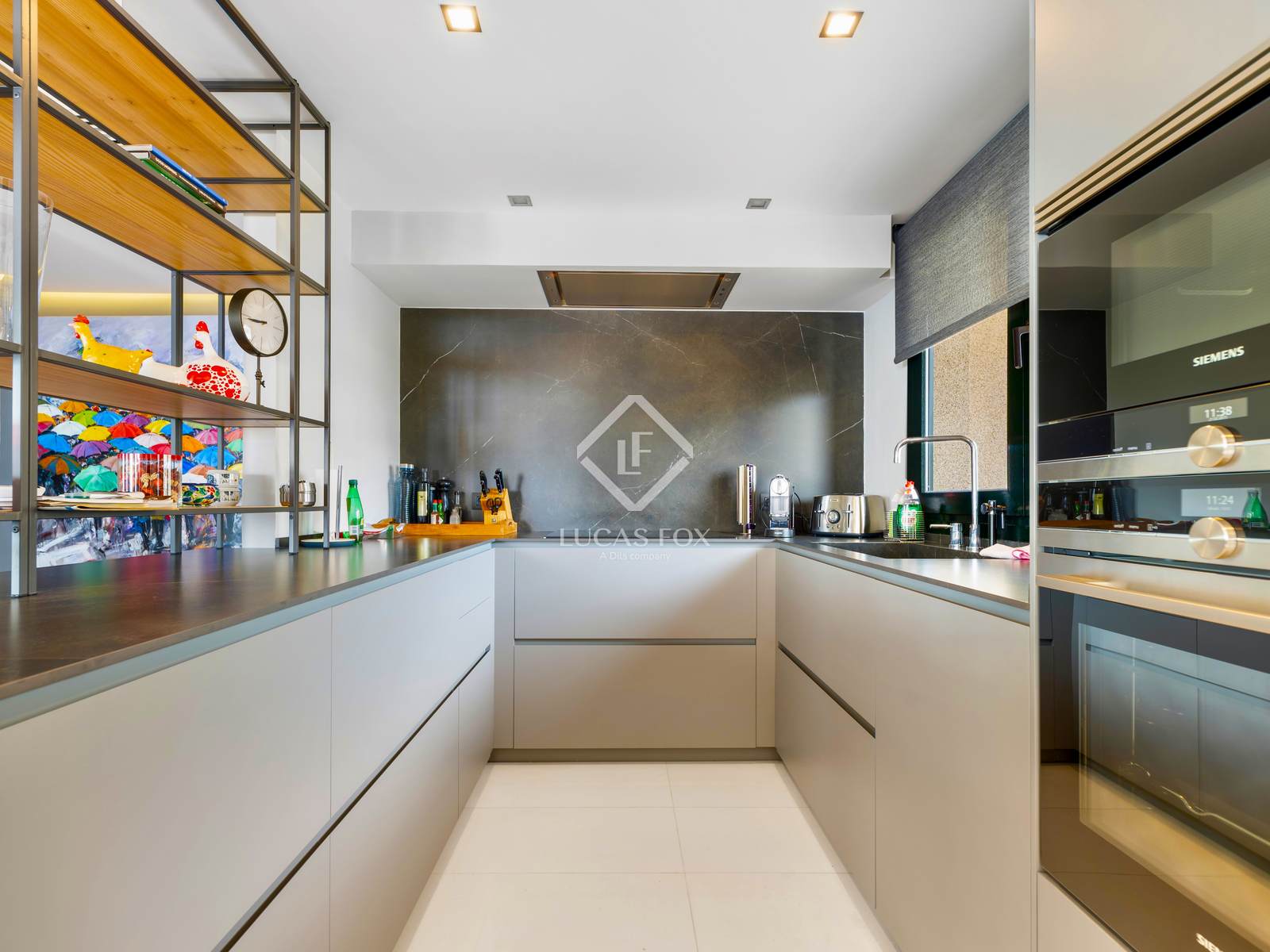 Die offene Küche mit moderner Kochinsel vereint Funktionalität und Stil. Der Hauptwohnbereich bietet eine warme und luftige Atmosphäre. Die großen Fenster öffnen sich auf die spektakuläre 91 m² große Terrasse und schaffen so eine nahtlose Verbindung zwischen Innen- und Außenbereich.