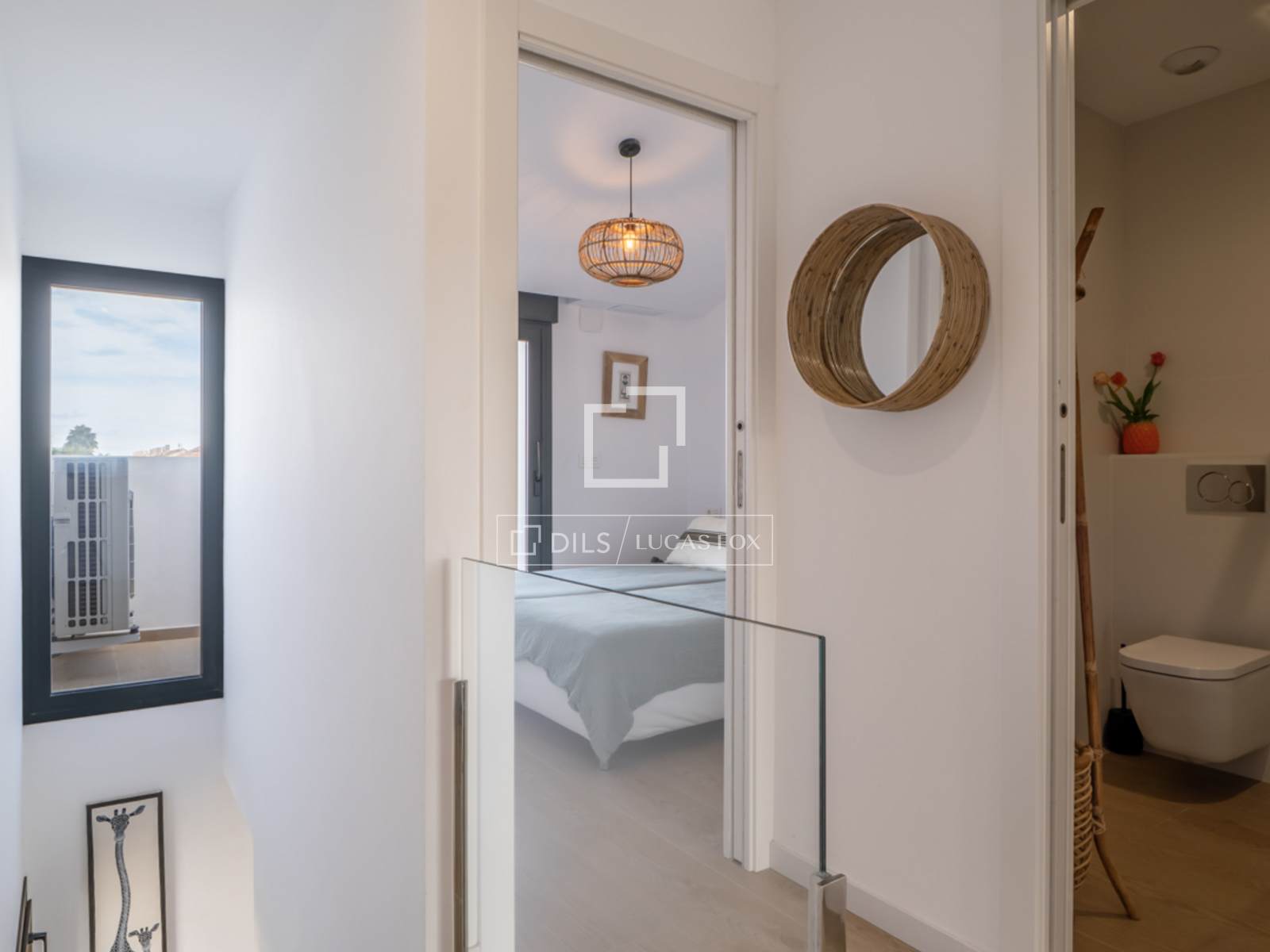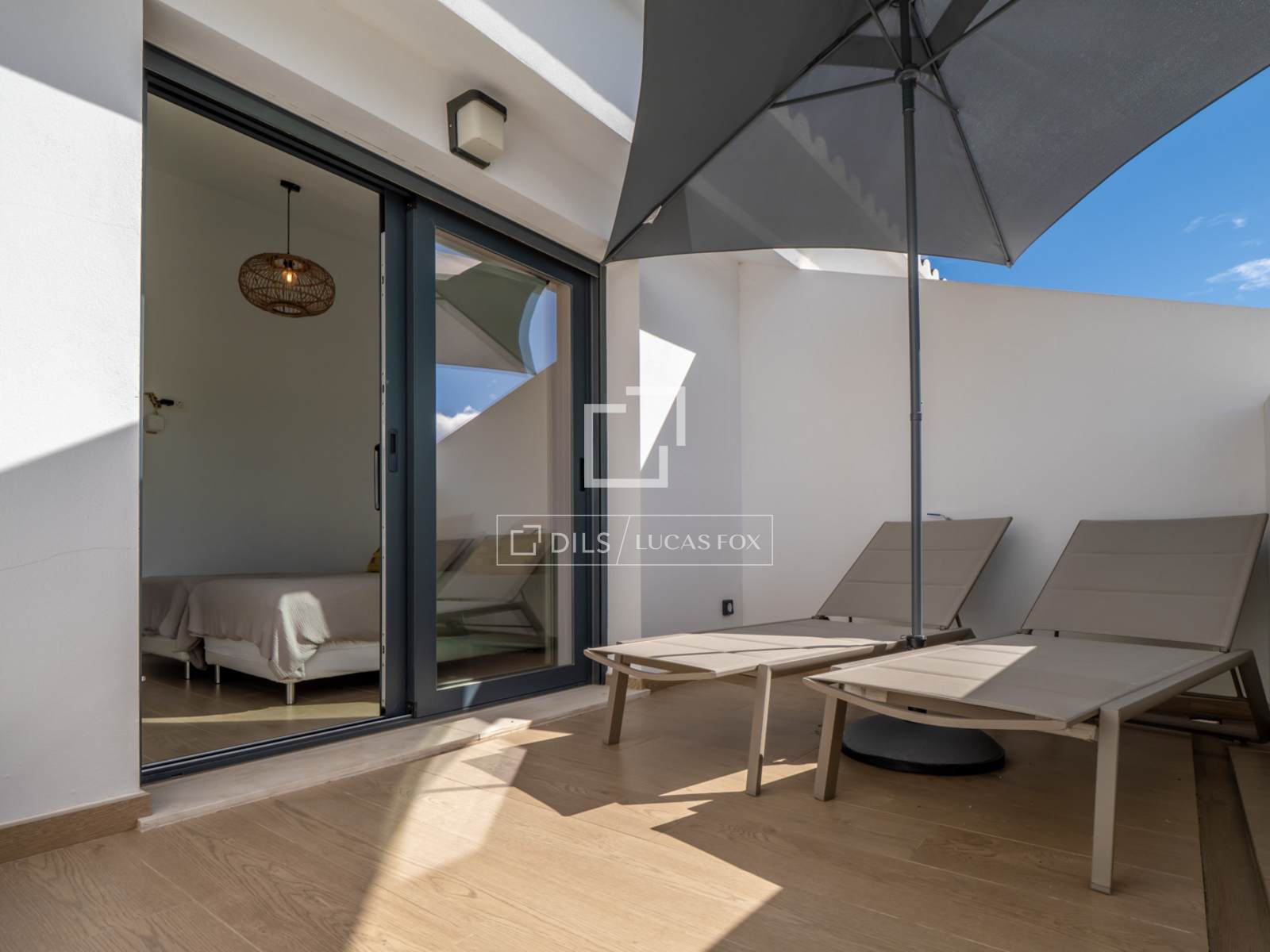 Das Penthouse erstreckt sich über zwei Etagen. Im Erdgeschoss befinden sich eine Eingangshalle, ein geräumiges Wohn-Esszimmer und eine voll ausgestattete, moderne Küche mit Kühl-/Gefrierschrank, Geschirrspüler, Backofen und Mikrowelle. Große Schiebefenster führen vom Wohnzimmer auf eine überdachte Terrasse. Ebenfalls auf dieser Etage befinden sich ein geräumiges Doppelschlafzimmer und ein Badezimmer.