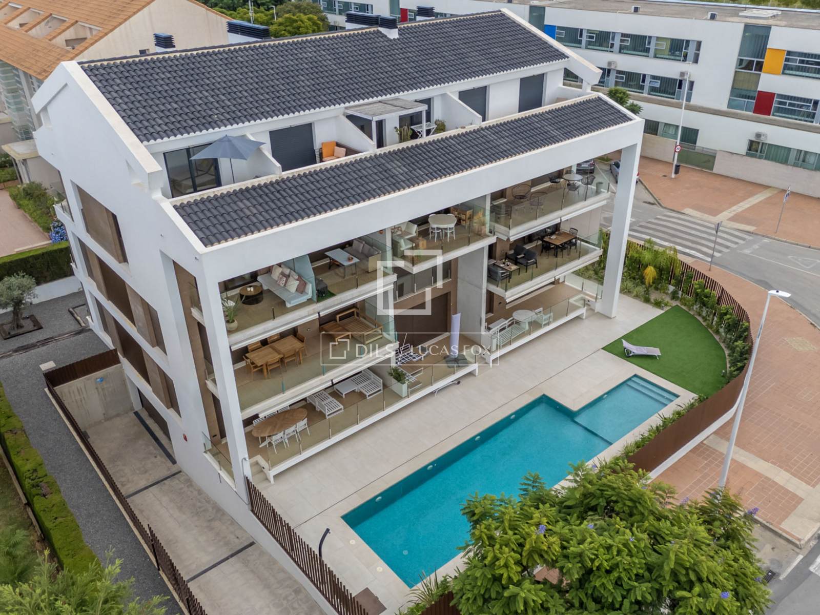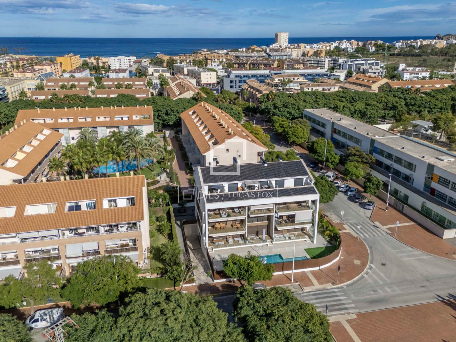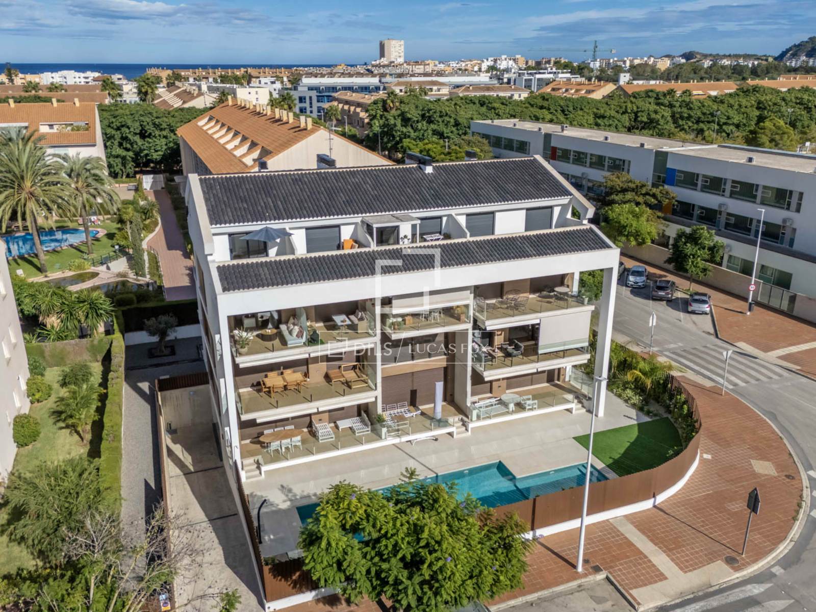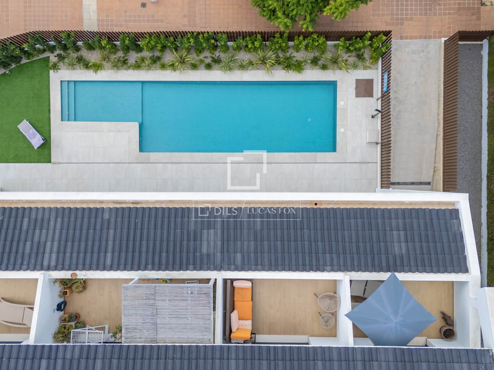 Der Komplex bietet einen Gemeinschaftspool mit einem gepflegten Garten, der nur mit acht anderen Wohnungen geteilt wird.
