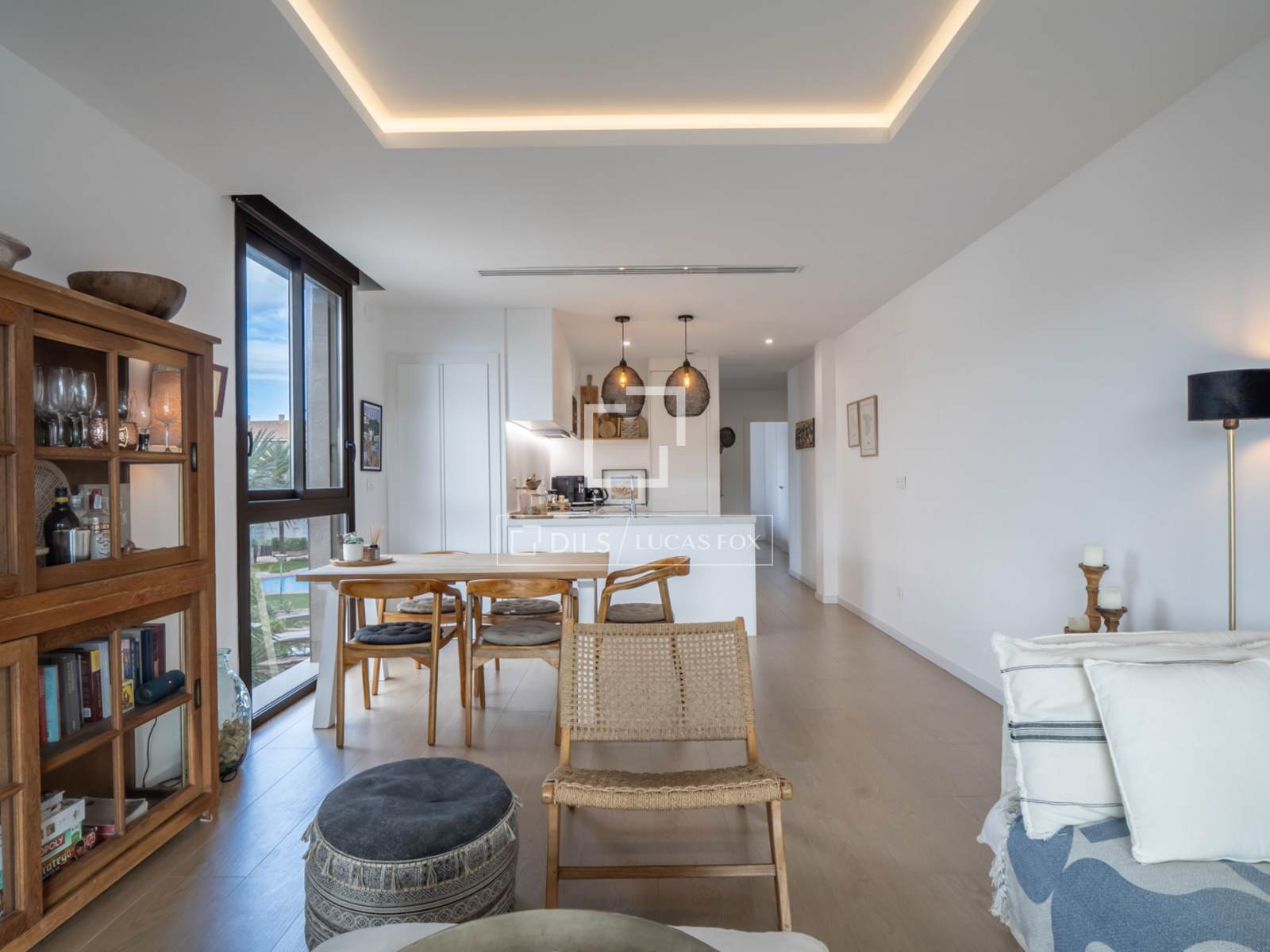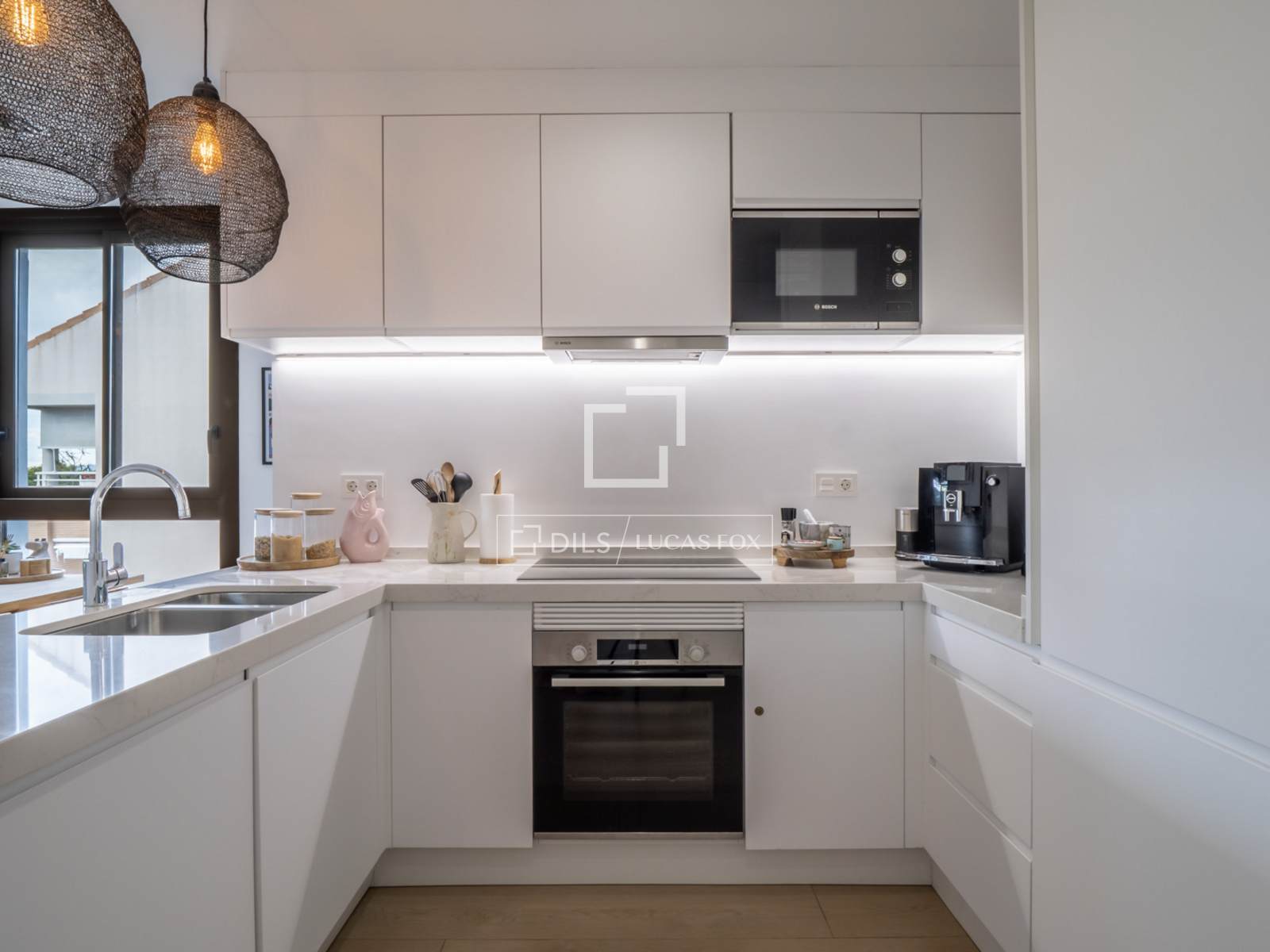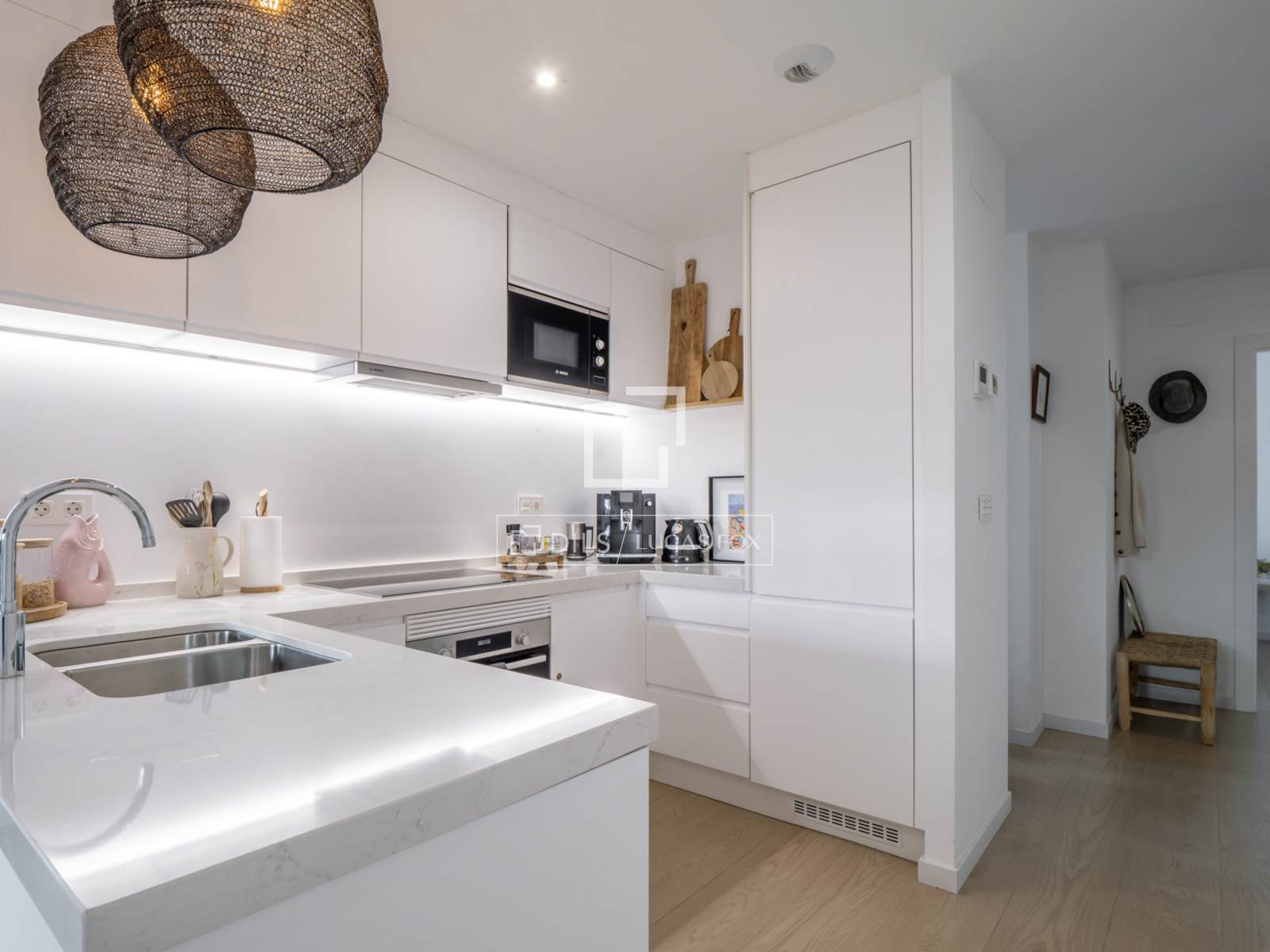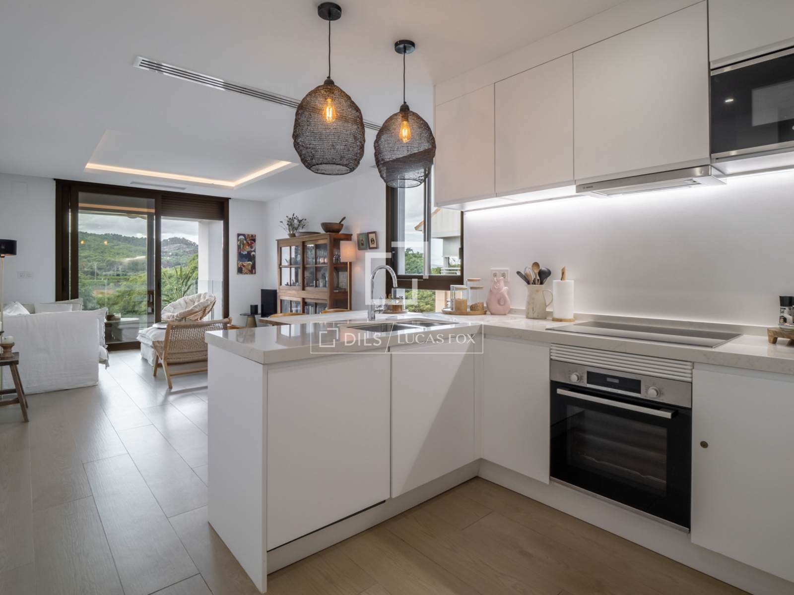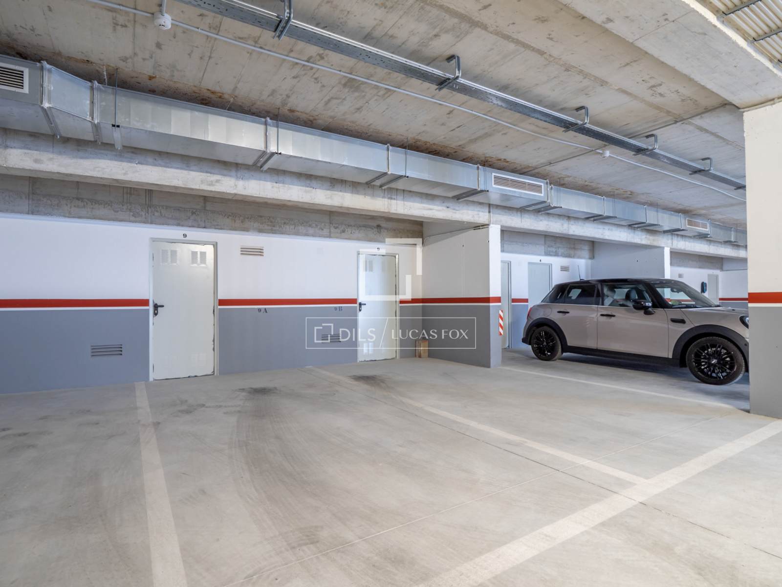 Die Wohnung ist ausgestattet mit Einbauschränken, einer zentralen Warm-/Kalt-Klimaanlage, Fußbodenheizung, elektrischen Rollläden, einer Wärmepumpe und einem privaten Parkplatz mit einem geräumigen Abstellraum in der Tiefgarage.