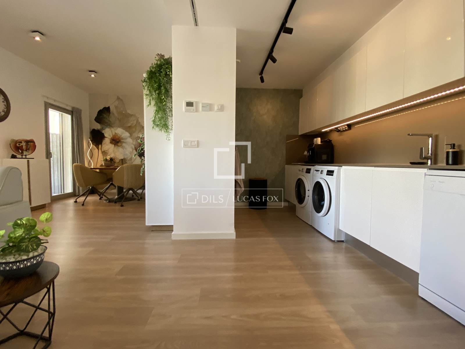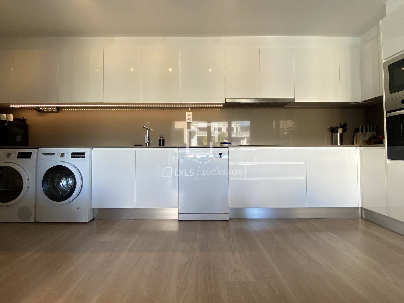 Die weiße Hochglanzküche ist mit eleganten Teka-Einbaugeräten wie Mikrowelle, Backofen, Induktionskochfeld und Dunstabzugshaube ausgestattet. Ergänzt wird sie durch einen großen Kühl-/Gefrierschrank sowie einen Geschirrspüler und eine Waschmaschine von Bosch. Die Wohnung wird über ein sogenanntes Conductos-System (Luftkanäle) beheizt und gekühlt. Dadurch entsteht ein angenehmes Raumklima. (CEE: B)