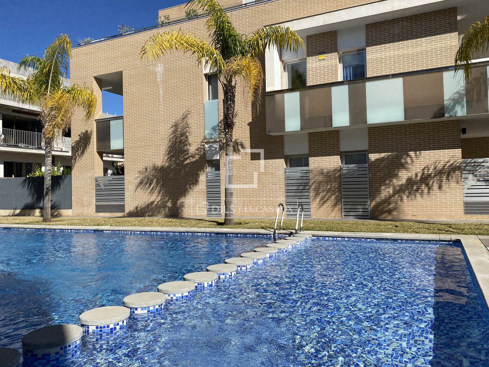 Von der Terrasse aus hat man einen Blick auf den Gemeinschaftspool, der exklusiv den Bewohnern dieser Anlage zur Verfügung steht. Hier kann man nach einem Tag am Strand von Arenal in Jávea oder einer sportlichen Wanderung oder Radtour durch das Montgó-Gebirge wunderbar entspannen.