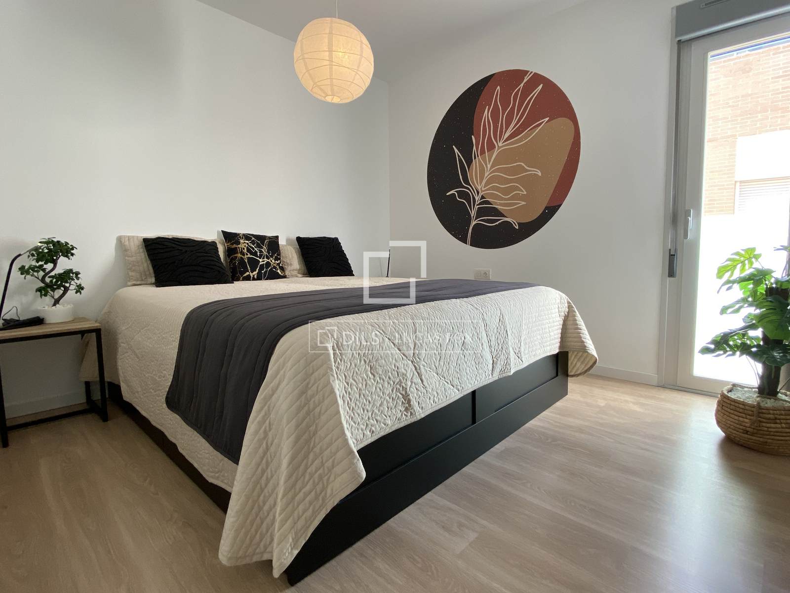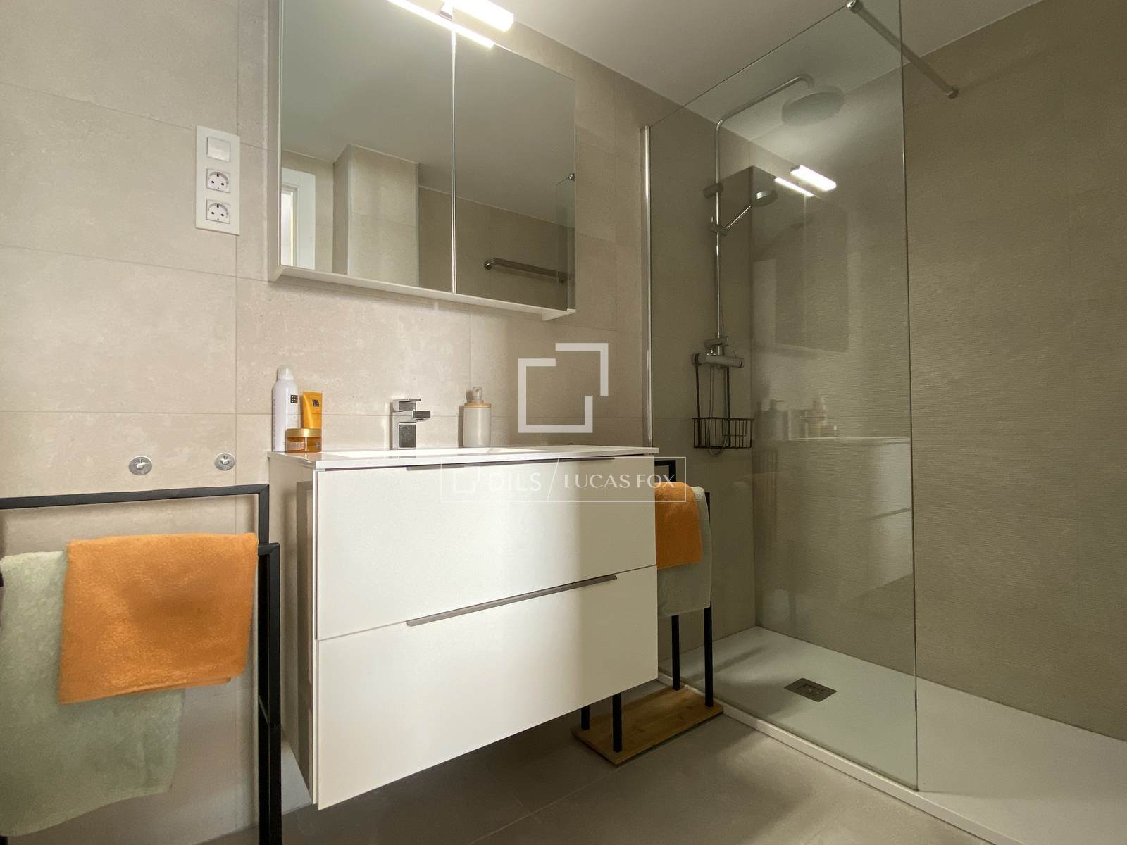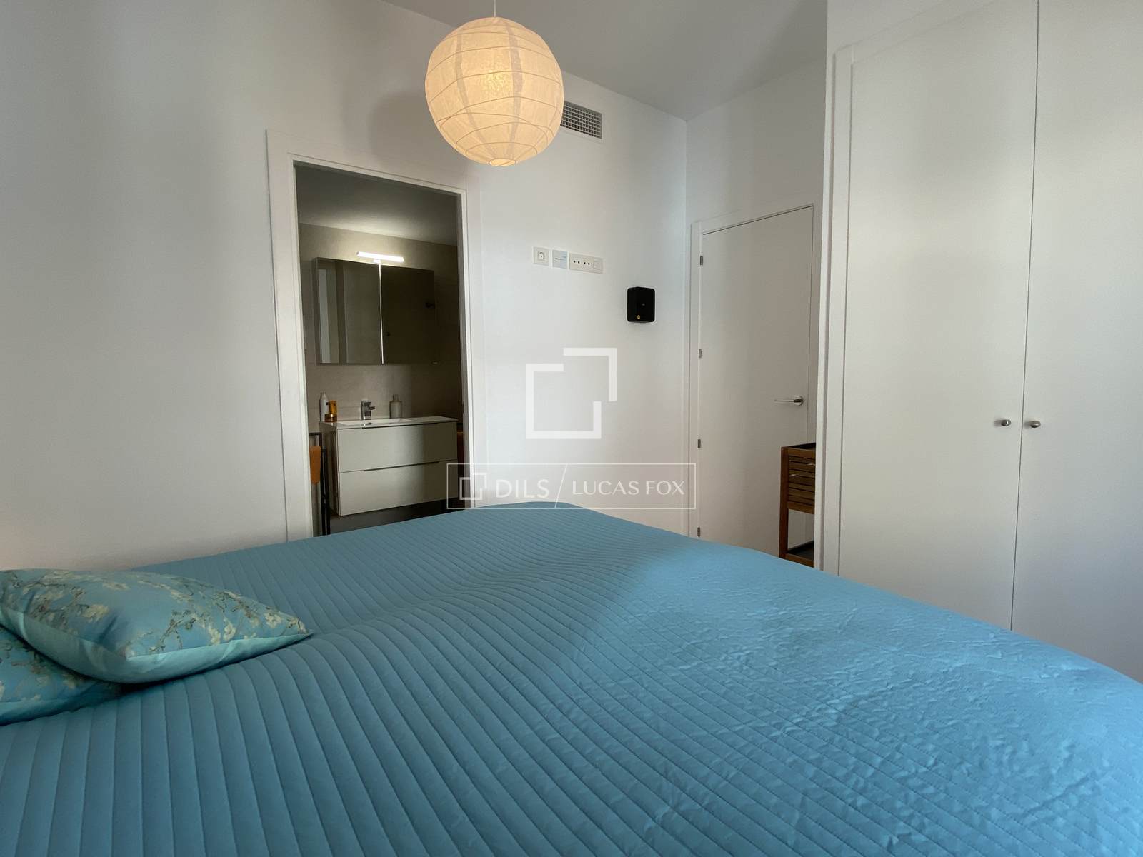 Auf der einen Seite der Wohnung befindet sich das Hauptschlafzimmer mit eigenem Badezimmer, ausgestattet mit Dusche, Waschbecken, WC und Bidet. Die beiden anderen Schlafzimmer liegen auf der gegenüberliegenden Seite des Wohnzimmers und teilen sich das zweite Badezimmer, das ebenfalls mit Dusche, Waschbecken und WC ausgestattet ist. Die Schlafzimmer verfügen über Einbauschränke mit zusätzlichen Regalen und Schubladen, die viel Stauraum bieten. Die gesamte Wohnung ist mit hochwertigem Laminatboden in einem neutralen Holzton ausgelegt. Die Wohnung wird teilmöbliert angeboten.