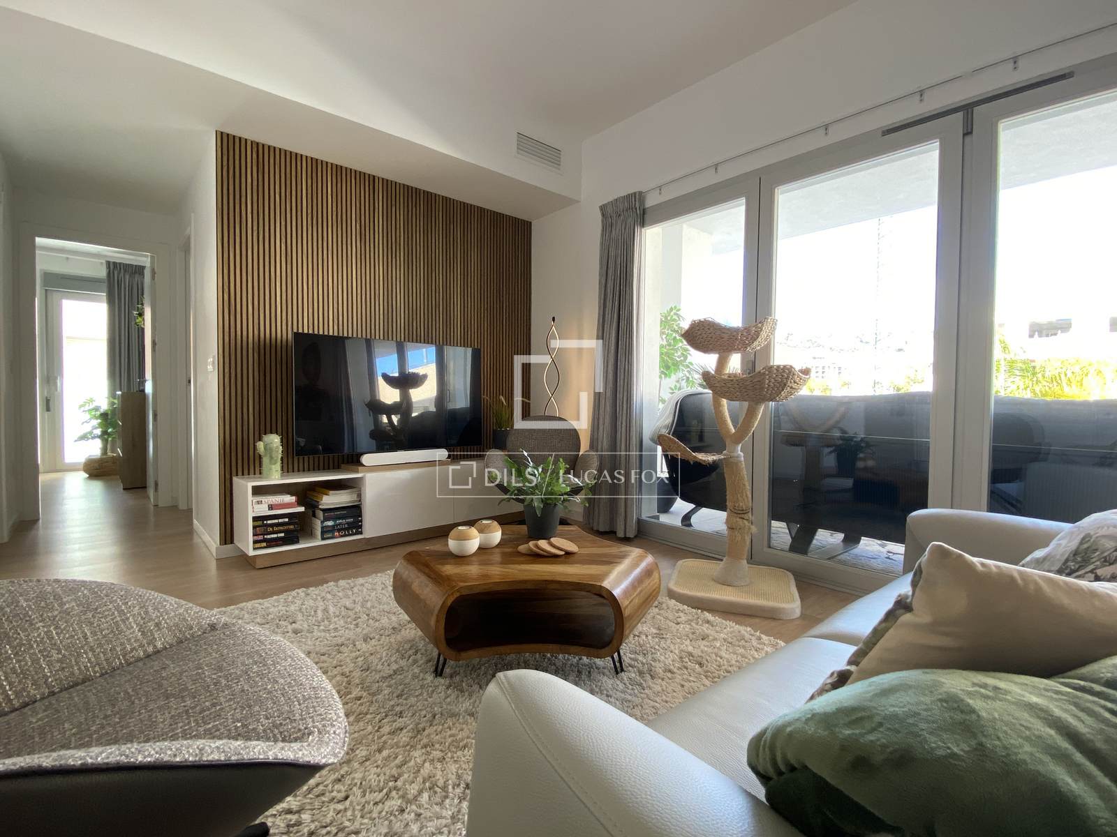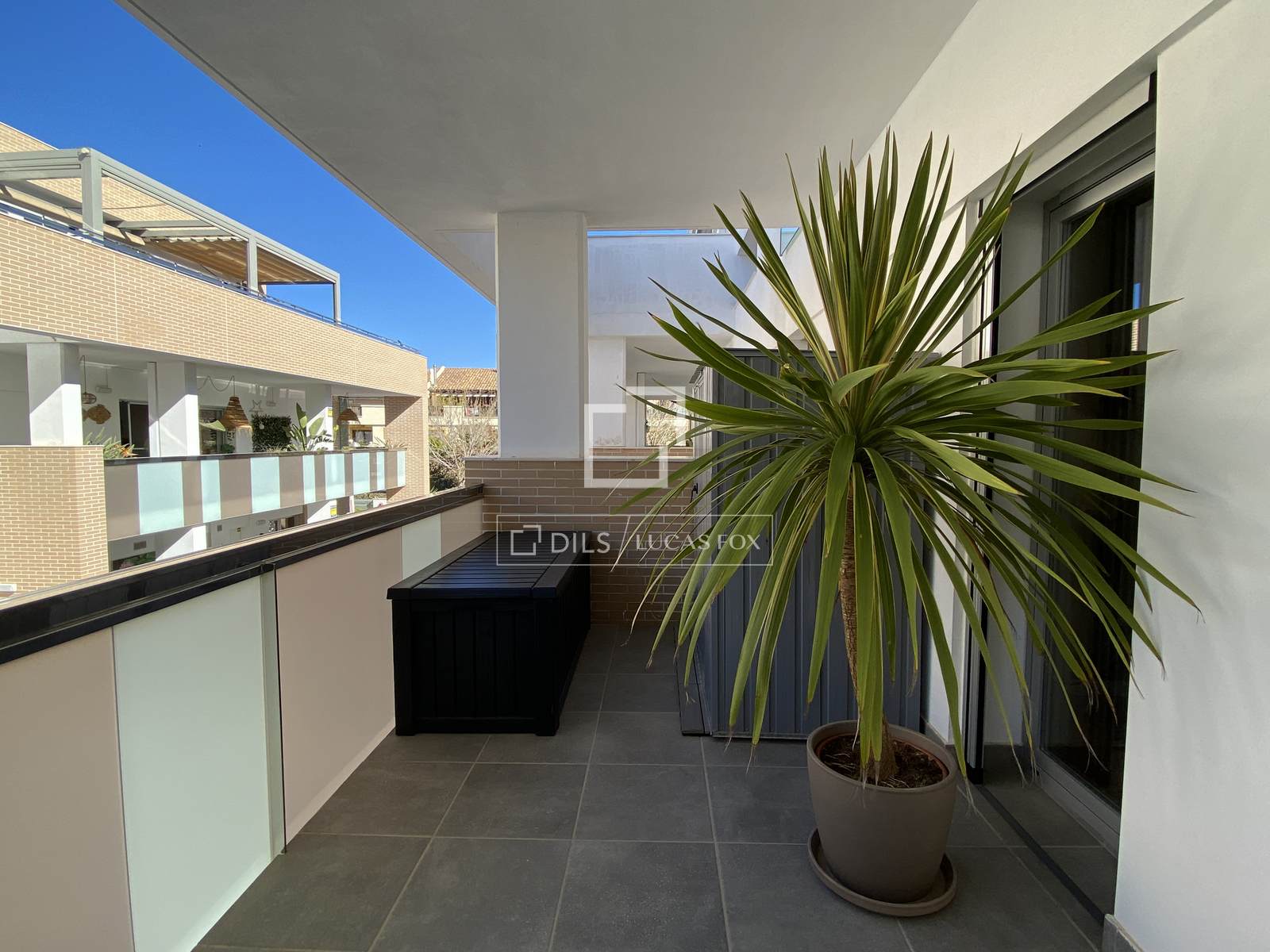 Dieses gemütliche Apartment verfügt über drei Schlafzimmer und zwei Badezimmer. Beim Betreten der Wohnung werden Sie sofort vom einfallenden Tageslicht durch die großen Fenster begeistert sein. Eine Terrasse erstreckt sich über die gesamte Länge der Wohnung und ist von einem der Schlafzimmer oder vom offenen Wohn- und Essbereich aus zugänglich. Diese fast 35 m² große Terrasse ist eine wahre Erweiterung des Wohnraums. So verschmelzen Innen- und Außenbereich. Genießen Sie das mediterrane Klima in vollen Zügen in Ihrem modernen Apartment.