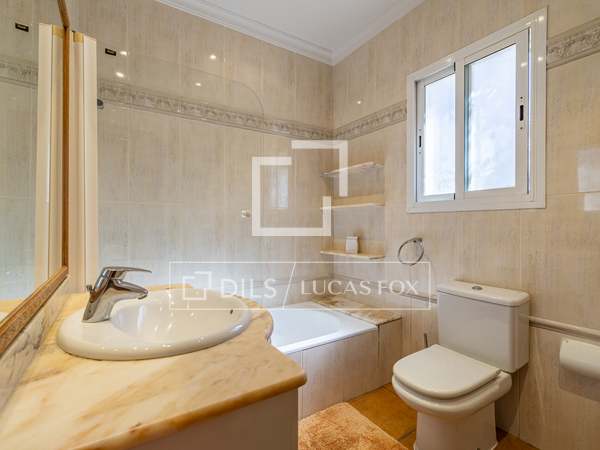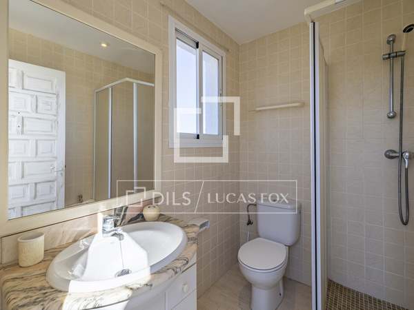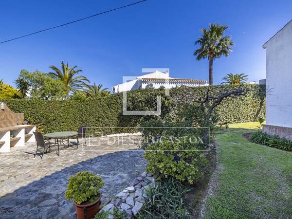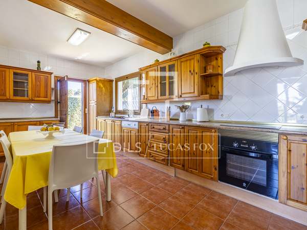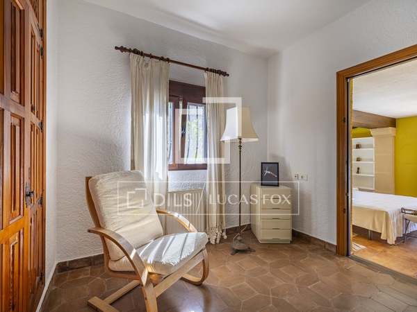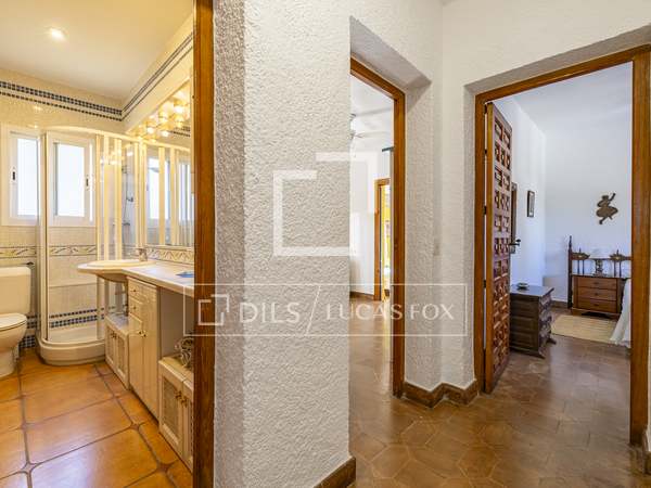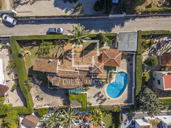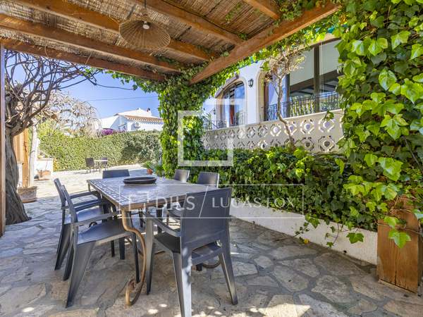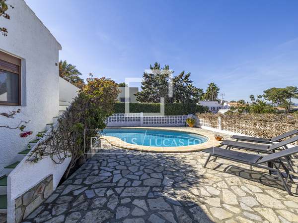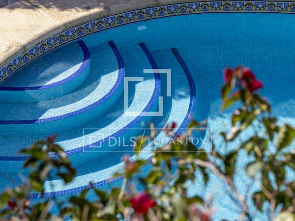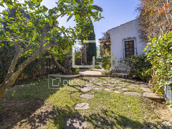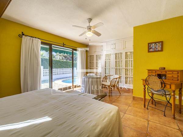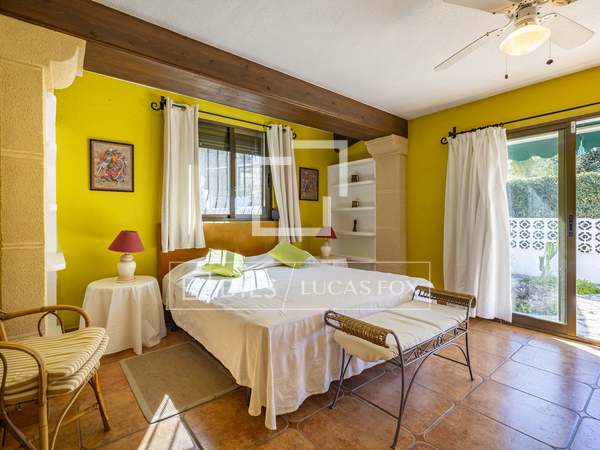 Draußen liegt der Swimmingpool inmitten eines weitläufigen Grundstücks mit mediterranen Gärten, Palmen und Obstbäumen. Ein gemütlicher Chill-out-Bereich im Ibiza-Stil rundet den Außenbereich ab und macht ihn zum perfekten Ort, um zu entspannen und das Klima zu genießen.