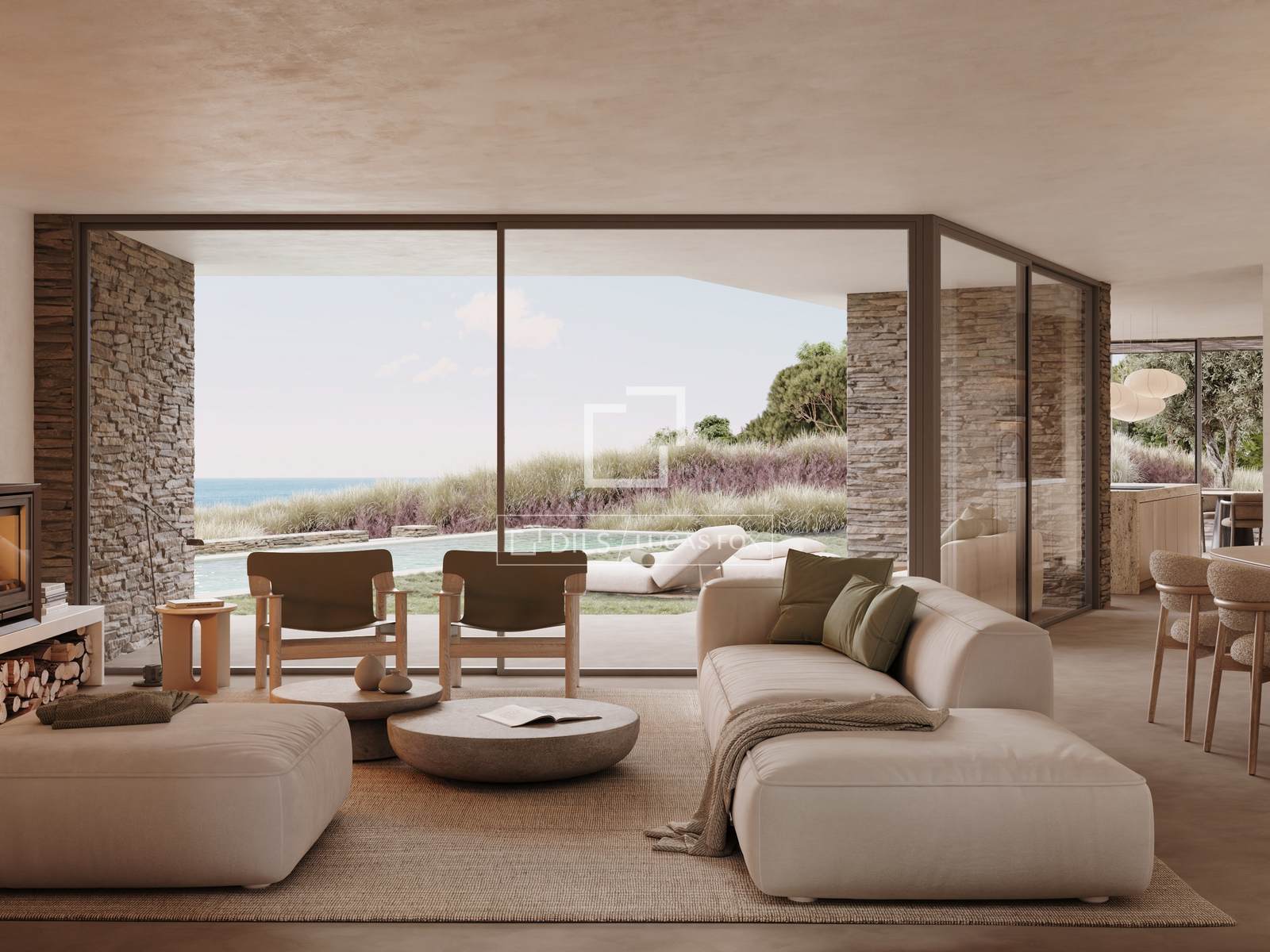 Der Wohnbereich umfasst ein geräumiges Wohn-Esszimmer mit direktem Zugang zum Garten und Pool. So entsteht ein heller und offener Raum, ideal für den mediterranen Lebensstil. Von hier aus genießt man einen herrlichen Meerblick. Die moderne Küche, die ebenfalls mit dem Außenbereich verbunden ist, schafft eine harmonische Verbindung zu den Terrassen und dem restlichen Garten.