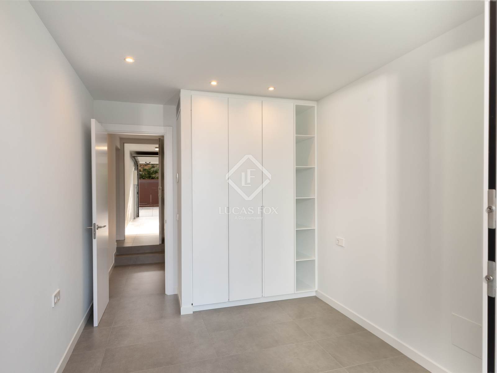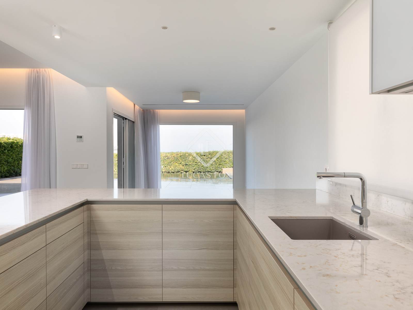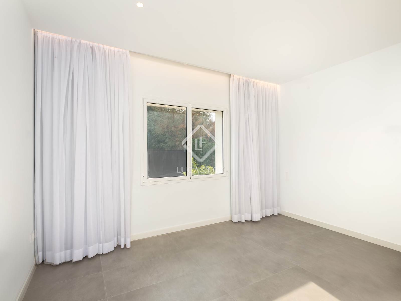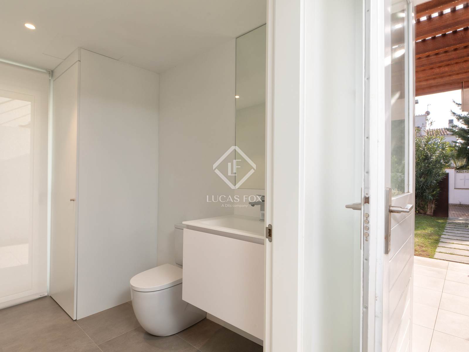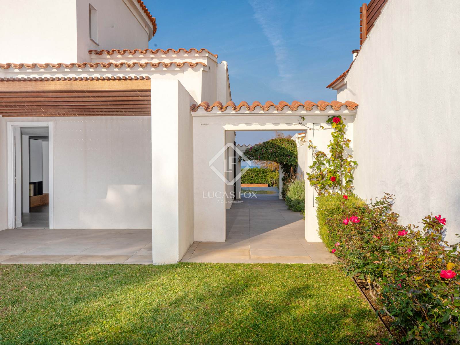 Der Garten ist großzügig angelegt und der Pool fügt sich harmonisch in das Hausdesign ein. Das Anwesen bietet direkten Zugang zum Strand von Riells, der nur wenige Schritte entfernt ist.