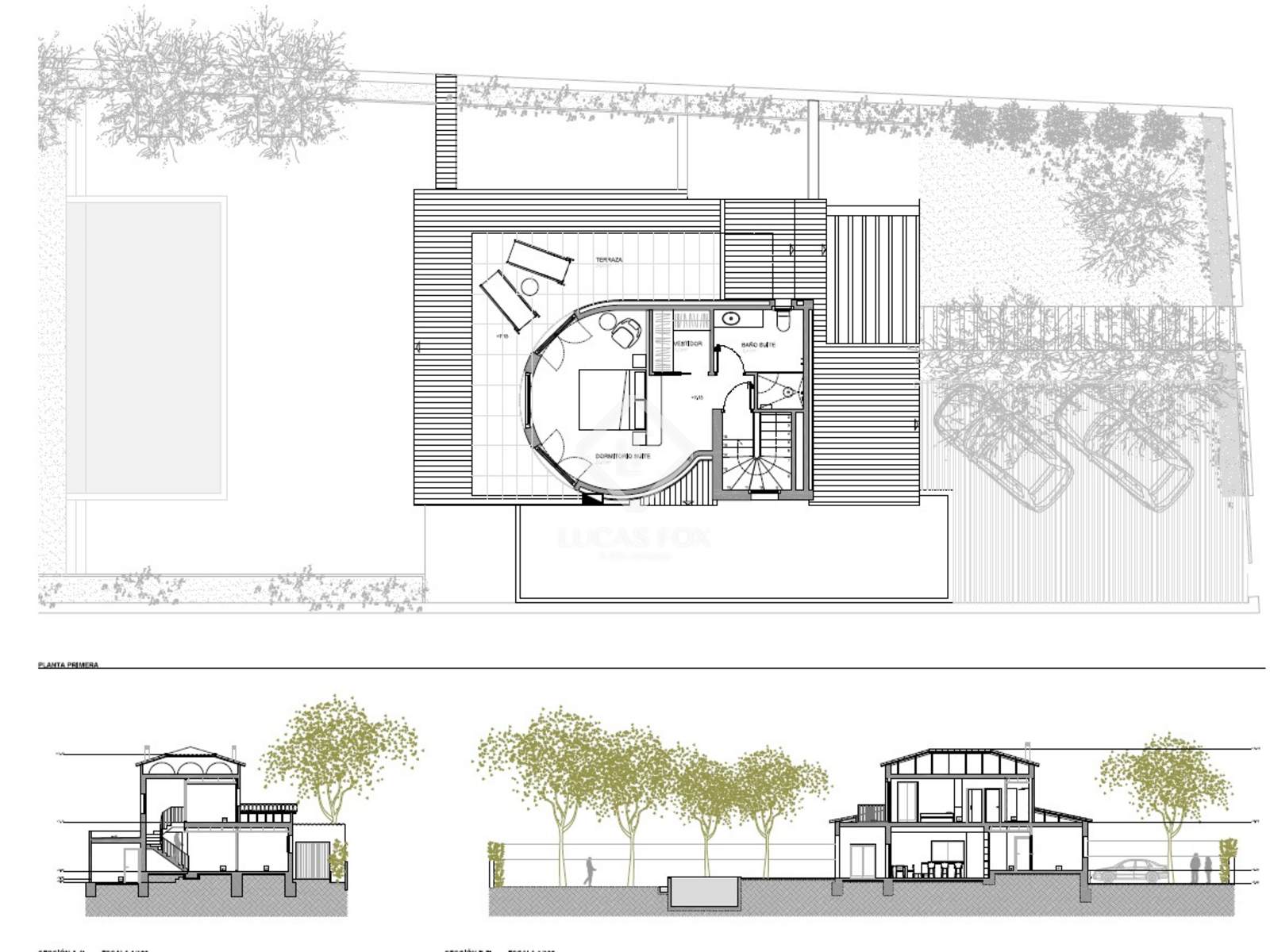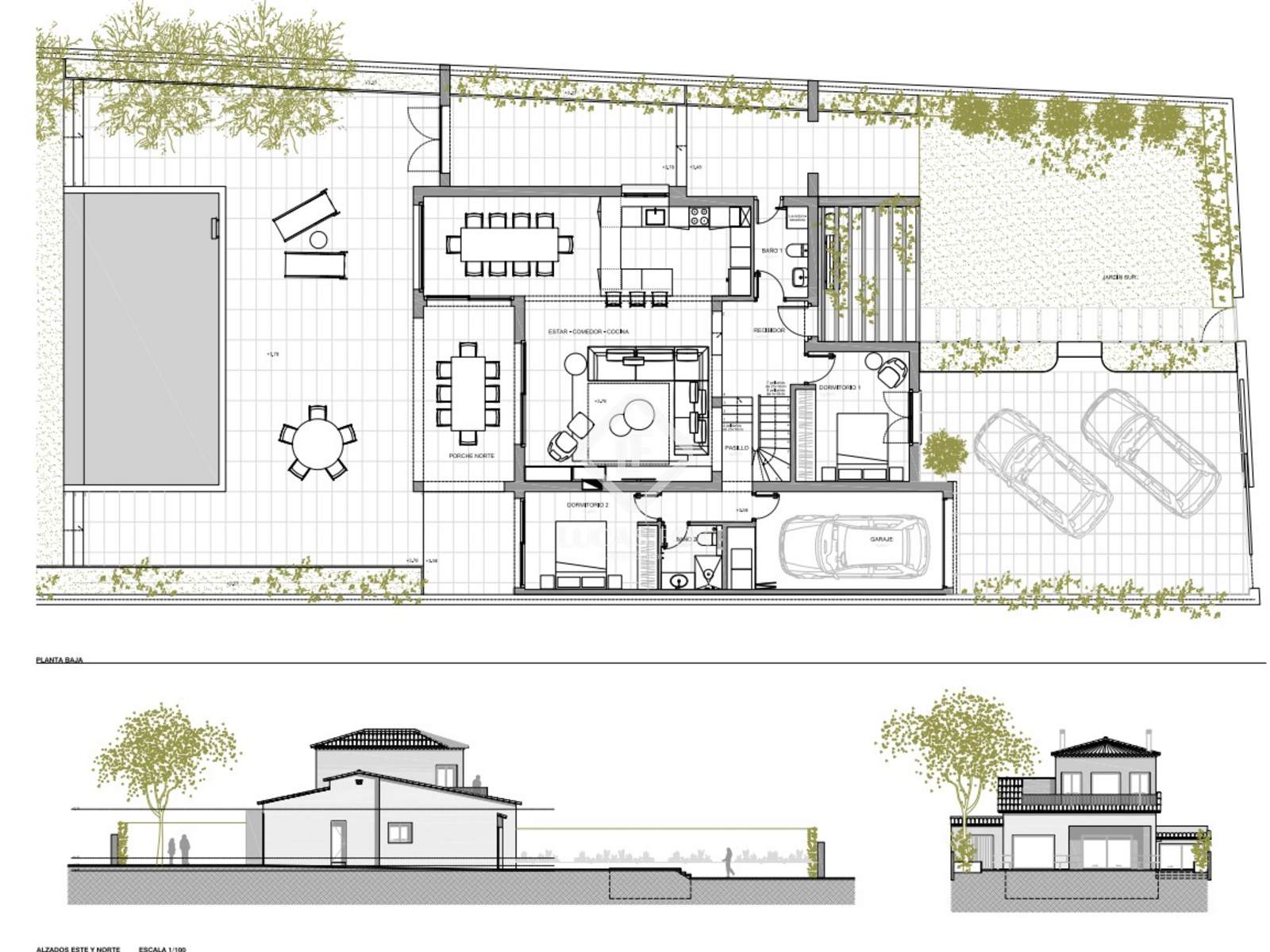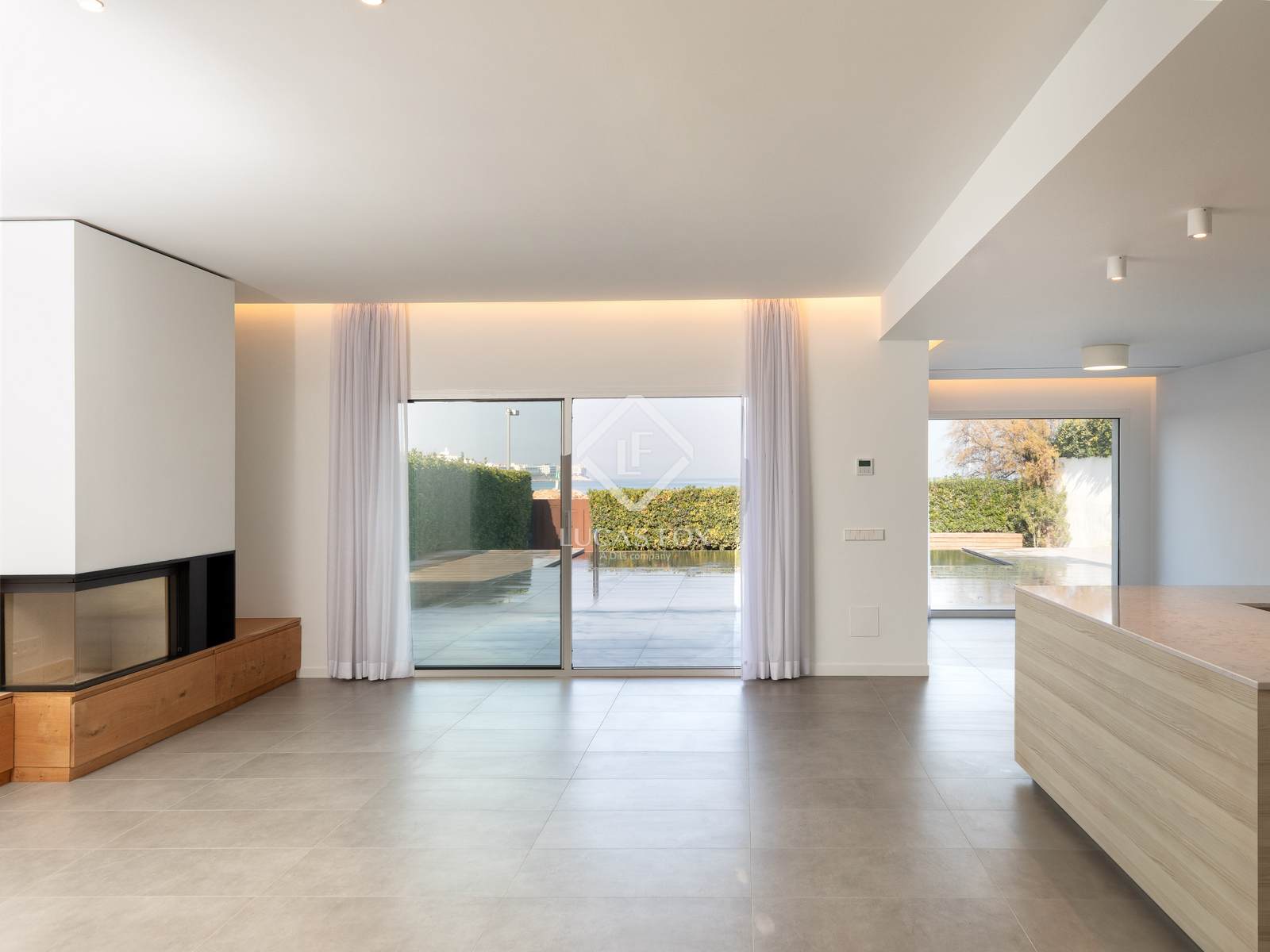 Das Haus erstreckt sich über zwei Etagen. Im Erdgeschoss befindet sich ein geräumiges und helles Wohn-Esszimmer mit Kamin und moderner offener Küche. Der gesamte Bereich ist mit dem Garten und dem Swimmingpool verbunden und bietet einen wunderschönen Meerblick. Ebenfalls auf dieser Ebene befinden sich zwei Doppelschlafzimmer, eines davon mit direktem Zugang zum Garten. Zusätzlich gibt es ein Badezimmer, eine Garage und ein Gäste-WC.