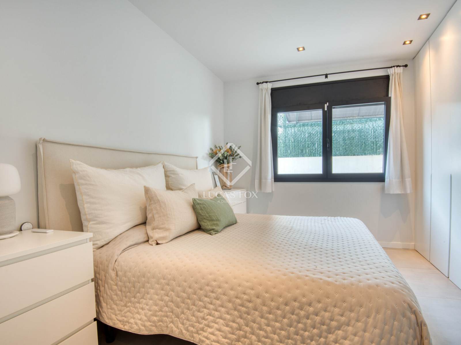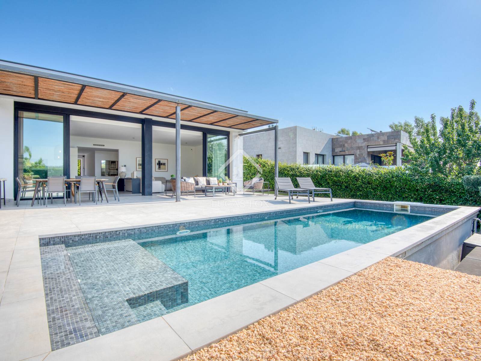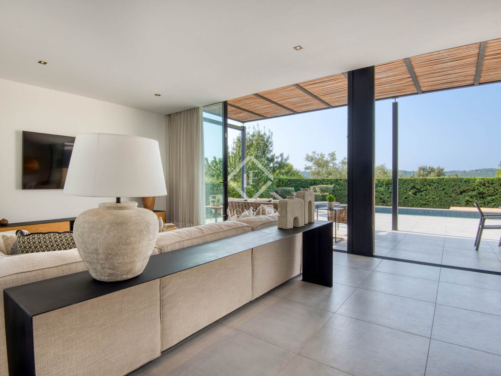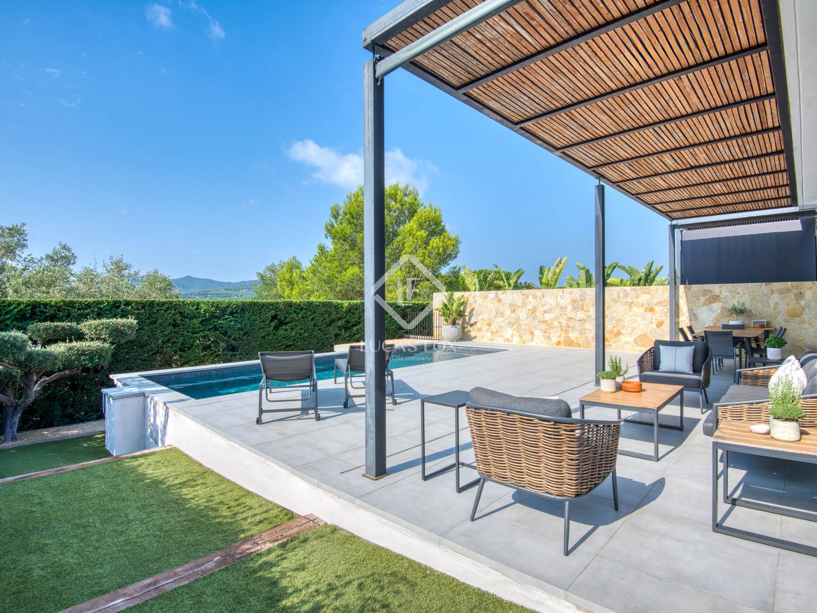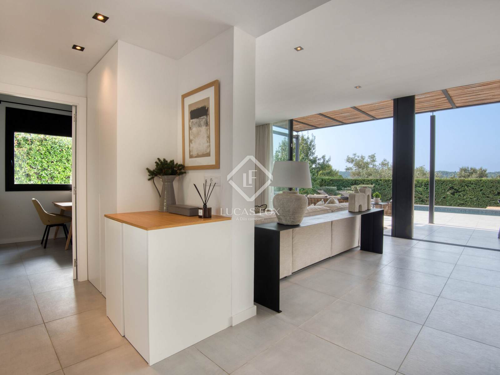Die Innenausstattung ist praktisch und einladend. Es verfügt über ein geräumiges Wohn-Esszimmer mit offener Küche und direktem Zugang zum Garten und Pool, zwei Doppelschlafzimmer (eines davon en suite ), ein Bürozimmer und ein Gäste-WC. Die Ausstattung ist hochwertig: Feinsteinzeugböden, Fußbodenheizung und Klimaanlage.