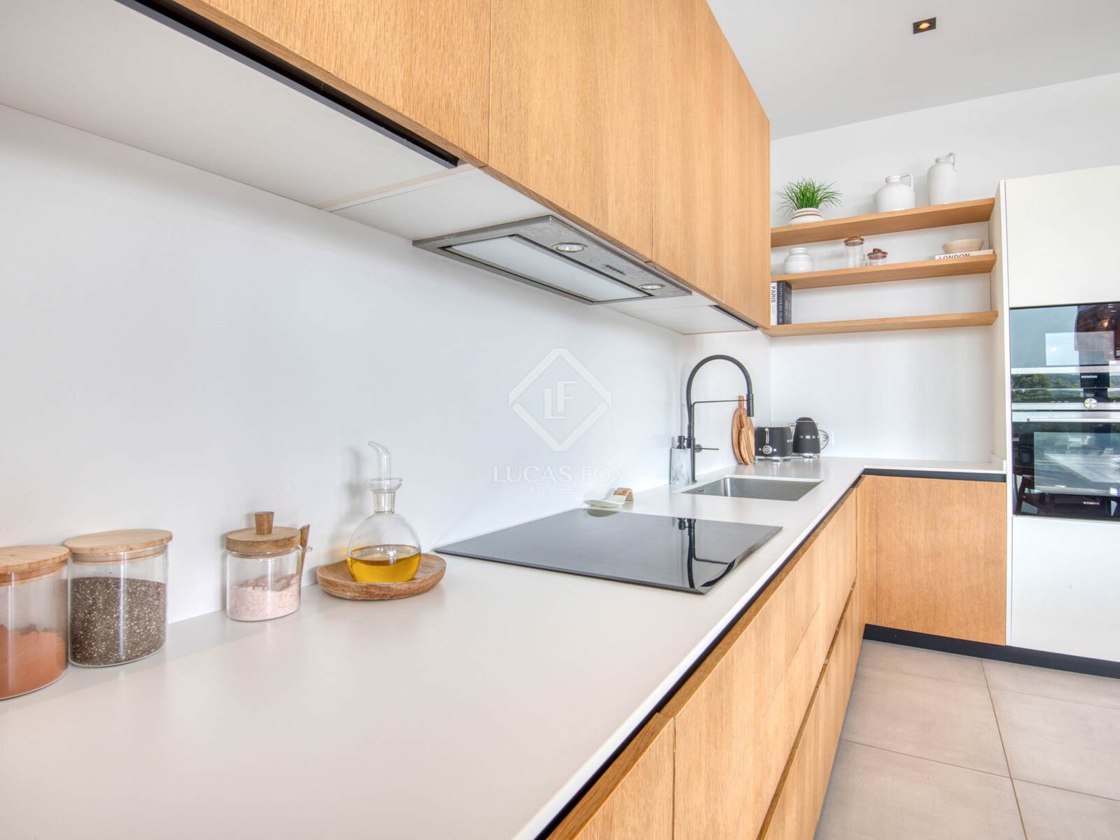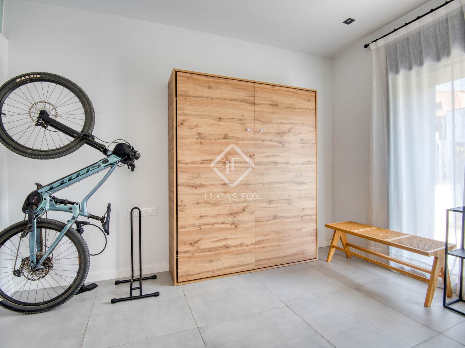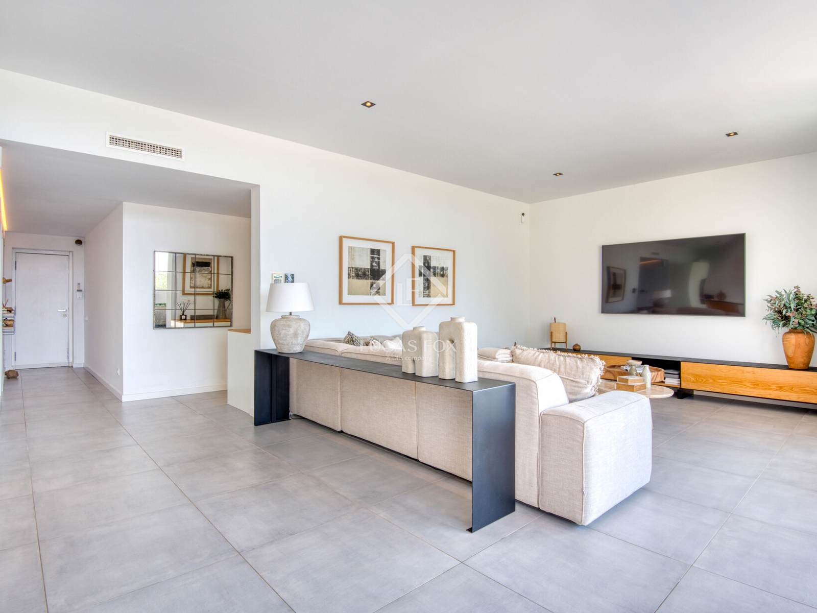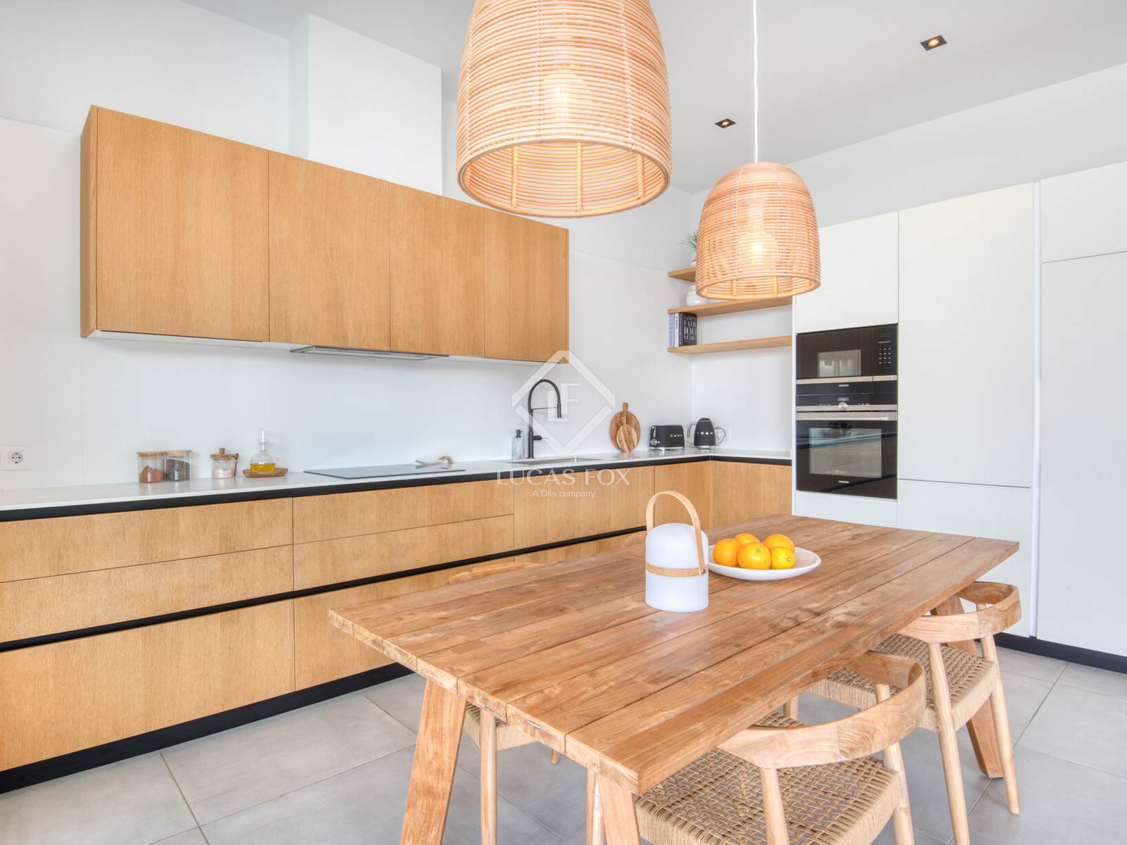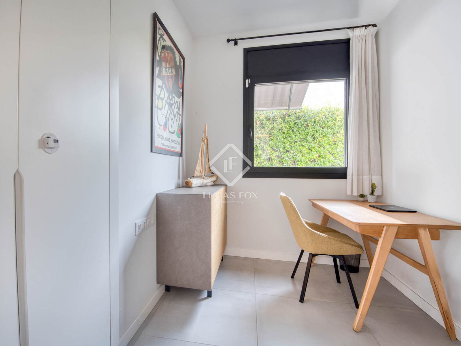 Die Innenausstattung ist praktisch und einladend. Es verfügt über ein geräumiges Wohn-Esszimmer mit offener Küche und direktem Zugang zum Garten und Pool, zwei Doppelschlafzimmer (eines davon en suite ), ein Bürozimmer und ein Gäste-WC. Die Ausstattung ist hochwertig: Feinsteinzeugböden, Fußbodenheizung und Klimaanlage.