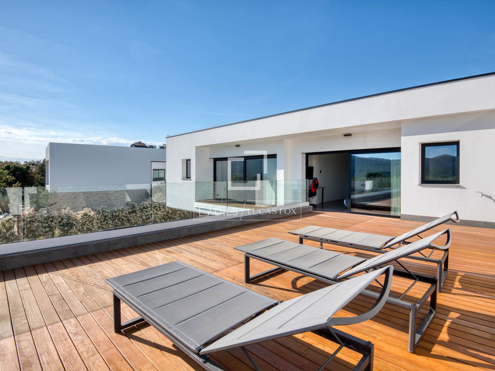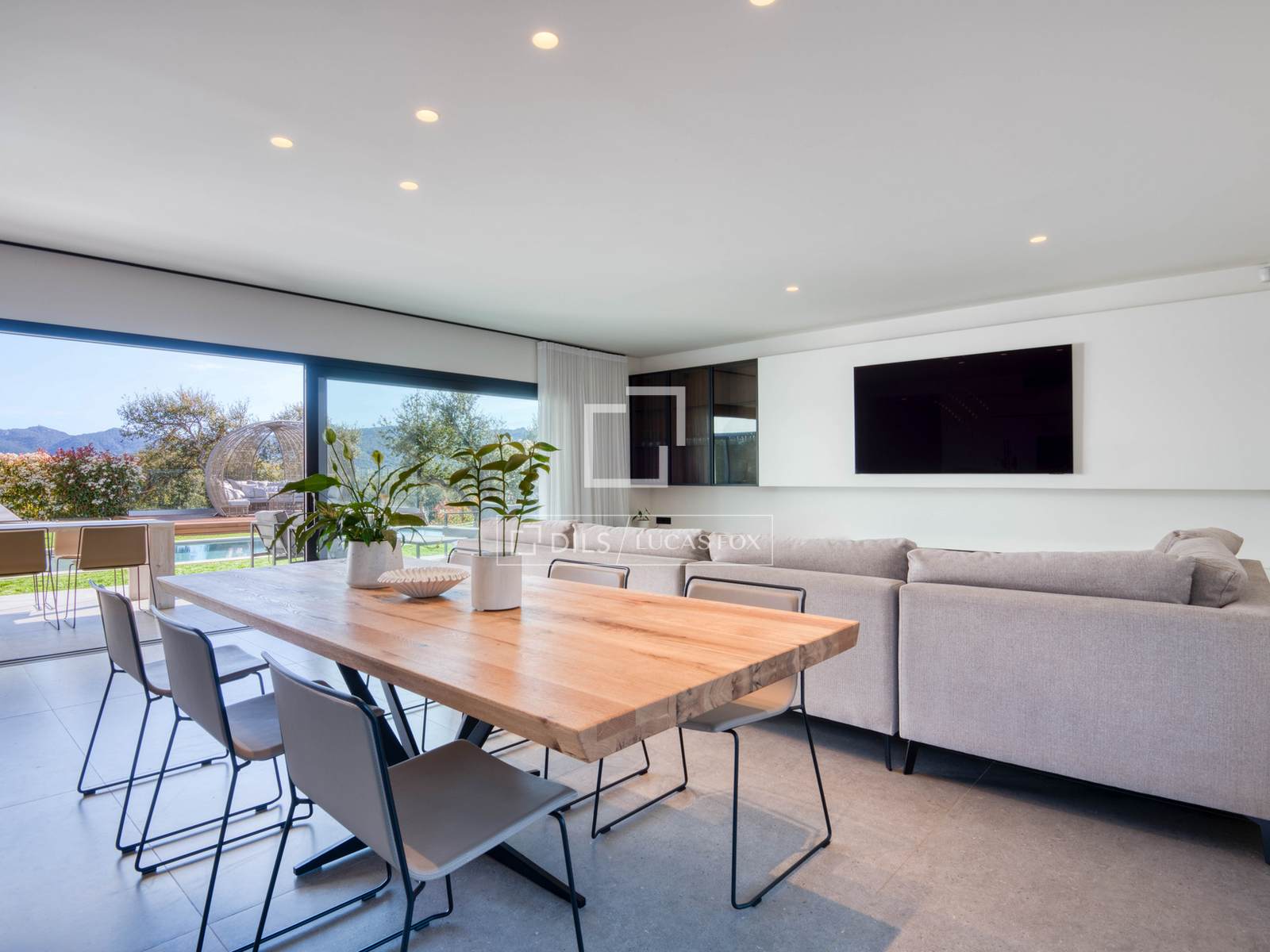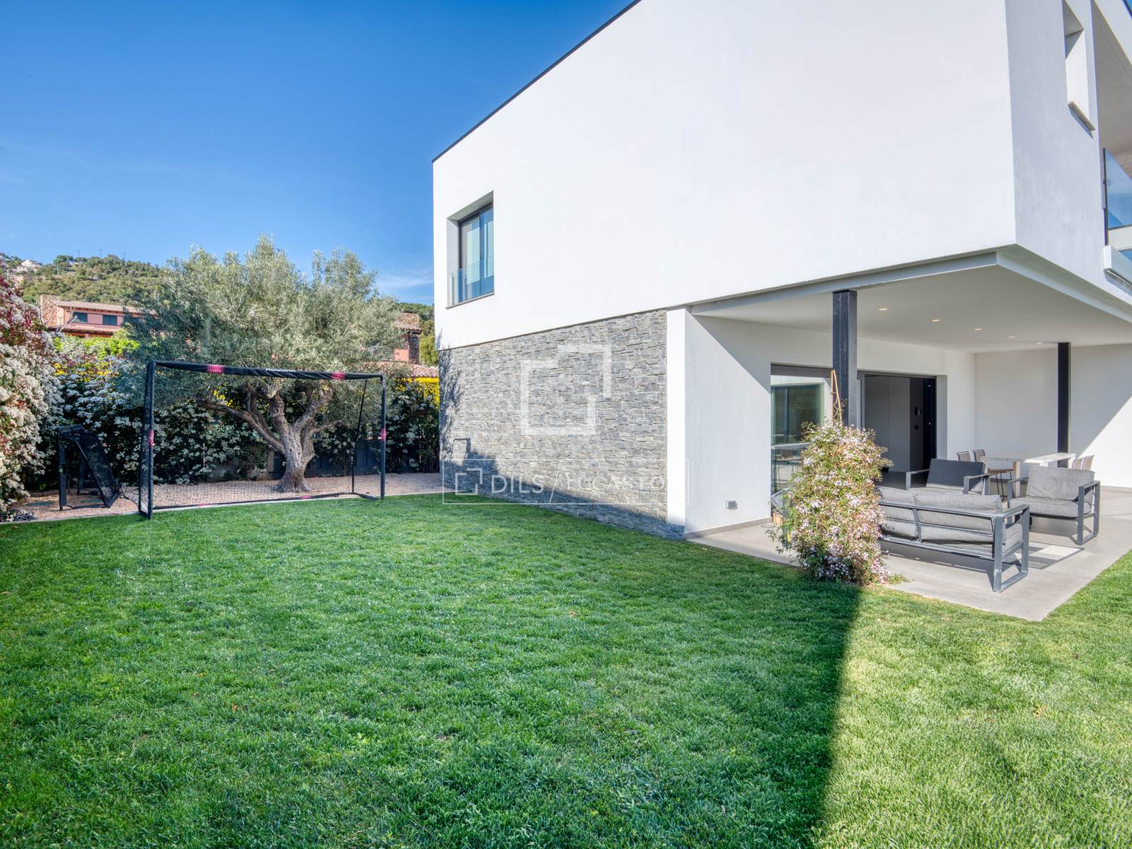 Moderne Neubauvilla (2024) in Mas Pla, Santa Cristina d'Aro. 478 m², großzügige offene Wohnbereiche, 5 Schlafzimmer, 4 Badezimmer, großer ebener, sonniger Garten mit Salzwasserpool, Terrasse mit Aussicht, große Garage, Luftwärmepumpe, Fußbodenheizung und Solaranlage.