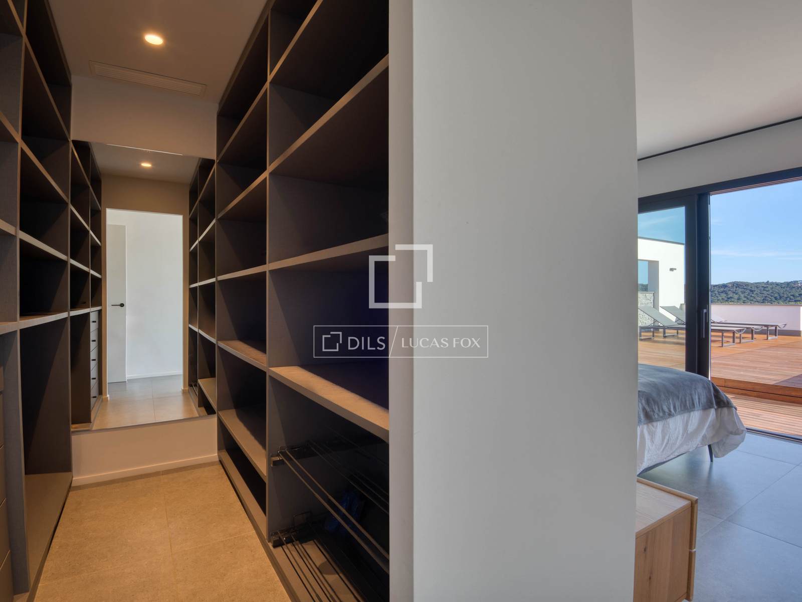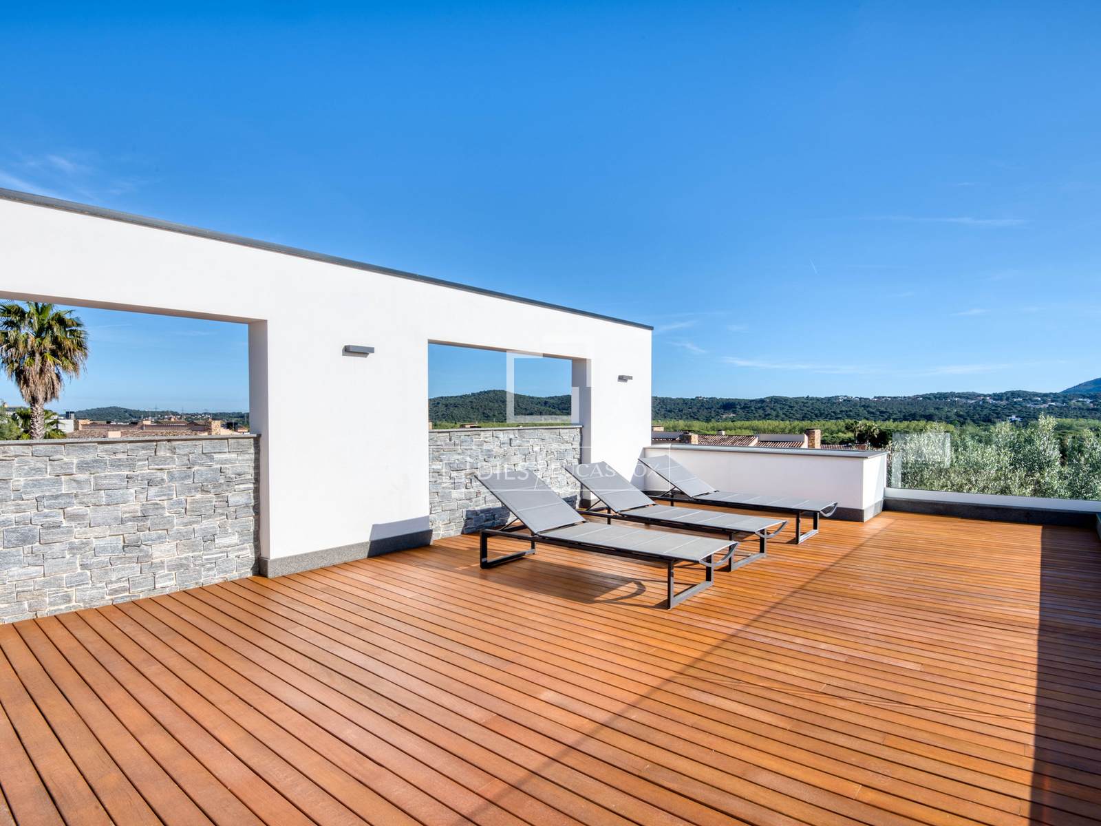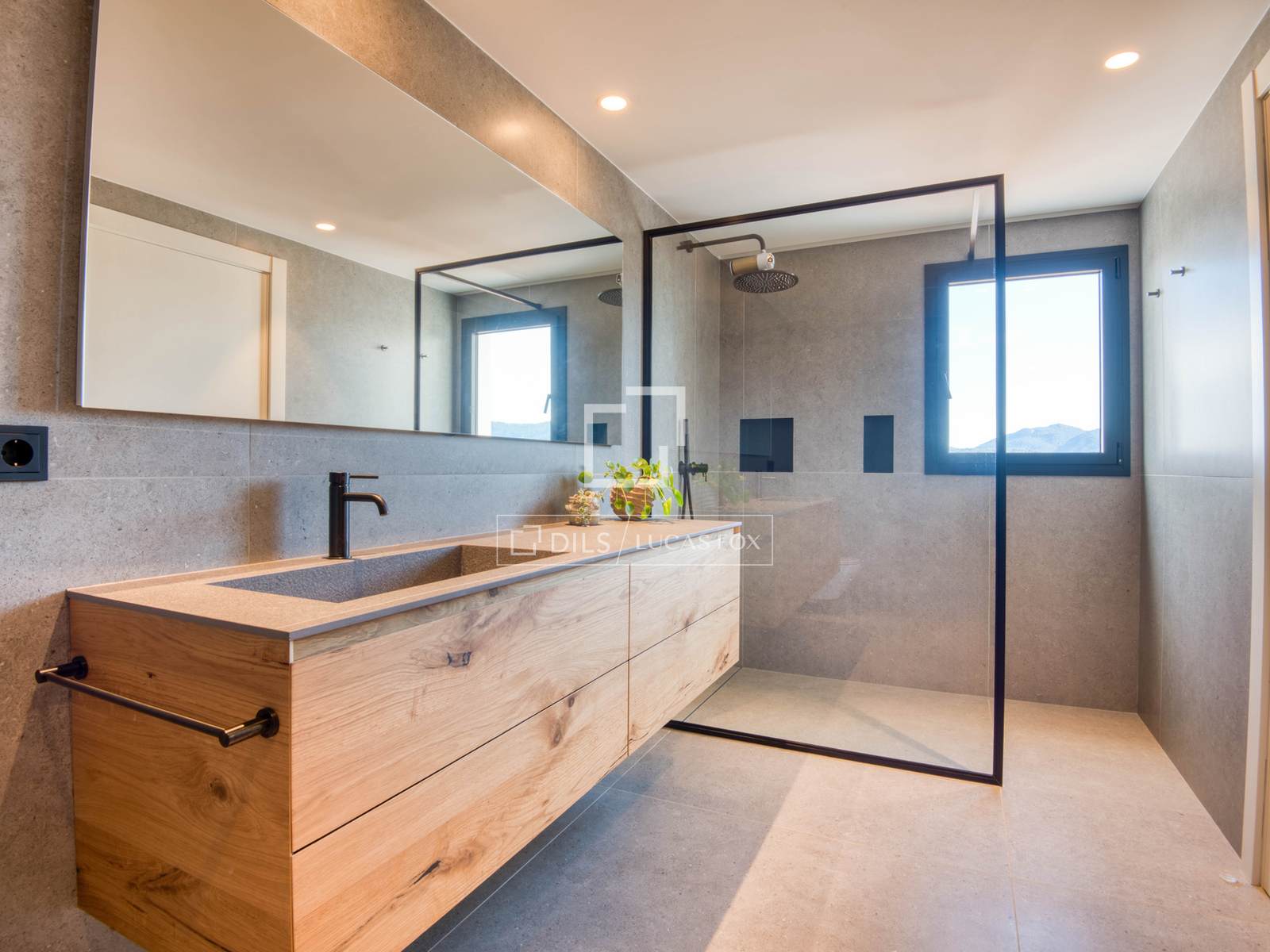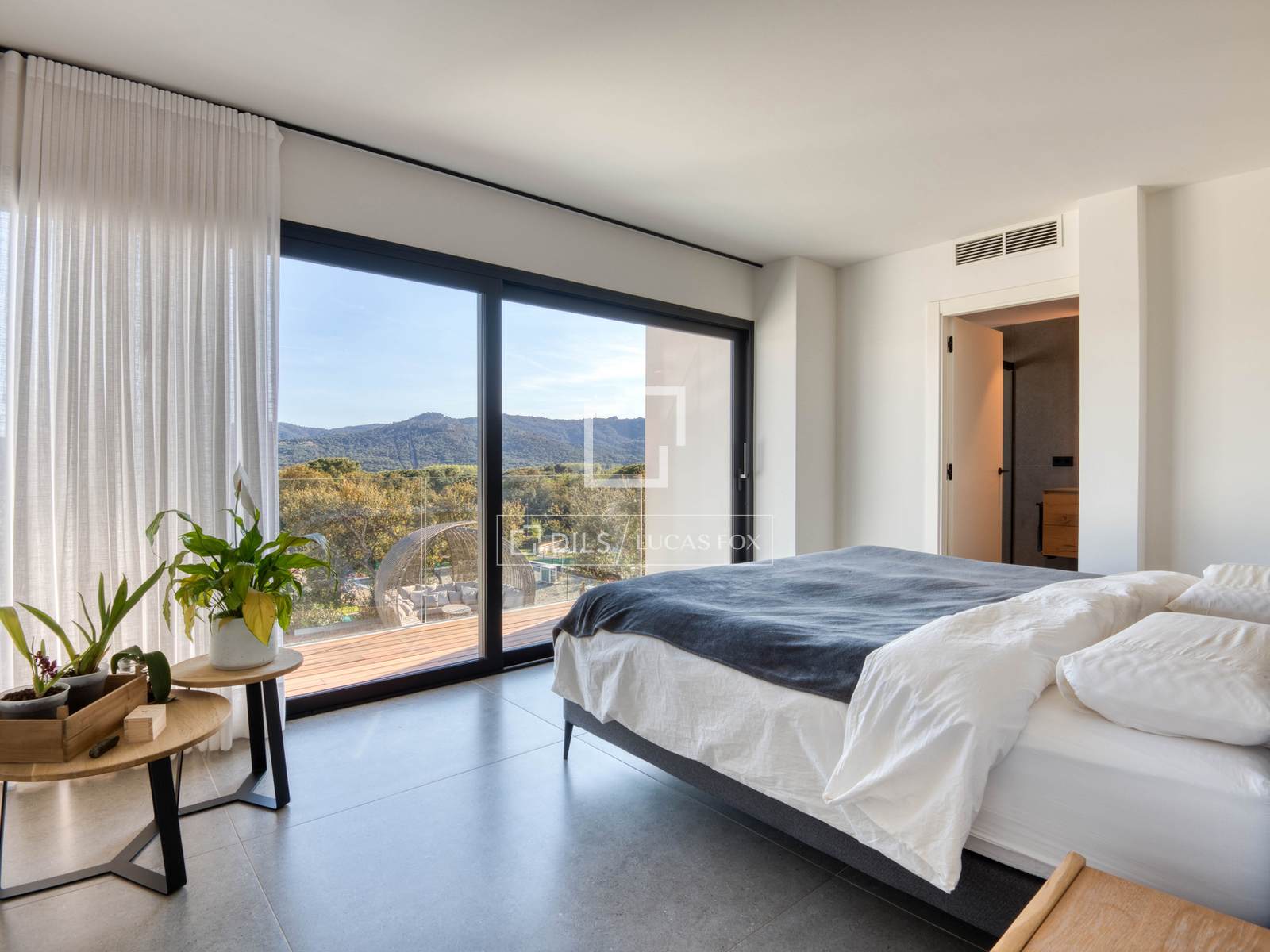 — Obergeschoss: Master-Suite mit Bad und Ankleidezimmer, zweite Suite mit Bad und Ankleidezimmer, beide mit Zugang zu einer großen privaten Terrasse mit freiem Bergblick, und ein zusätzliches Schlafzimmer, das als Büro genutzt wird.