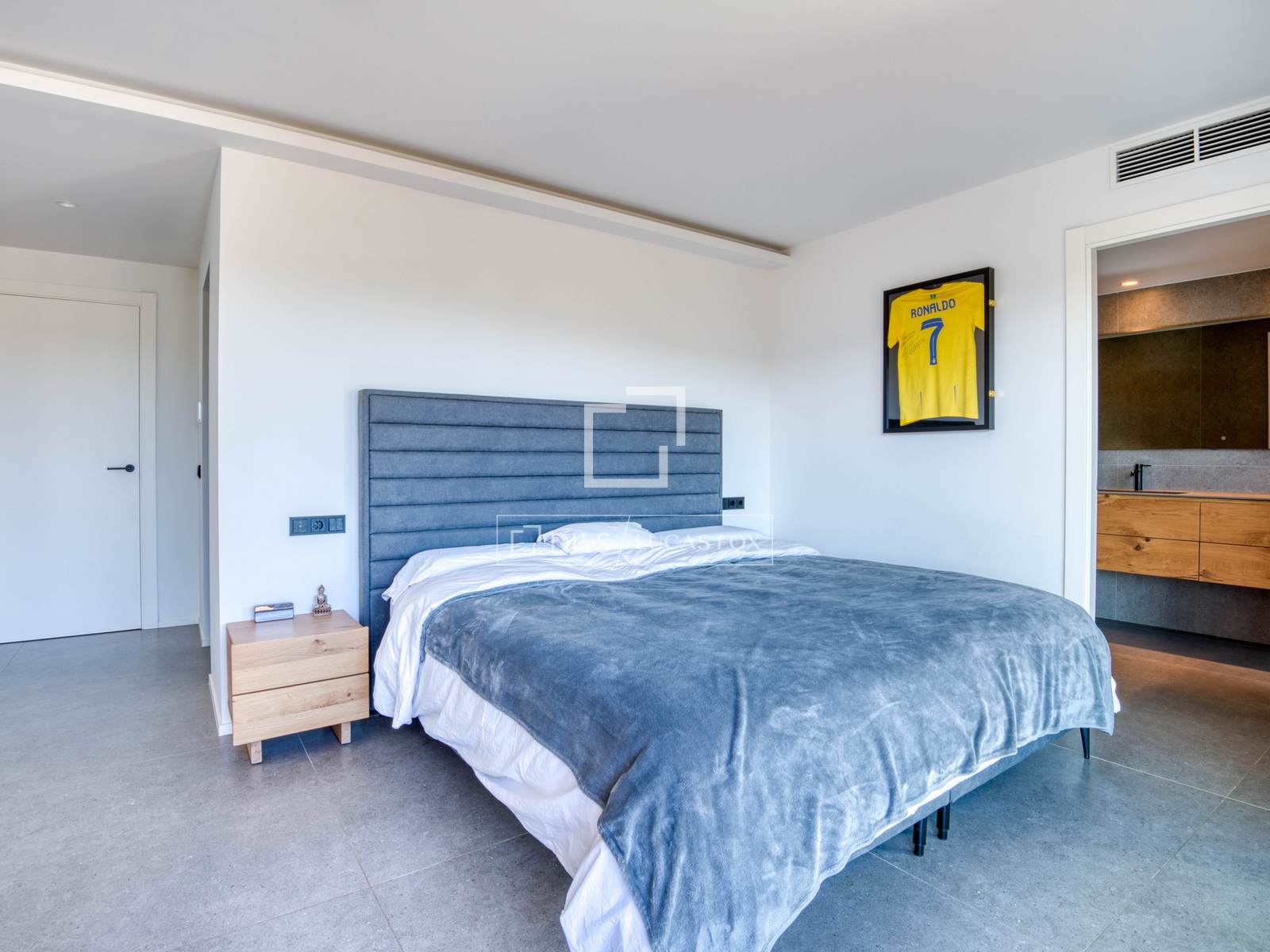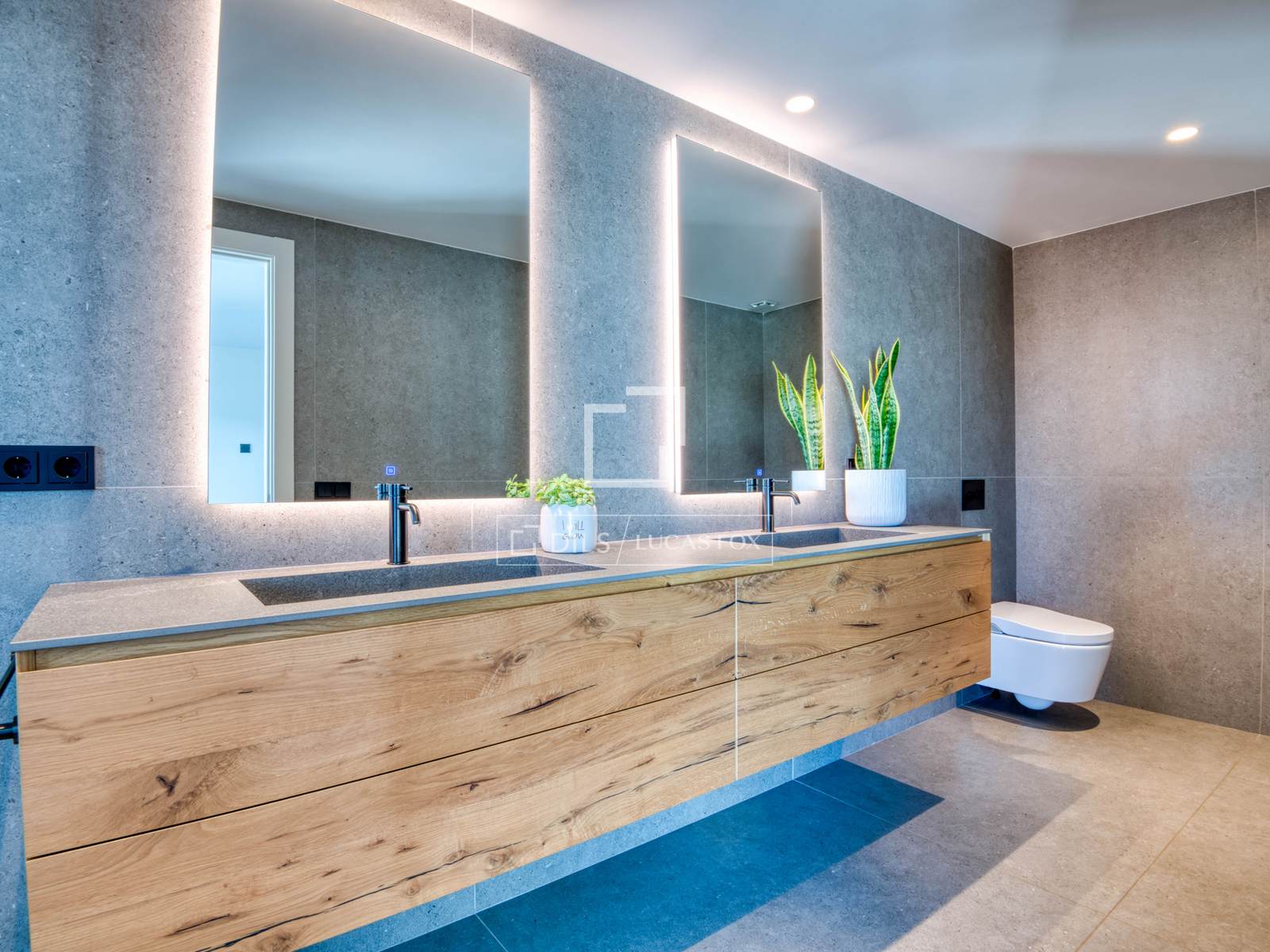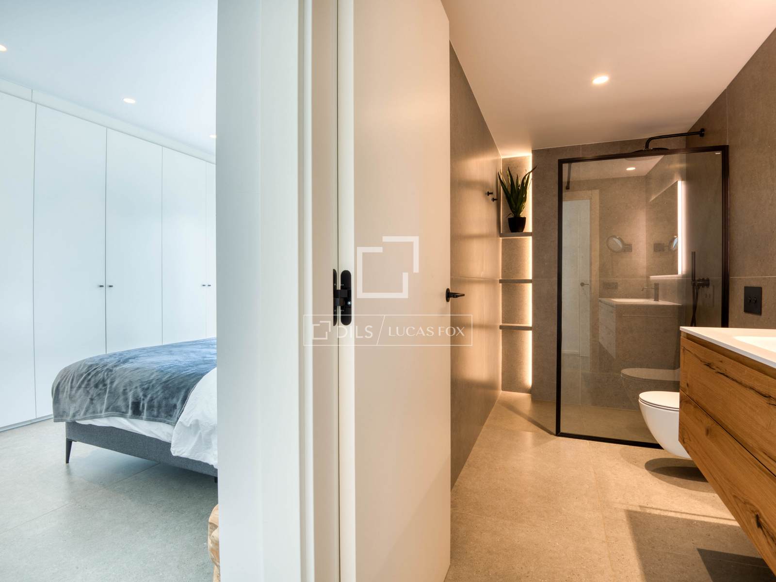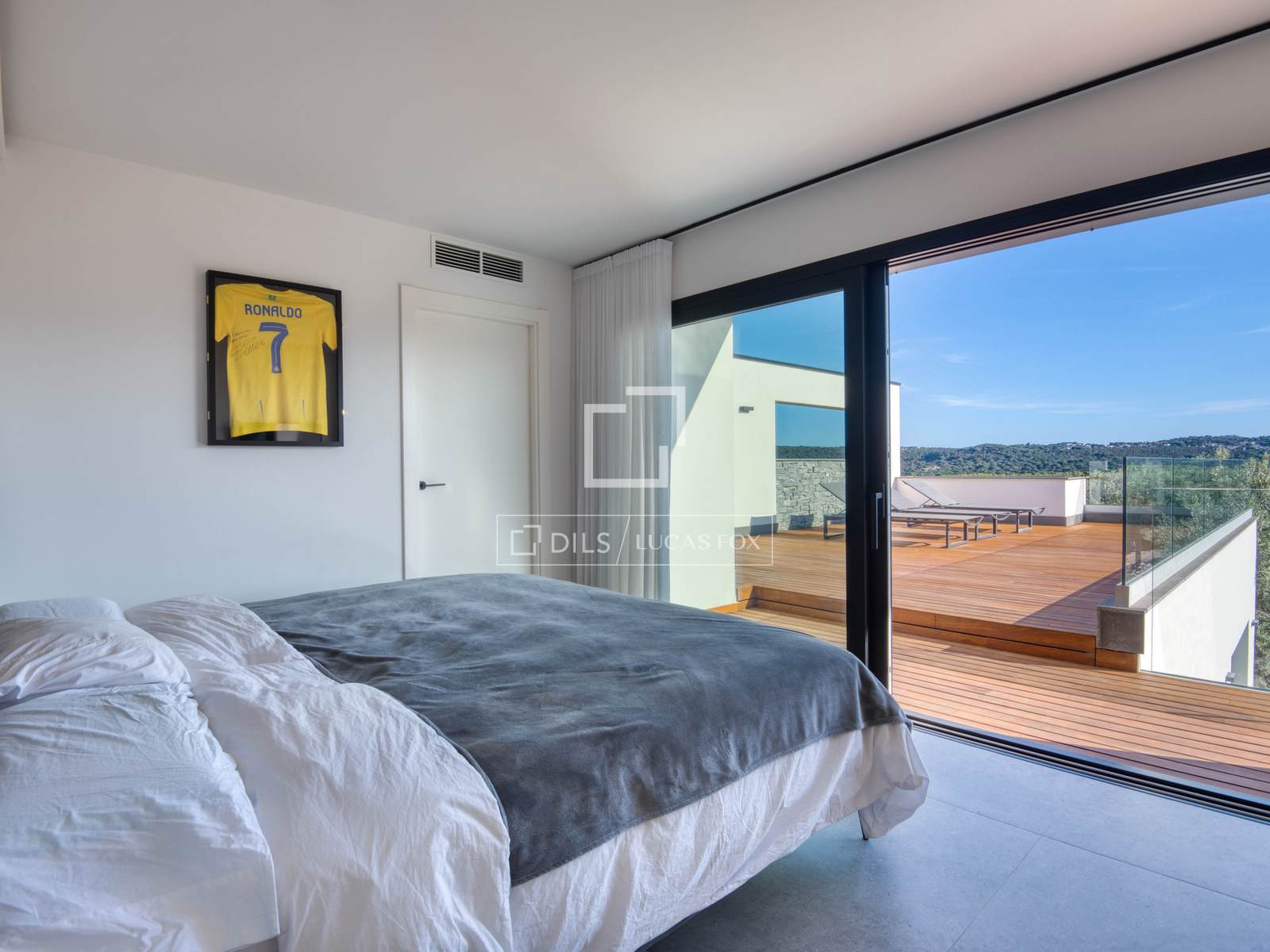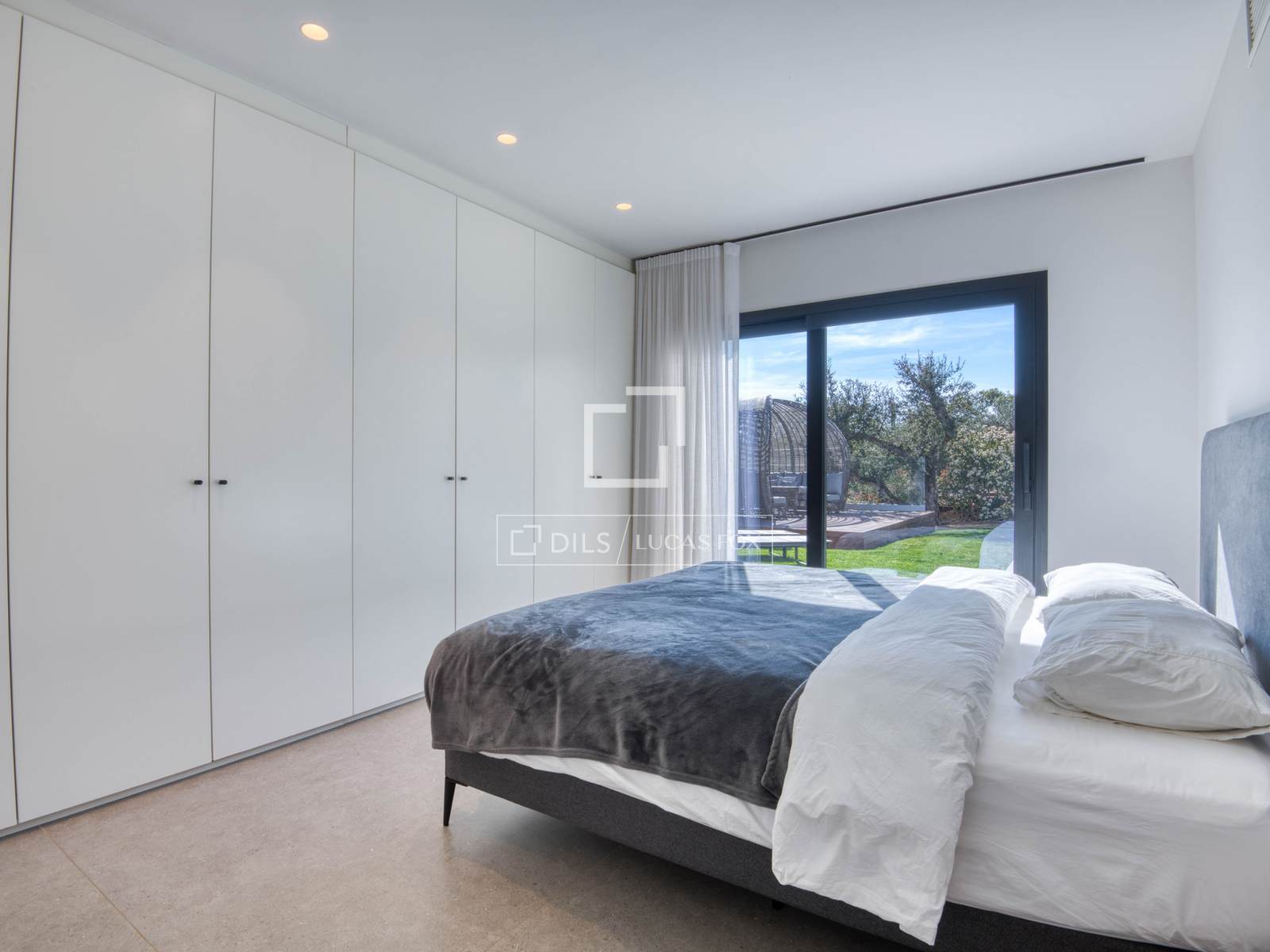 — Obergeschoss: Master-Suite mit Bad und Ankleidezimmer, zweite Suite mit Bad und Ankleidezimmer, beide mit Zugang zu einer großen privaten Terrasse mit freiem Bergblick, und ein zusätzliches Schlafzimmer, das als Büro genutzt wird.