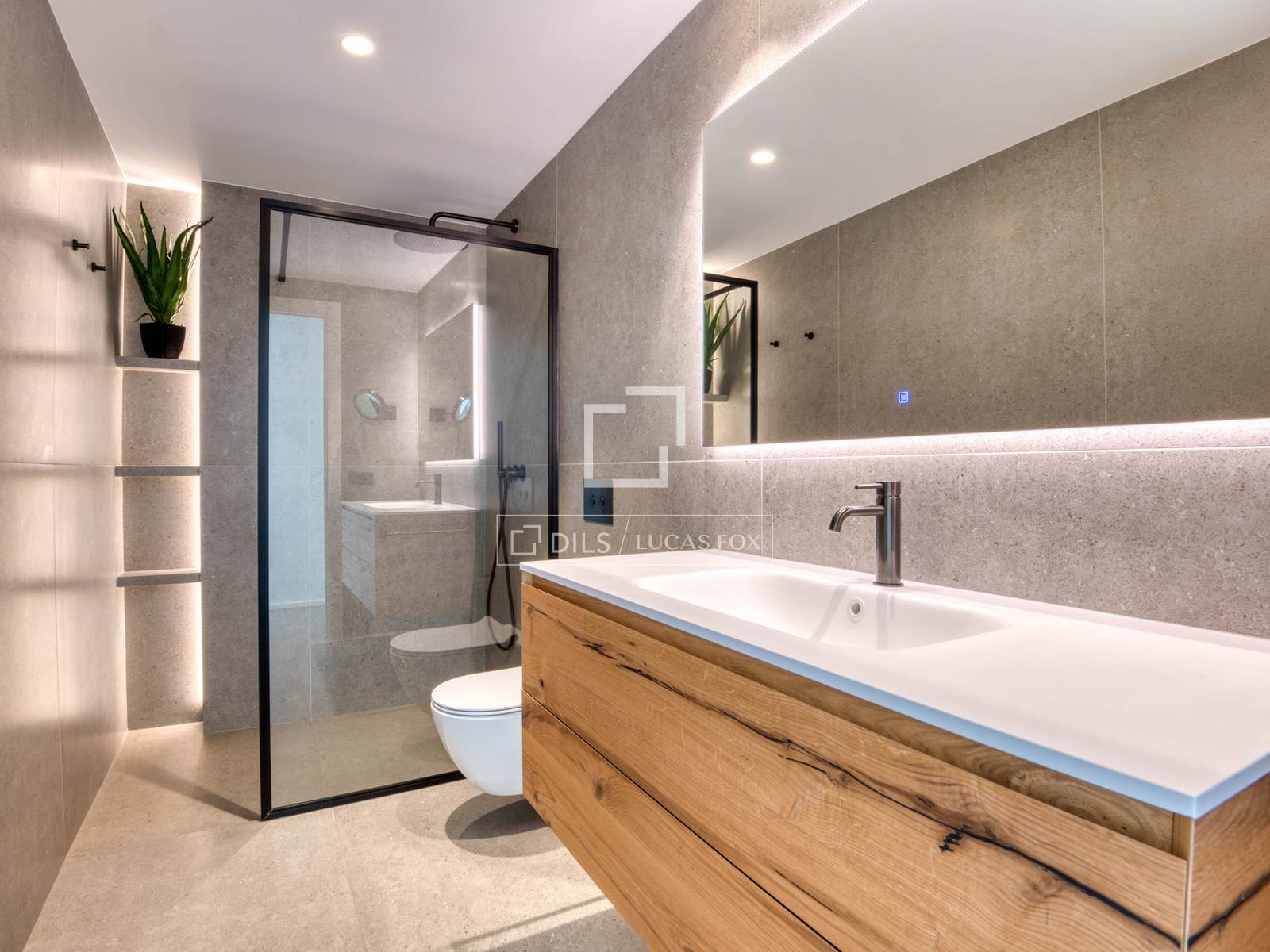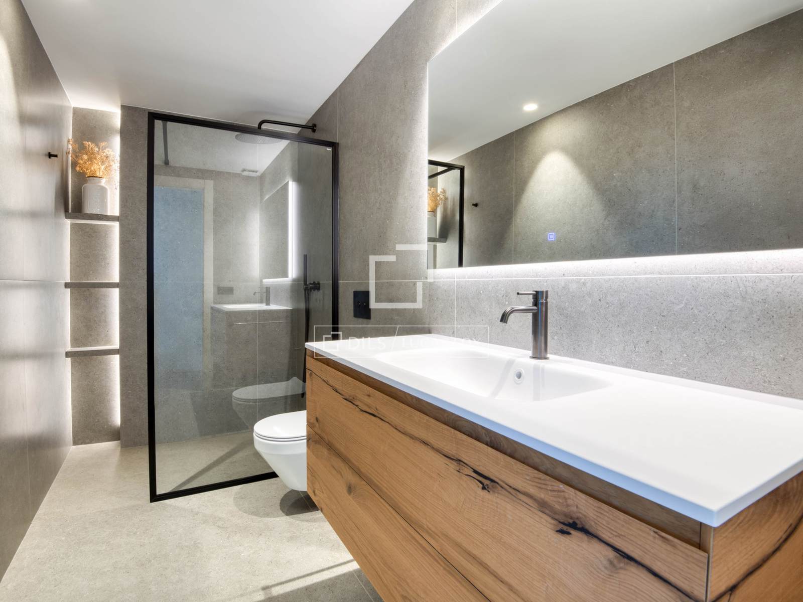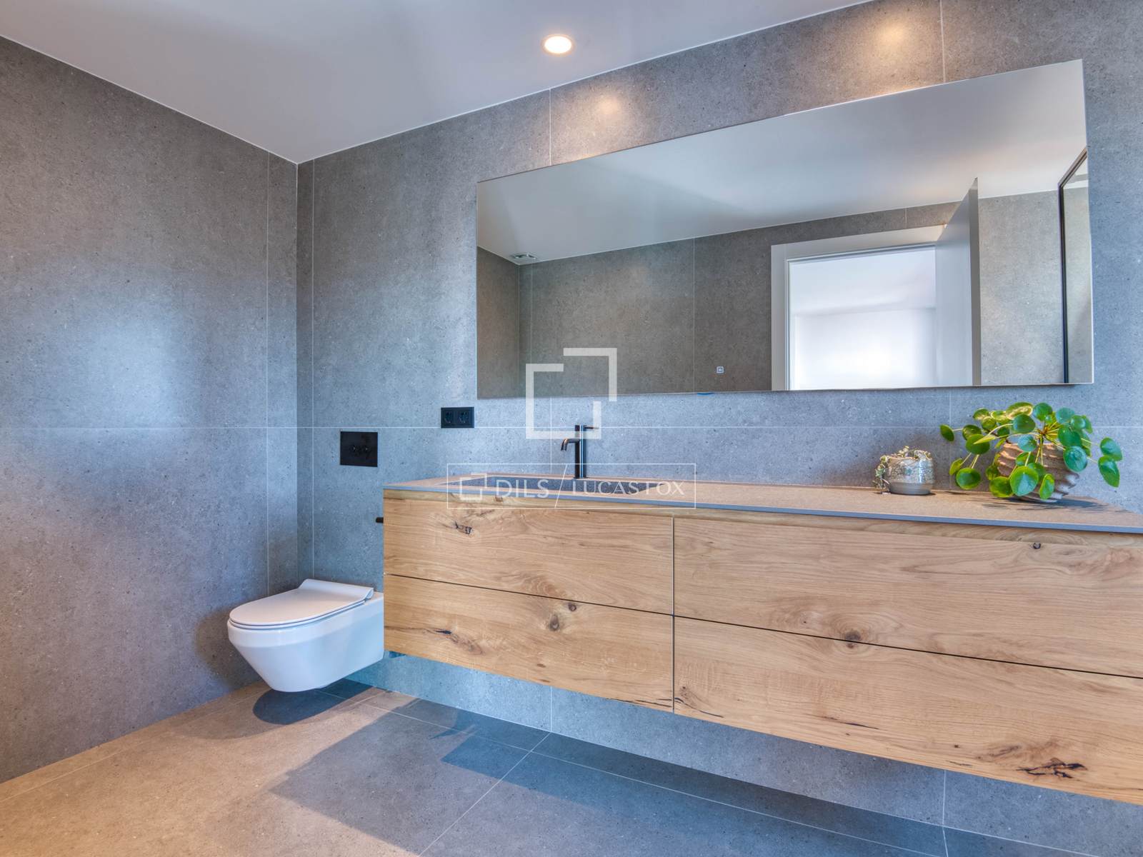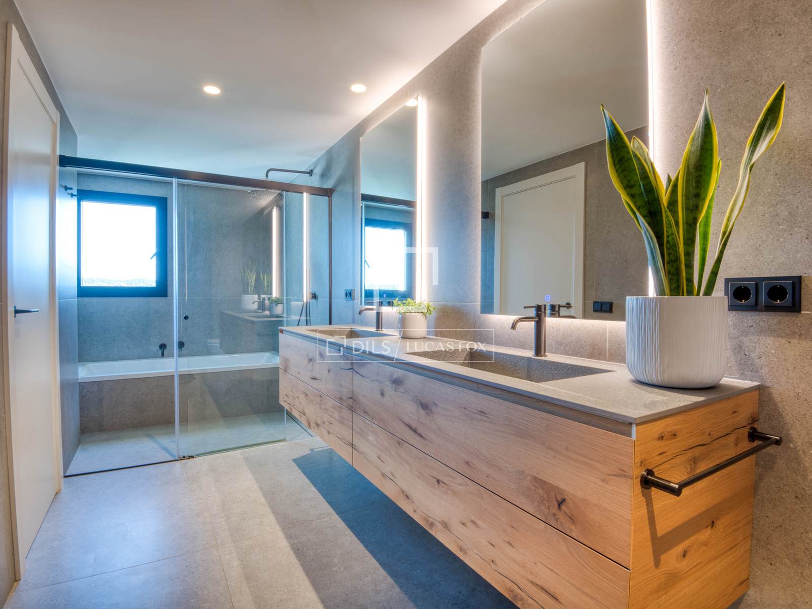 — Obergeschoss: Master-Suite mit Bad und Ankleidezimmer, zweite Suite mit Bad und Ankleidezimmer, beide mit Zugang zu einer großen privaten Terrasse mit freiem Bergblick, und ein zusätzliches Schlafzimmer, das als Büro genutzt wird.