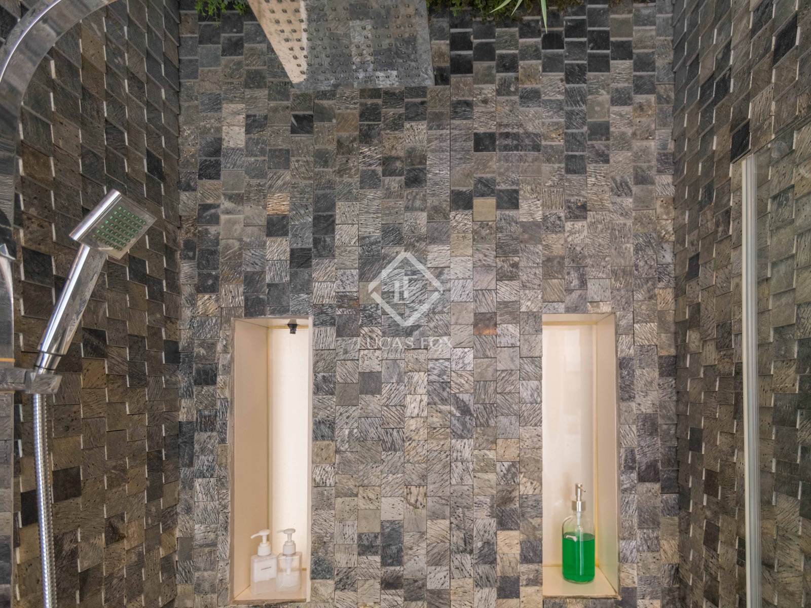Beim Betreten des Hauses empfängt Sie der offene Wohnbereich, der Wohnzimmer und Küche fließend miteinander verbindet. Hohe Decken schaffen ein großzügiges Raumgefühl, während große Fenster den ganzen Tag über für viel Tageslicht sorgen. Das modern eingerichtete Wohnzimmer bietet den idealen Rahmen zum Entspannen oder für gesellige Stunden. Die Küche ist mit hochwertigen Geräten und edlen Oberflächen ausgestattet. Ihr intelligentes Design maximiert den Platz und bietet elegante Schränke sowie großzügige Arbeitsflächen.