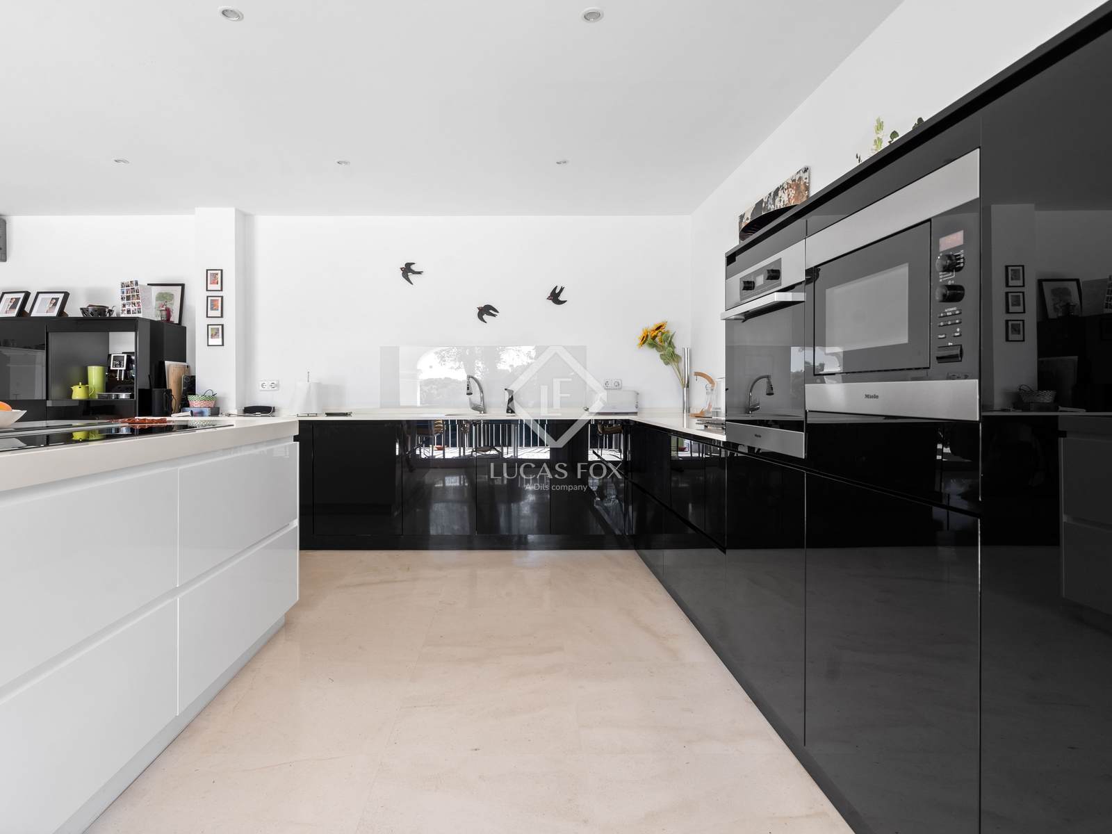 Im Erdgeschoss befindet sich eine einladende Eingangshalle, die zu einer modernen, voll ausgestatteten offenen Küche mit direktem Zugang zur überdachten Veranda führt. Diese Veranda verfügt über zwei separate Bereiche: einen Essbereich im Freien mit Grill und einen Chill-out-Bereich, ideal zum Entspannen, beide mit Blick auf den Pool und den Golfplatz. Auf derselben Etage befinden sich das geräumige und helle Wohnzimmer mit Zugang zum Garten sowie ein Gästebad und eine voll ausgestattete Waschküche.