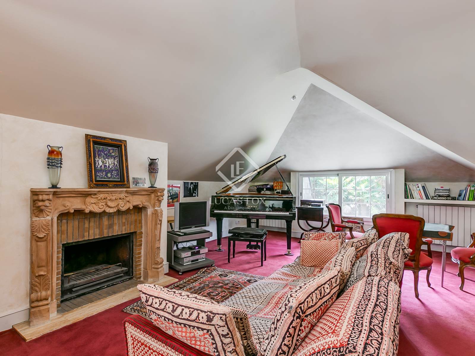 Im ersten Stock befinden sich vier unglaublich geräumige Schlafzimmer mit eigenem Bad und begehbaren Kleiderschränken. Zwei davon verfügen über ein privates Wohnzimmer. Ein gemütliches Wohnzimmer mit Kamin und Zugang zur Terrasse.