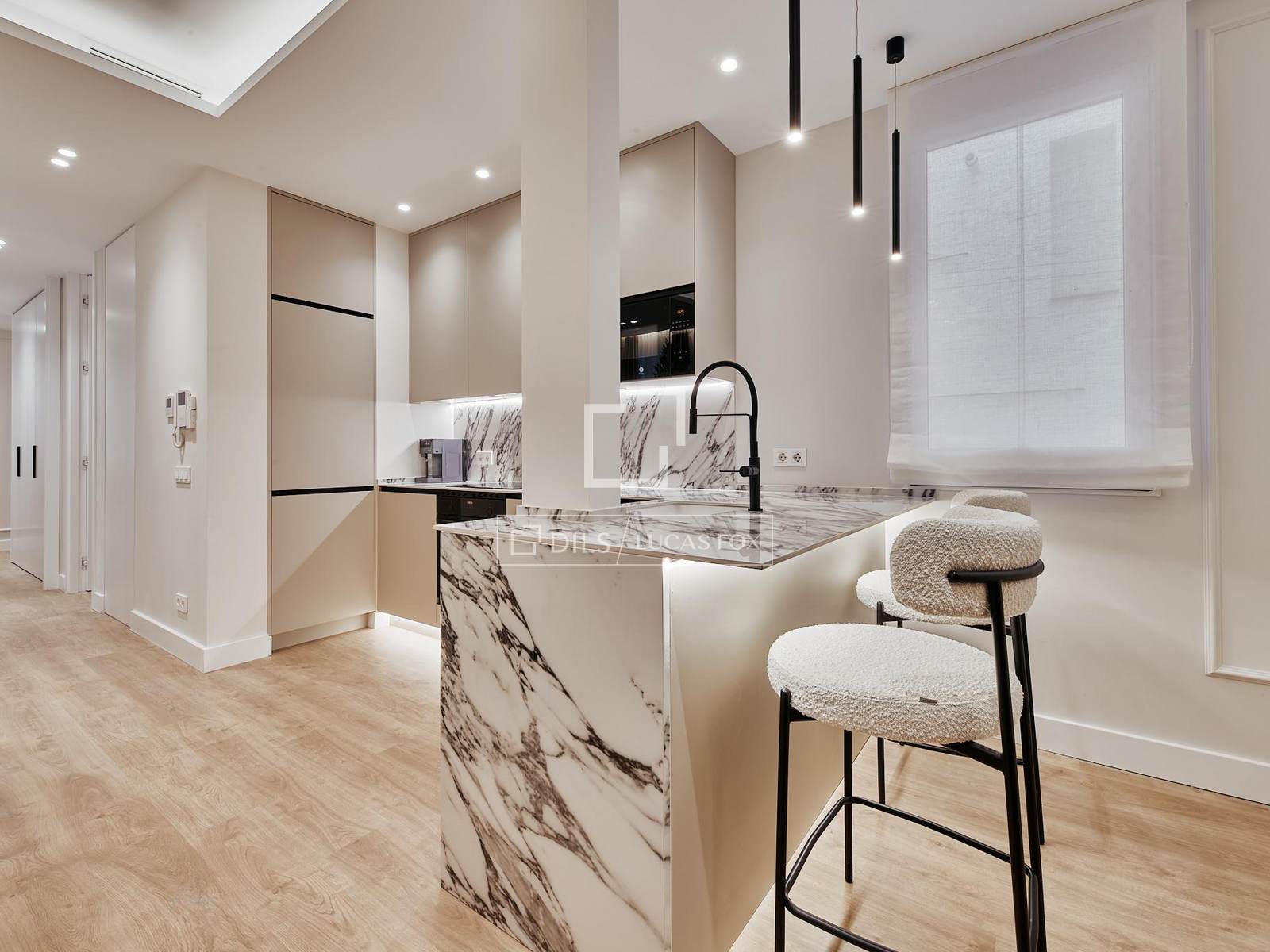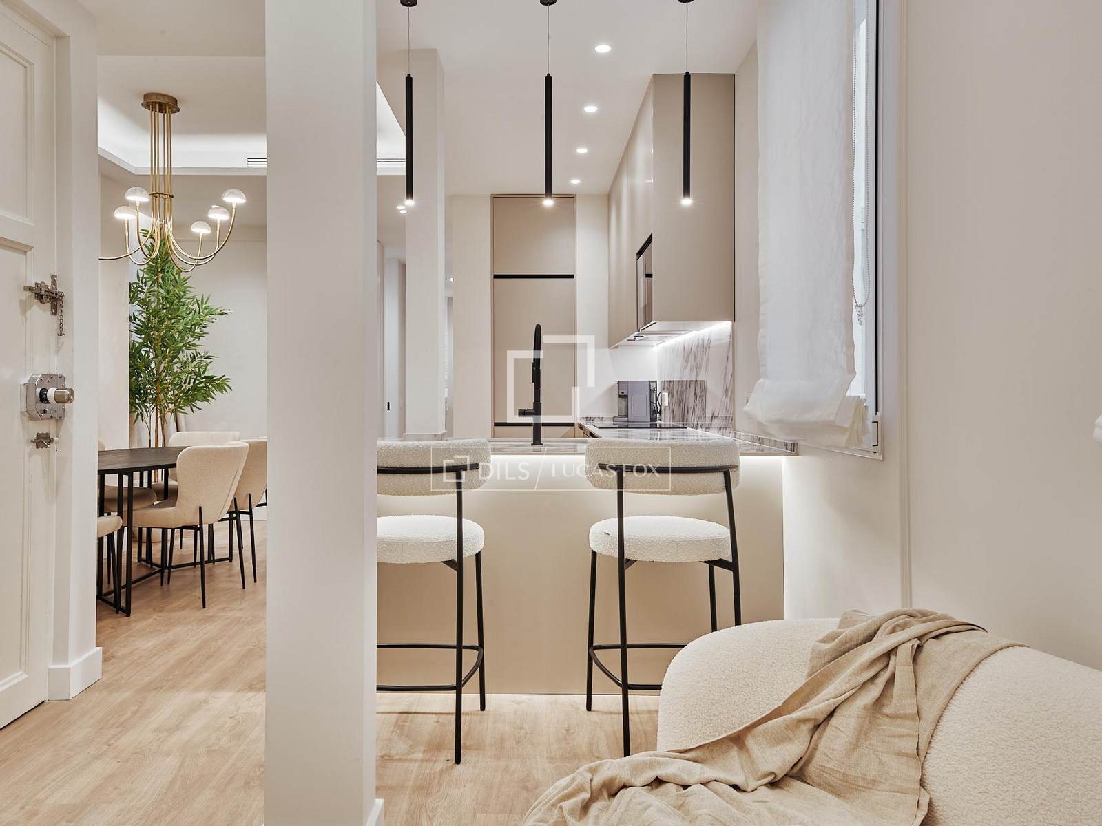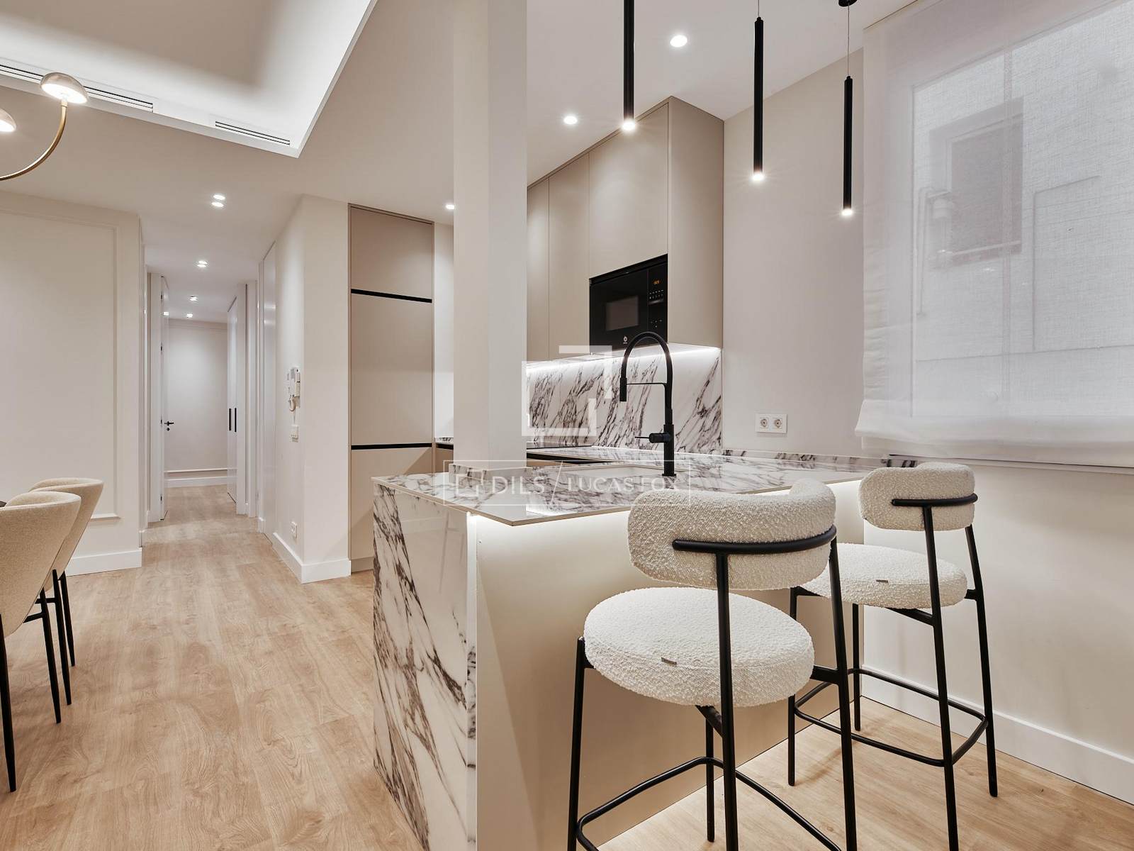 Die Wohnung befindet sich im ersten Stock und wurde nach einem Architektur- und Designprojekt des Studios Arctempus komplett renoviert. Sie bietet eine moderne, elegante und funktionale Raumaufteilung. Die Wohnung verfügt über drei geräumige Schlafzimmer, drei Badezimmer und einen hellen Wohnbereich mit Wohn- und Esszimmer sowie einer voll ausgestatteten Küche.