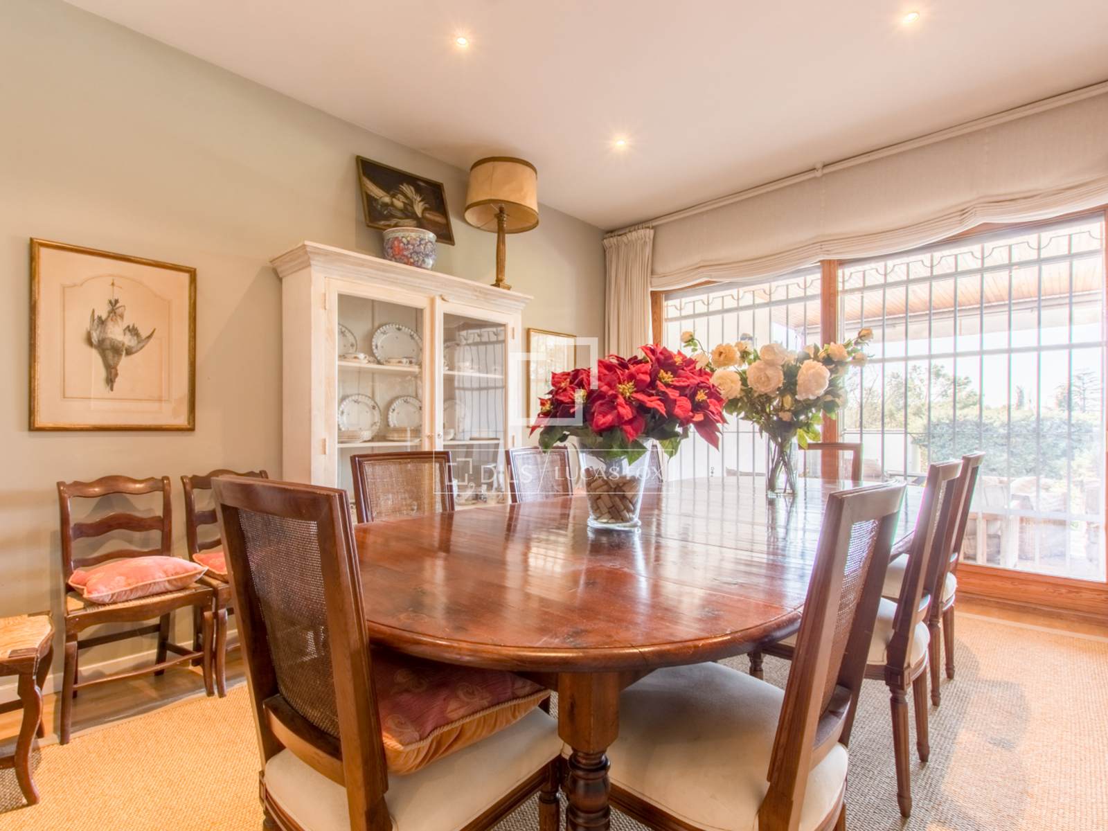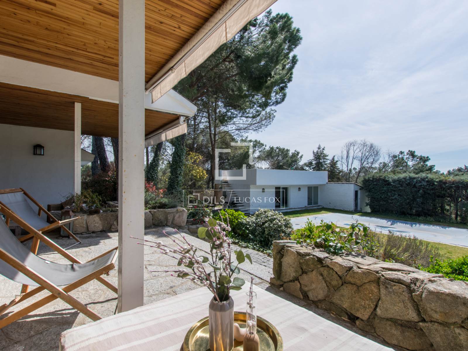 Beim Betreten des Hauses durch die Eingangstür gelangt man im Erdgeschoss in einen offenen Wohnbereich, der sich in drei durch wenige Stufen voneinander getrennte Bereiche gliedert und so ein harmonisches und dennoch individuelles Raumgefühl schafft. Alle Bereiche verfügen über große, nach Süden ausgerichtete Fenster mit Blick auf den Garten und bieten Zugang zur geräumigen Veranda und zum Swimmingpool. Ebenfalls auf dieser Etage befinden sich ein separates Esszimmer, eine große Küche mit Frühstücksbereich, vier Schlafzimmer, drei Badezimmer, ein Gäste-WC, ein Fernsehzimmer und ein Ankleidezimmer.