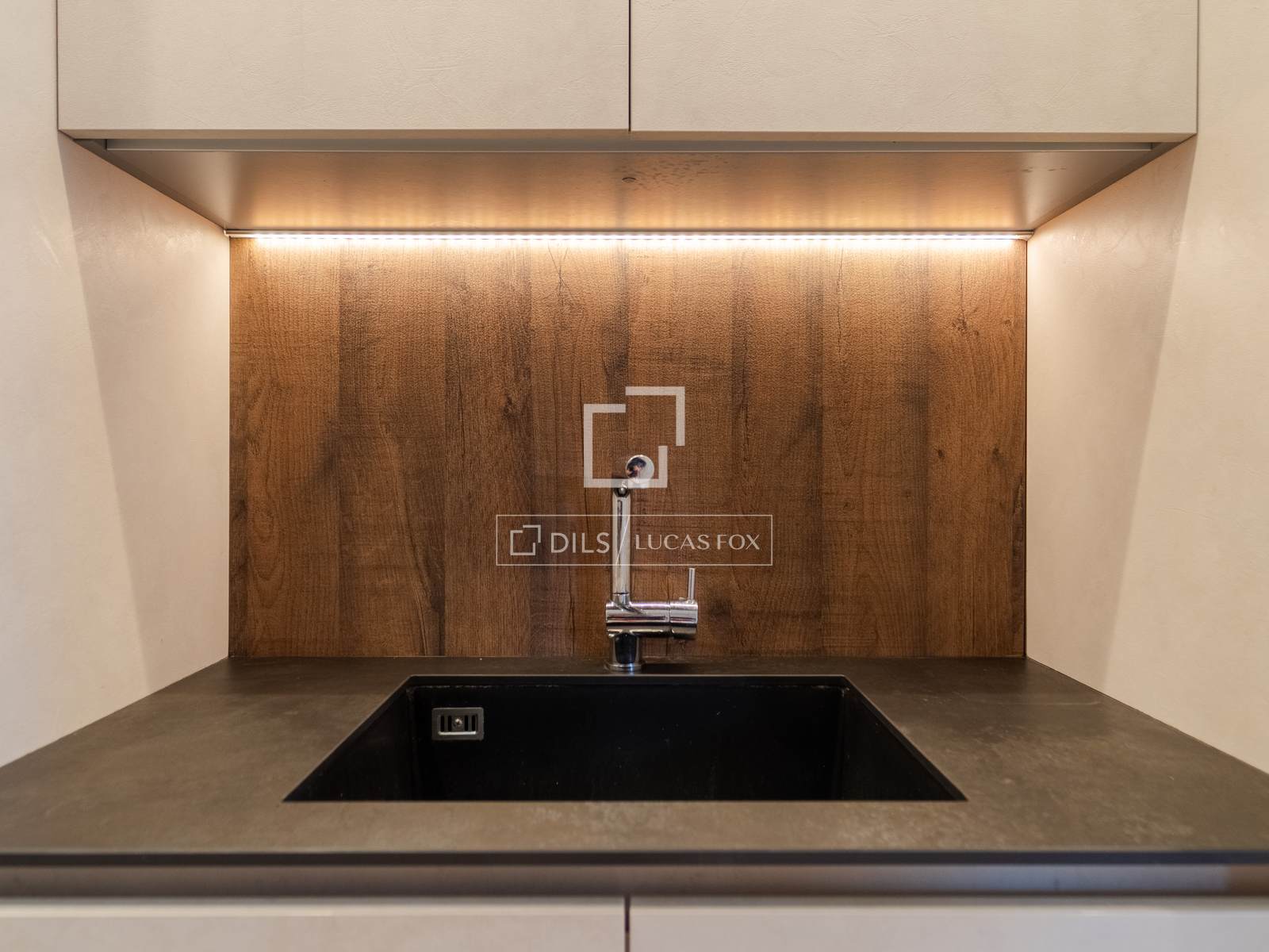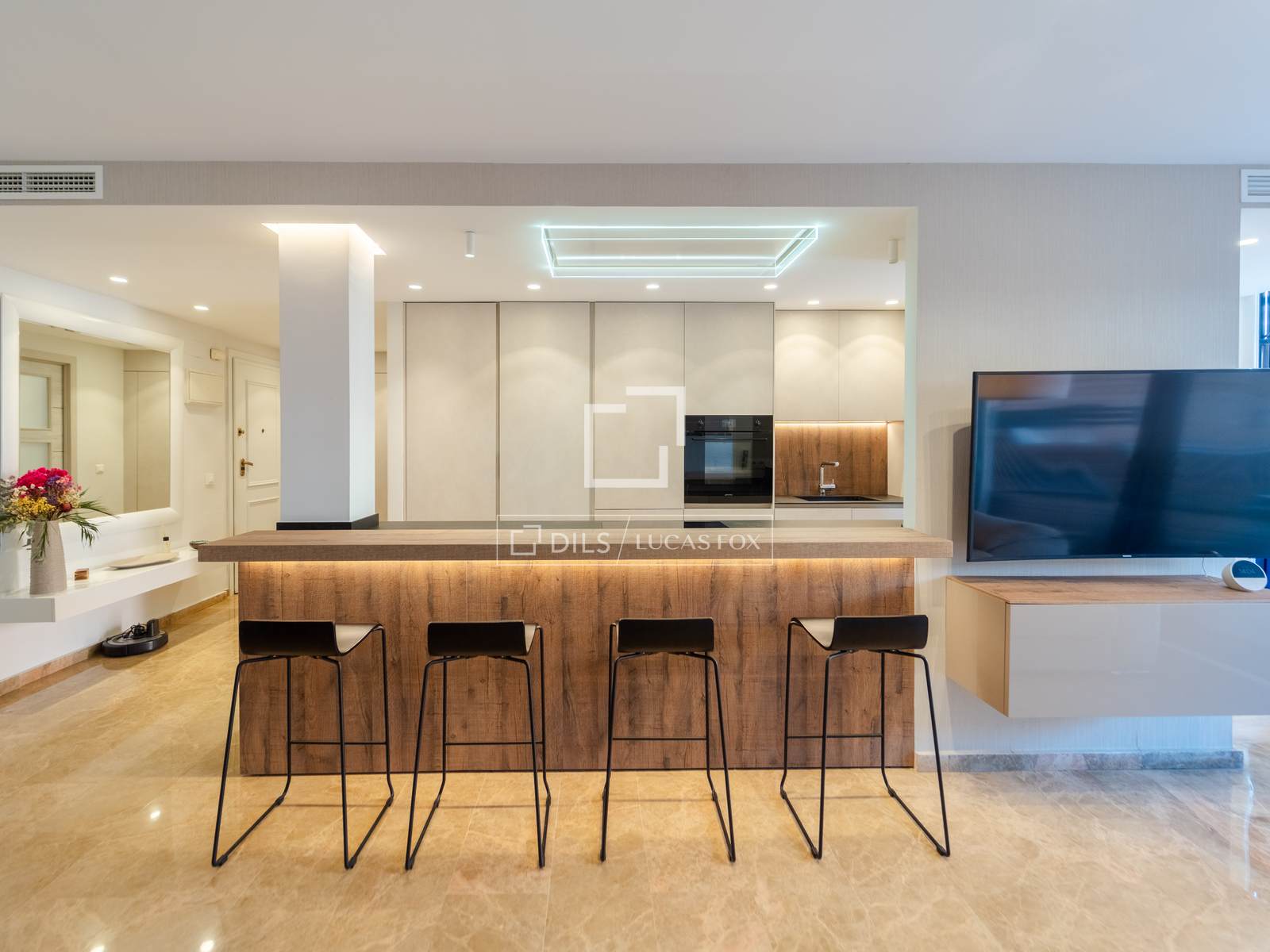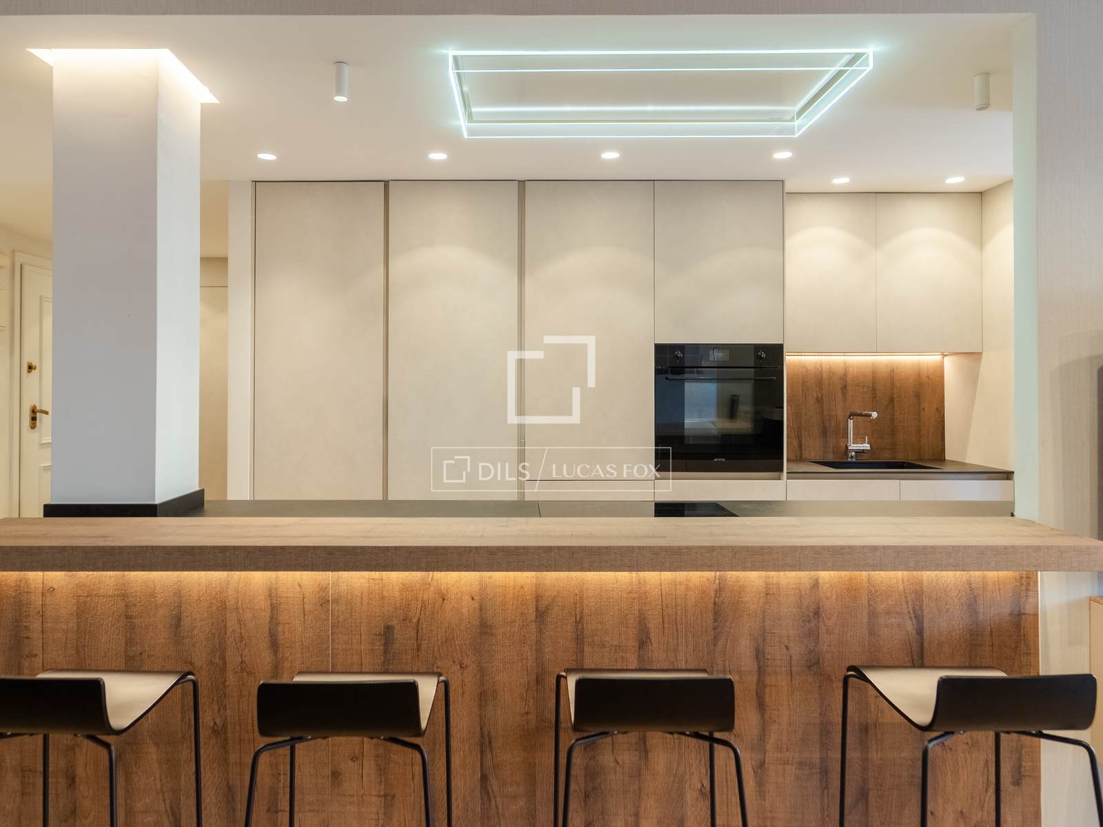 - Integrierte Küche/Büro, ausgestattet mit Geräten und einer Bar mit Hockern