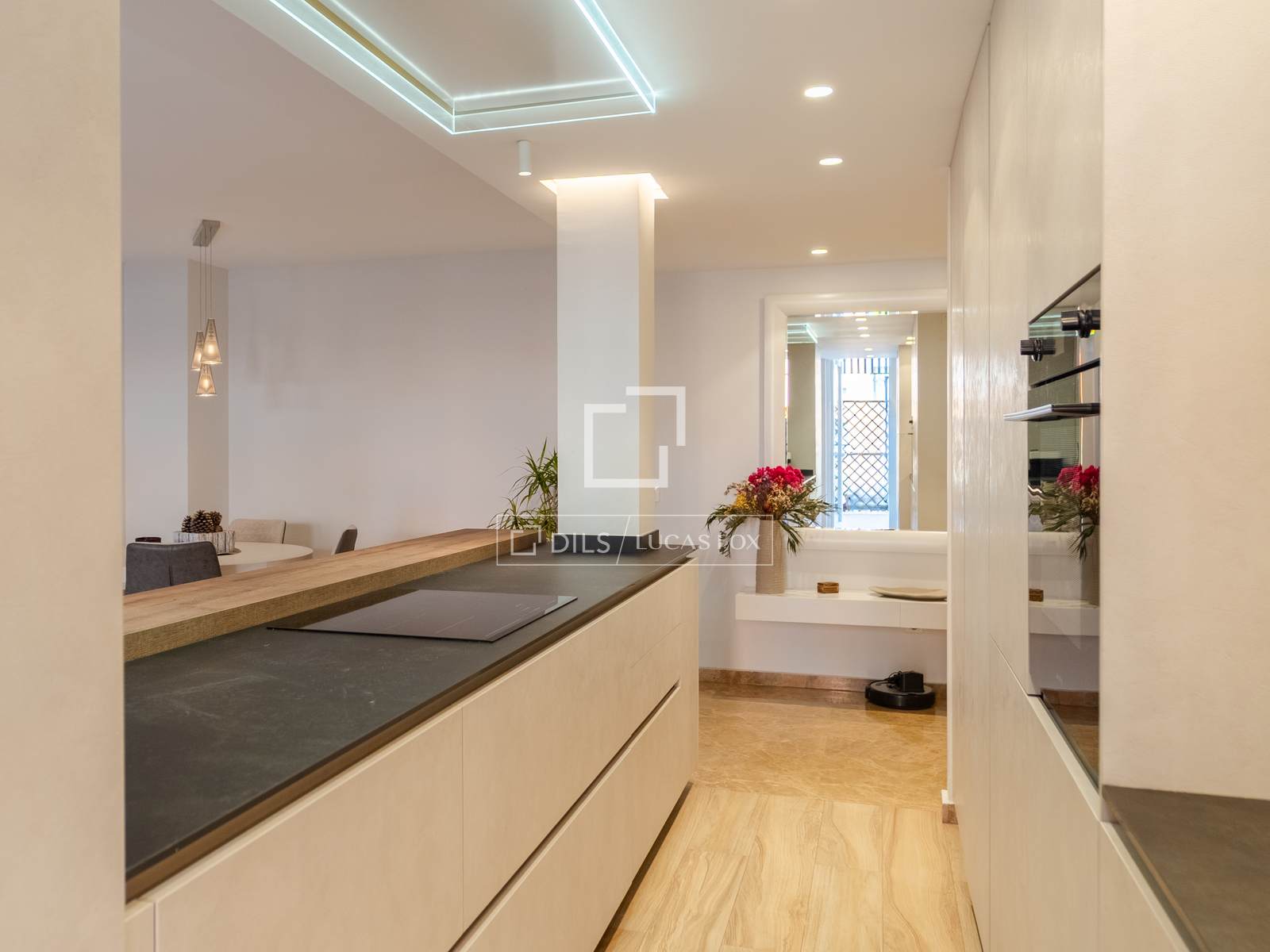 Beim Betreten des Hauses erwartet Sie ein geräumiges Wohn-Esszimmer mit integrierter, moderner Küche. Die Küche ist komplett mit Einbaugeräten ausgestattet und verfügt über eine Bar mit Barhockern – ideal, um beim Kochen Zeit mit der Familie zu verbringen.