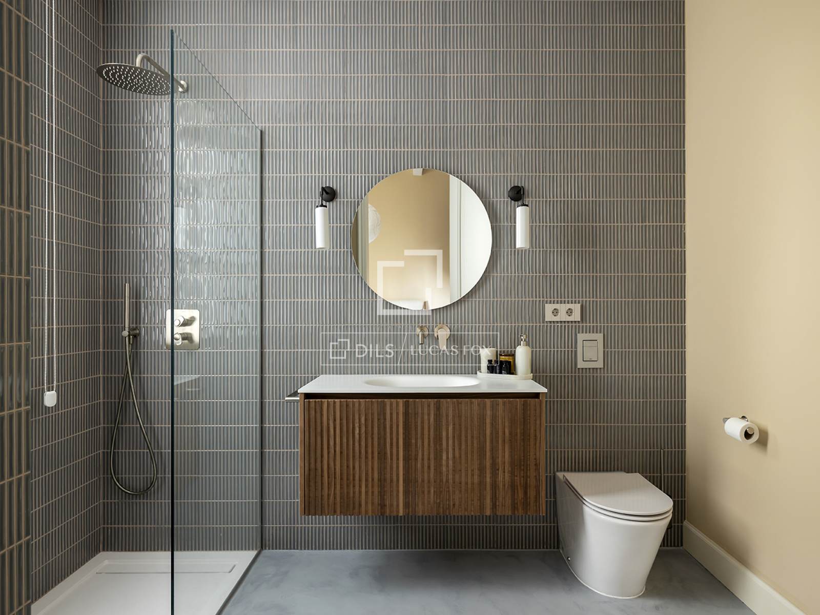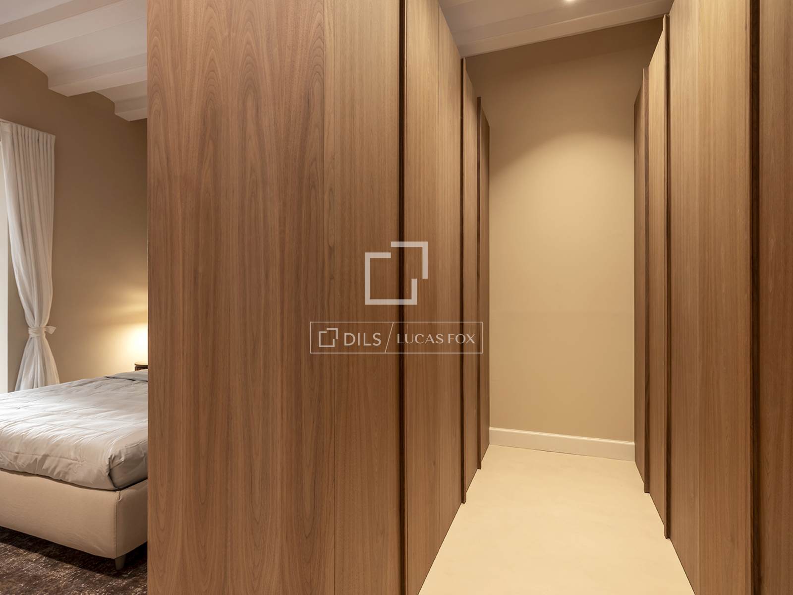 Die Wohnung verfügt über drei geräumige Doppelzimmer. Die besonders großzügig geschnittene Master-Suite bietet einen exklusiven begehbaren Kleiderschrank und Blick auf einen typischen Innenhof des Eixample-Viertels – eine intime, ruhige und entspannende Atmosphäre. Ein weiteres Schlafzimmer mit eigenem Bad sowie ein weiteres Doppelzimmer stehen ebenfalls zur Verfügung. Alle Schlafzimmer bieten ausreichend Stauraum. Insgesamt verfügt die Wohnung über drei elegant gestaltete Badezimmer sowie ein stilvolles Gäste-WC.